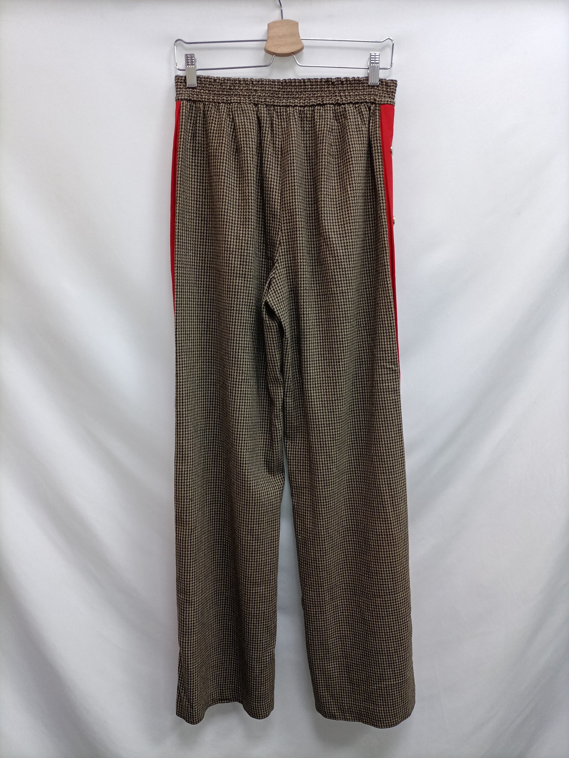 Pantalón ancho estilo Palazzo de pata de gallo en tonos marrones con raya lateral y botones. Cintura 36 cm Largo 116 cm