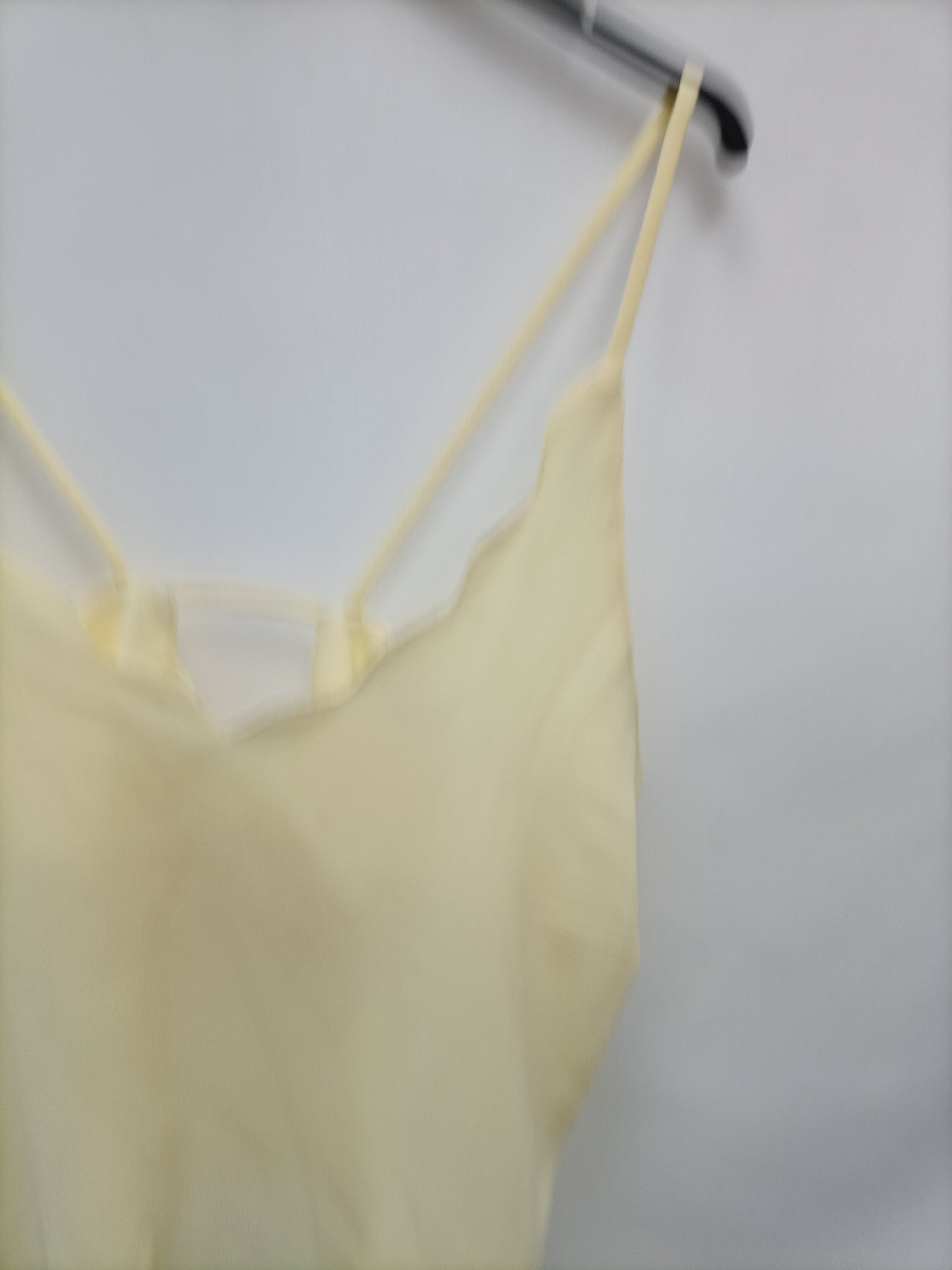 Top amarillo palo de tirantes con el escote ondulado. No elástico. De sisa a sisa 43 Largo 55 cm