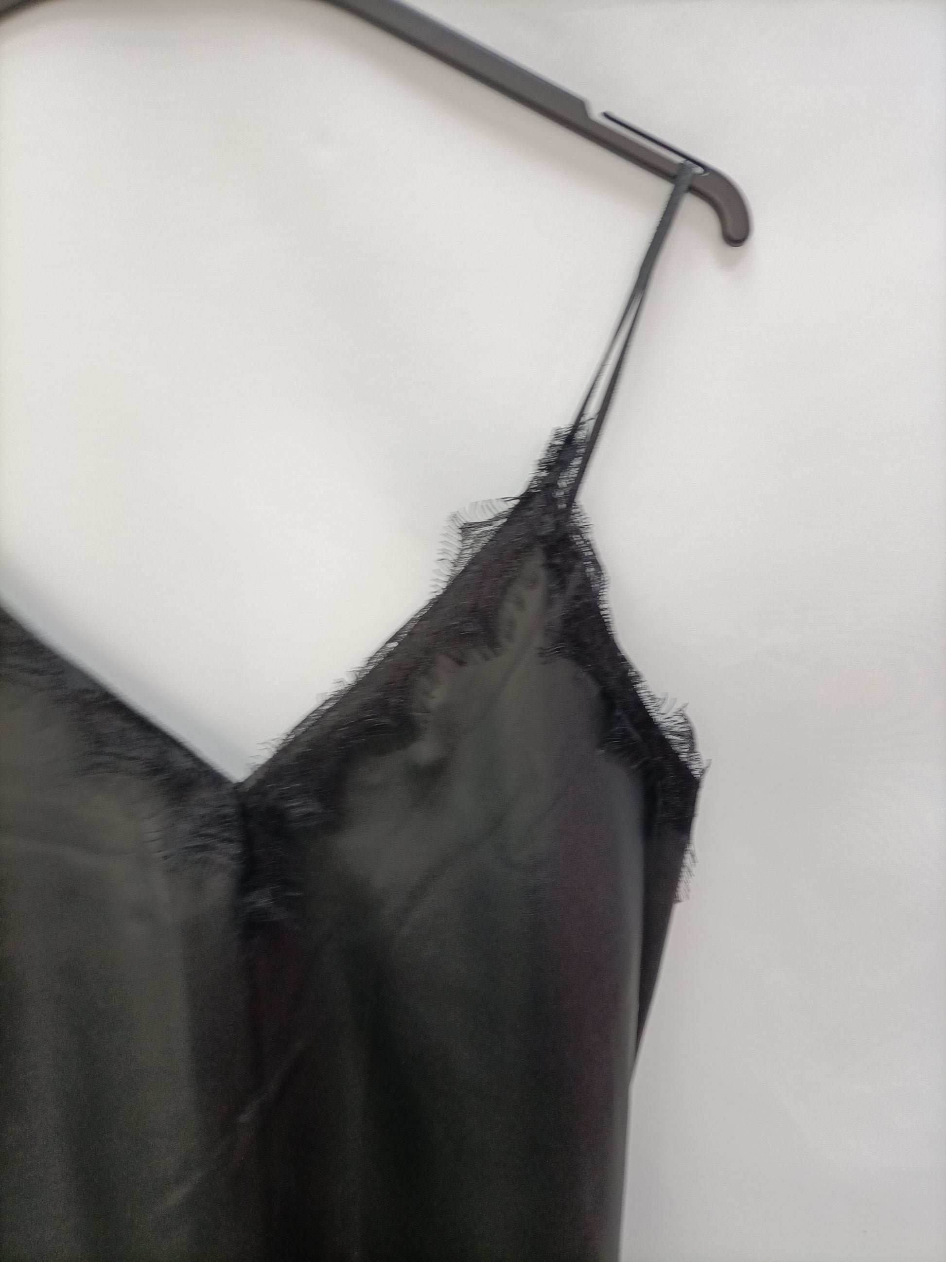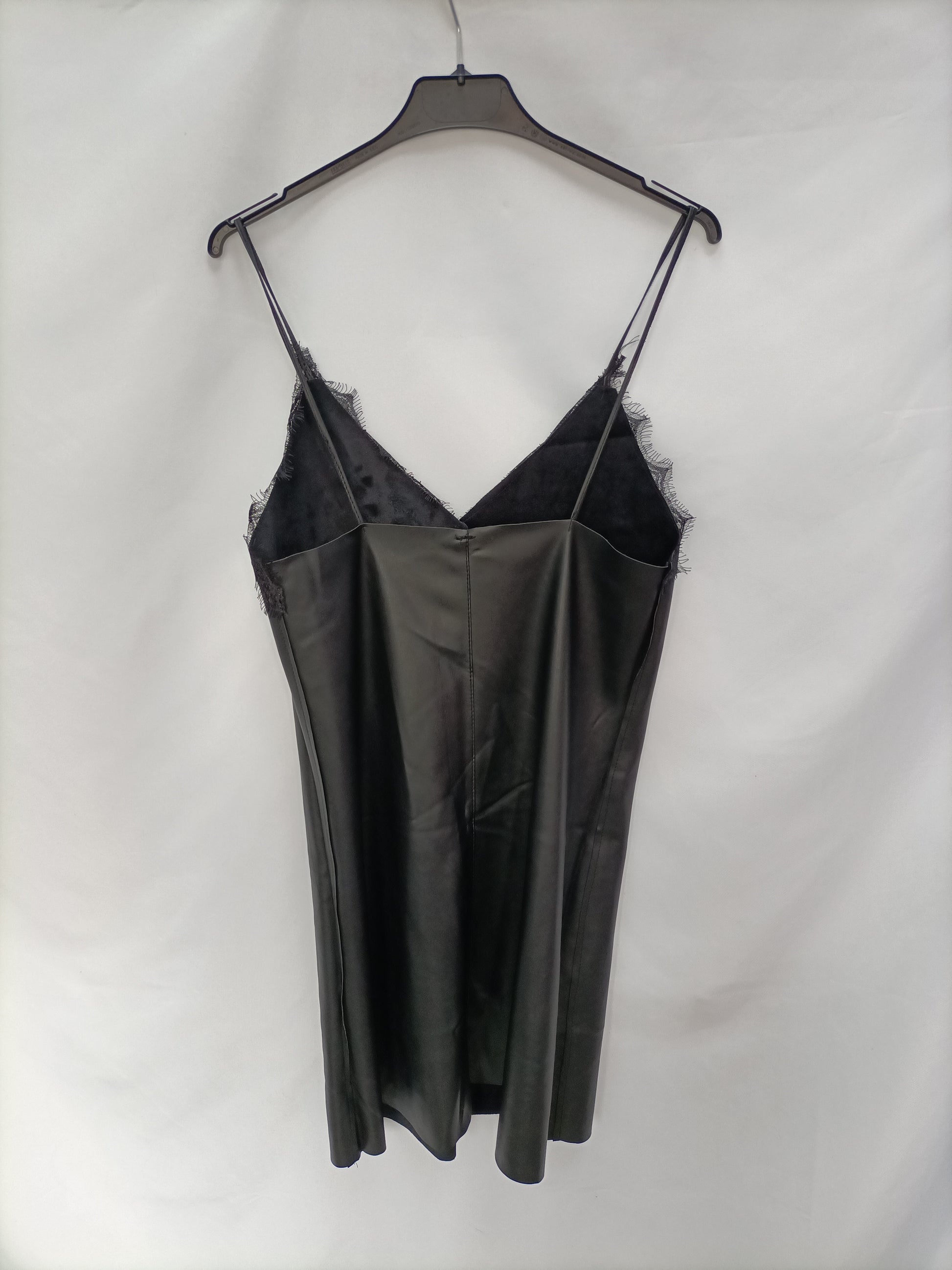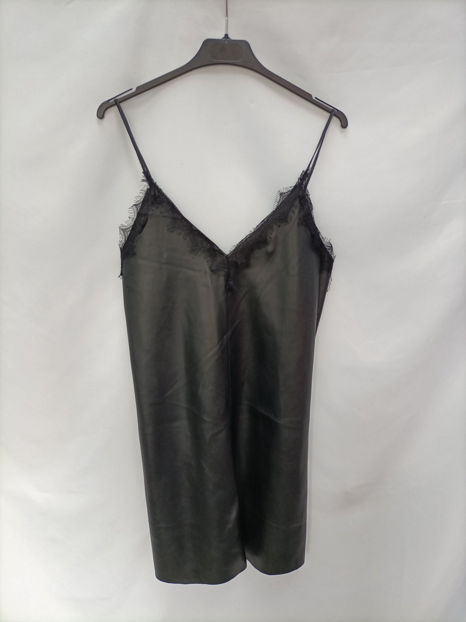 Vestido corto negro estilo lencero de polipiel con detalle de encaje en el Escote. Semielastico. de sisa a sisa 40 cm Largo 88 cm