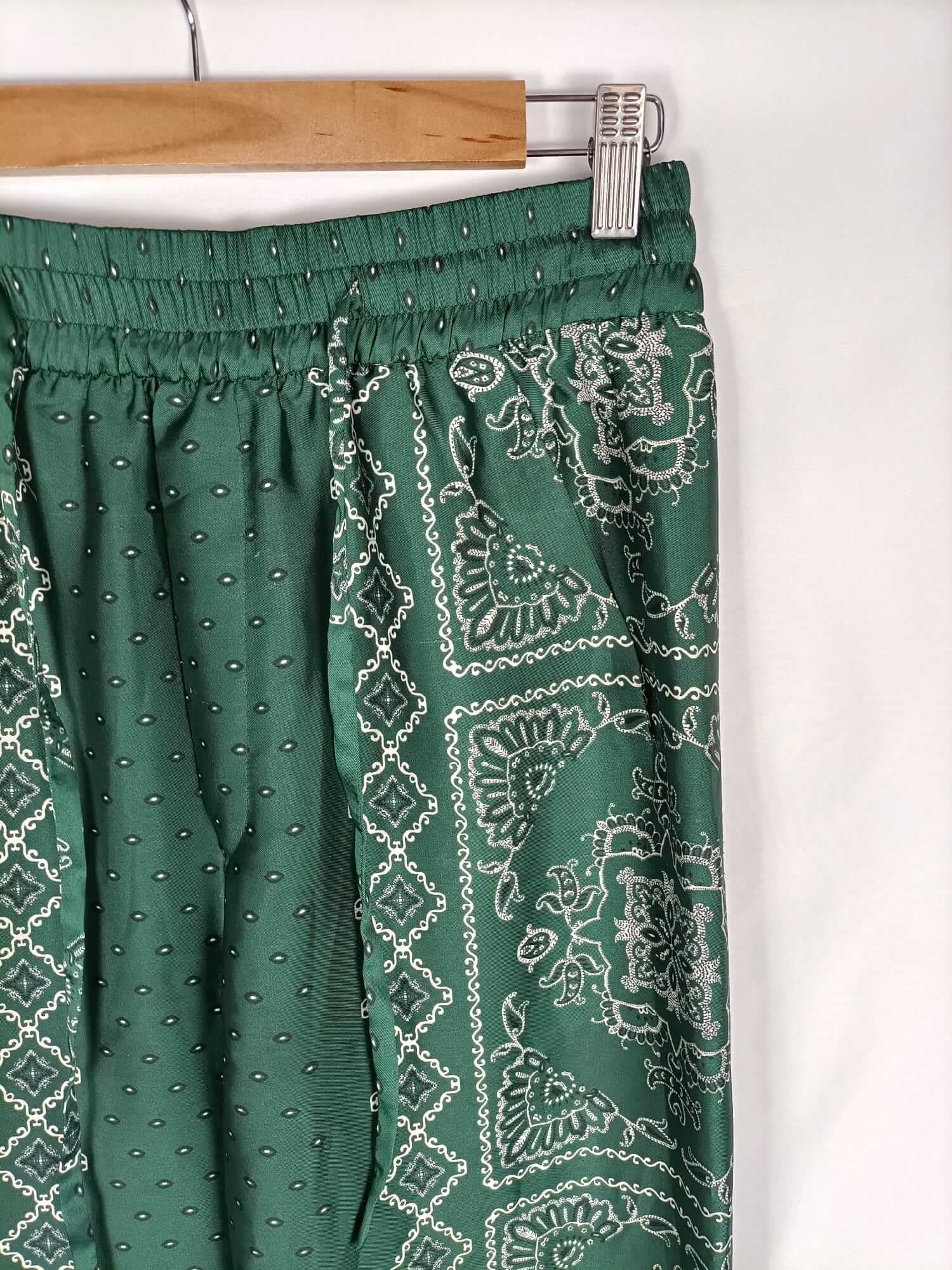 Zara.s. pantalón Palazzo verde con estampado de amebas en blanco. Fluido y finito. Cintura elástica ajustable. Largo 109 cm