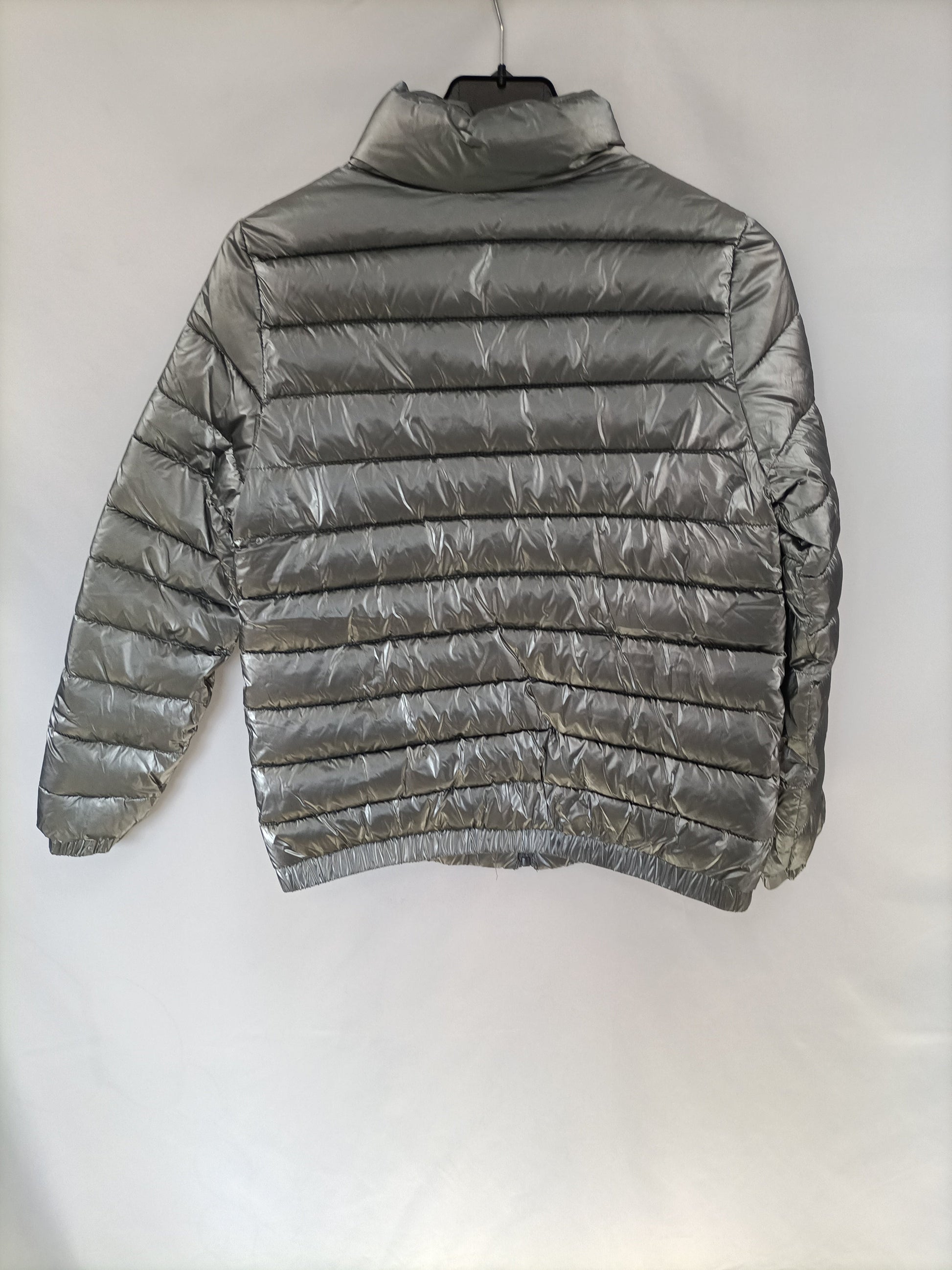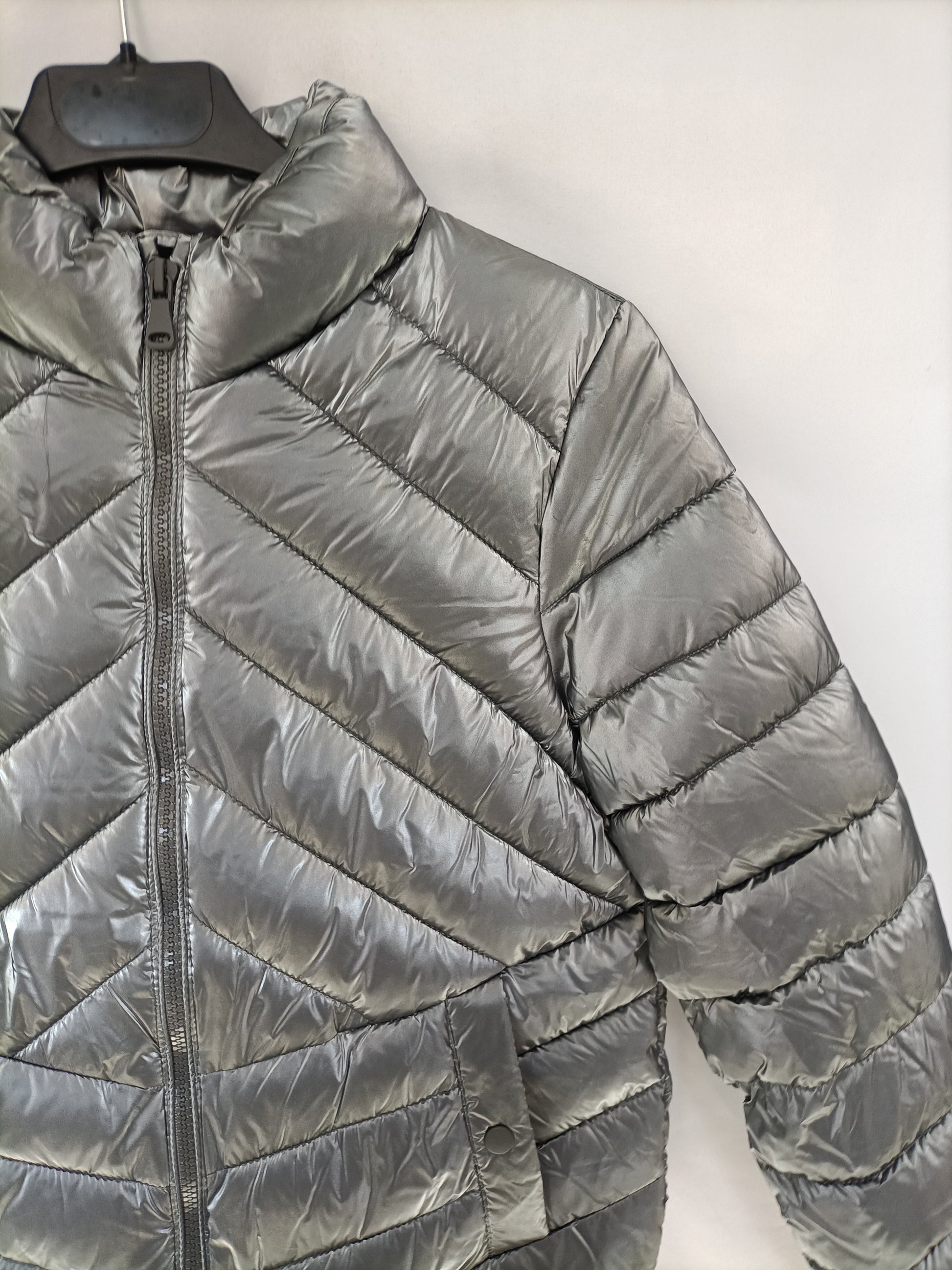 Plumas ligero plateado con cremallera. Cintura elástica. De sisa a sisa 43 cm largo 55 cm