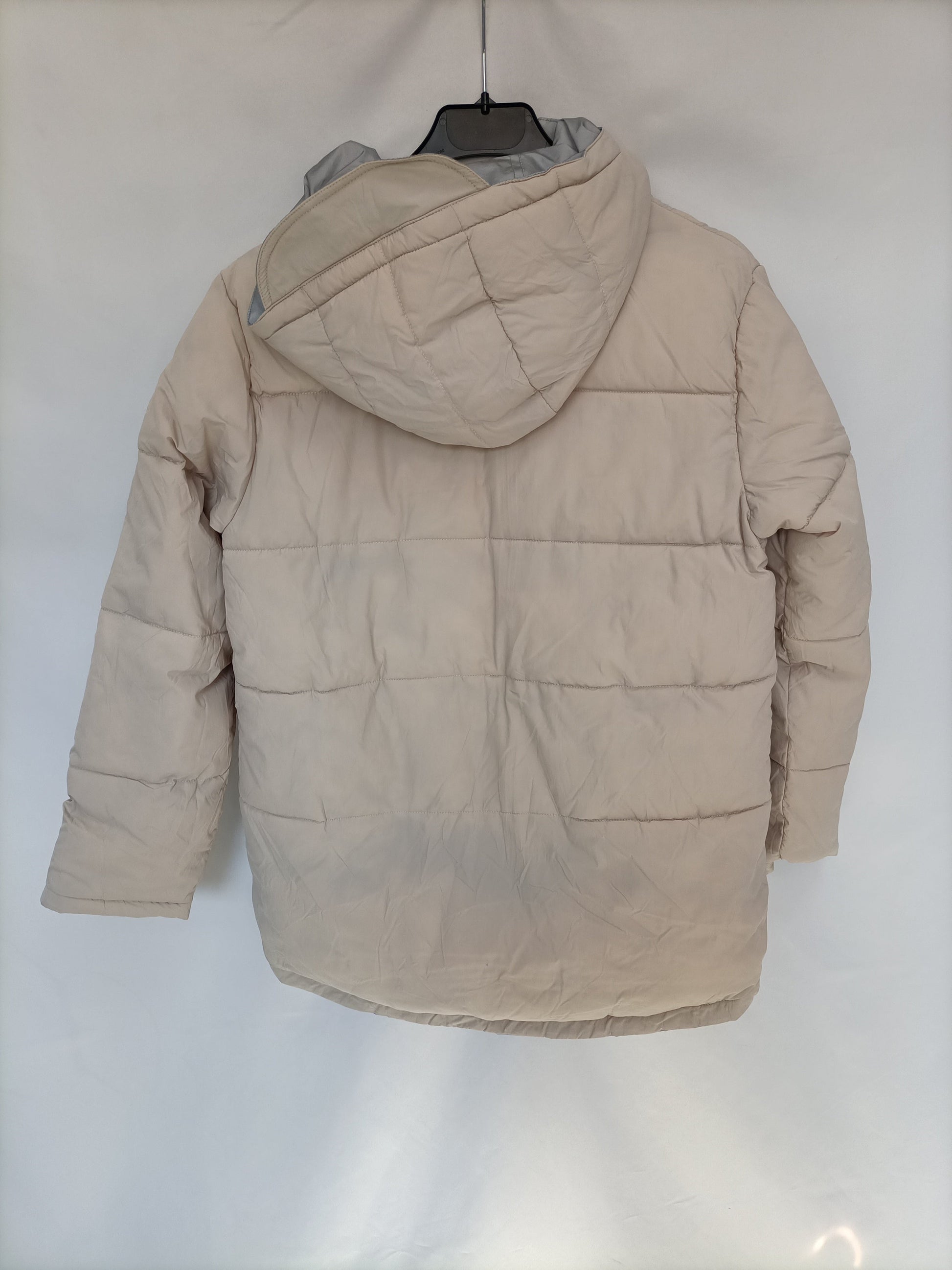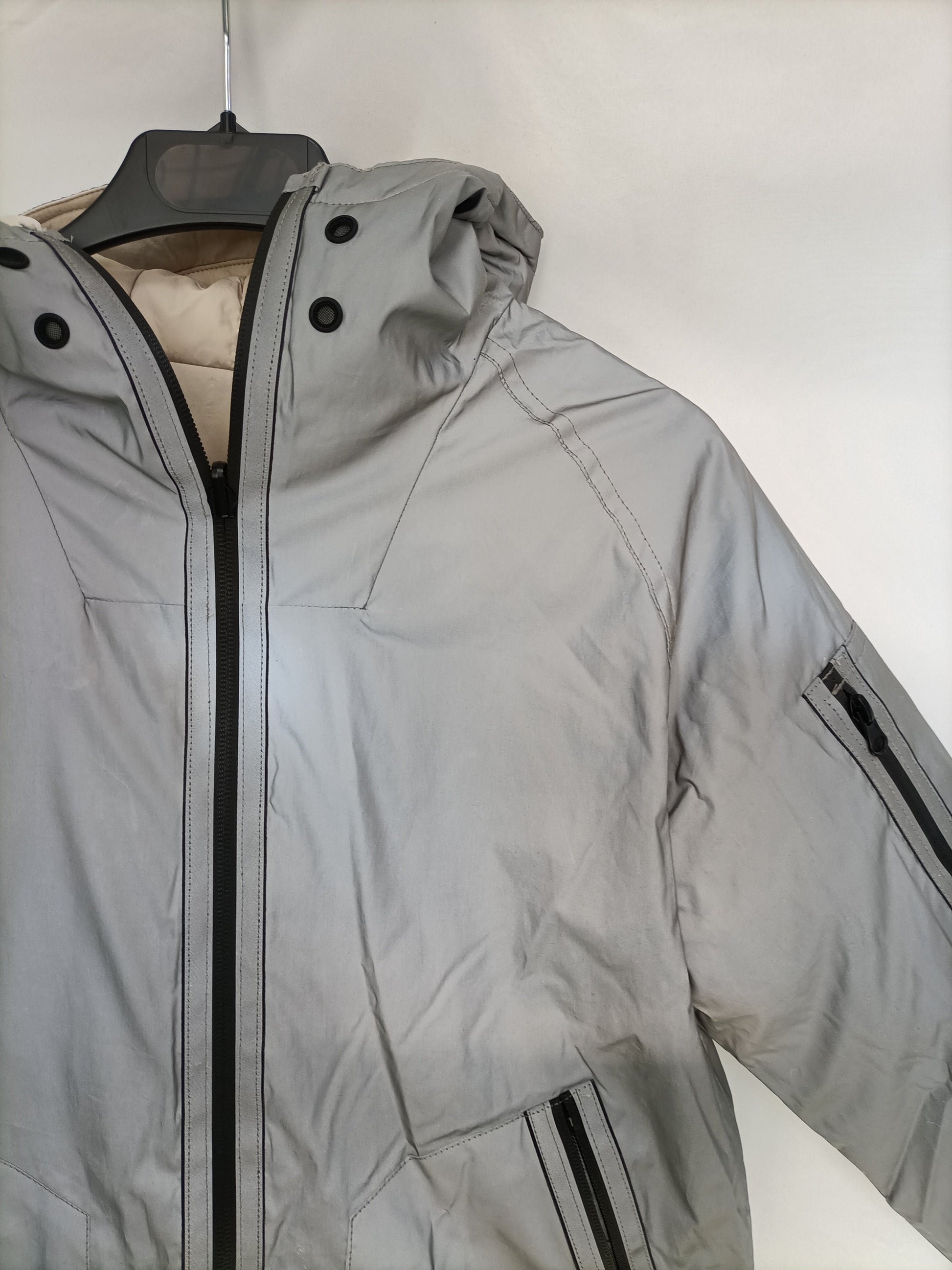 Plumas reversible beige y gris (plateado) con Capucha y cremallera. De sisa a sisa 49 cm largo 65 cm