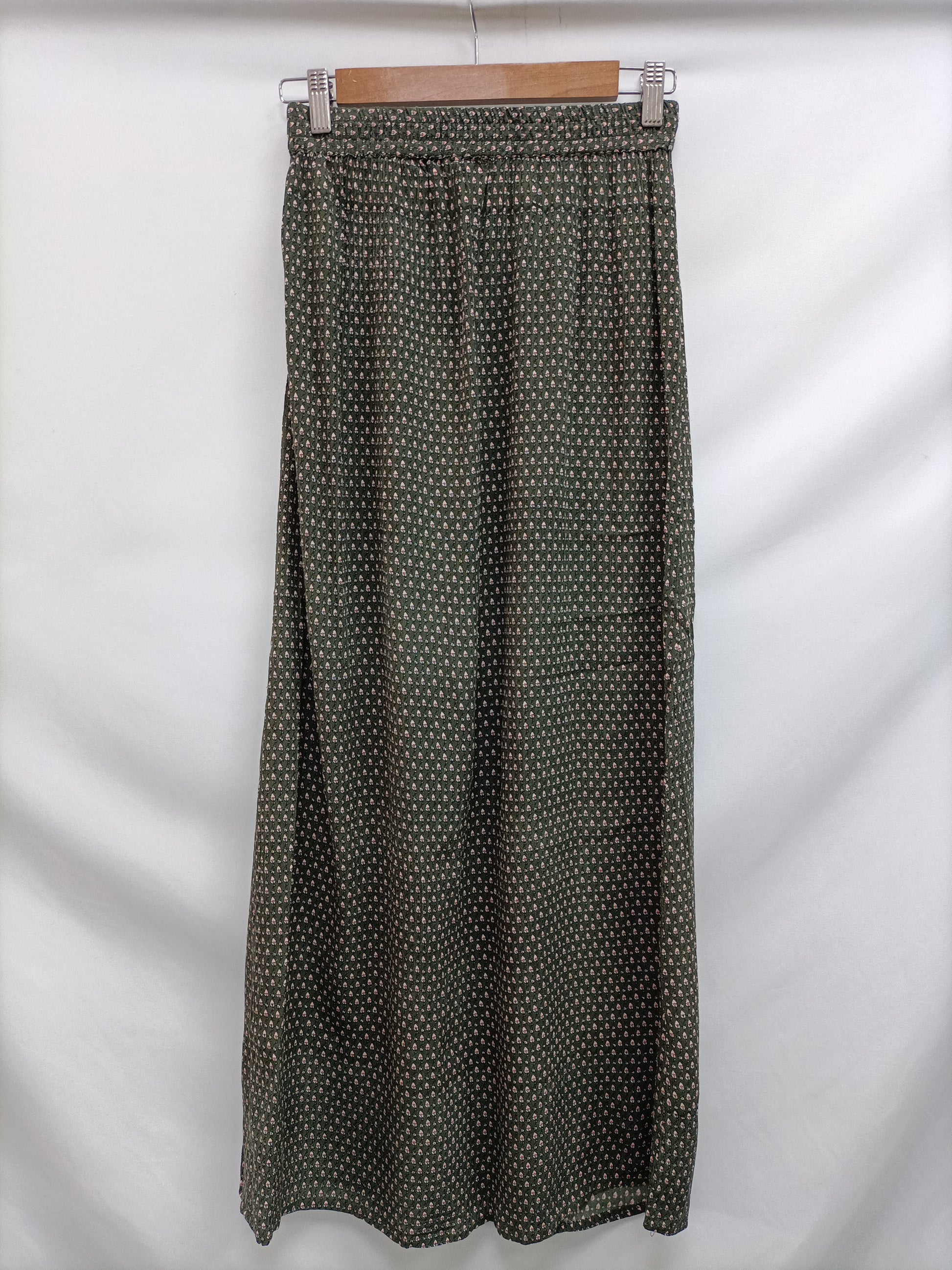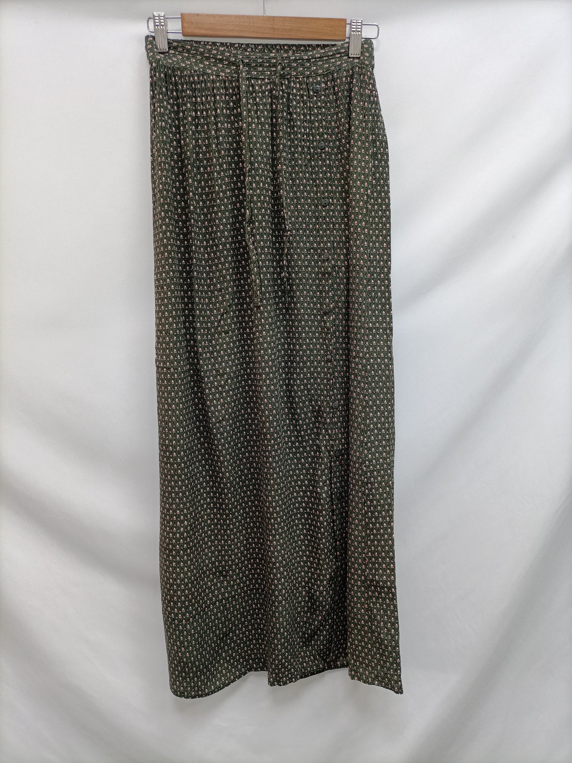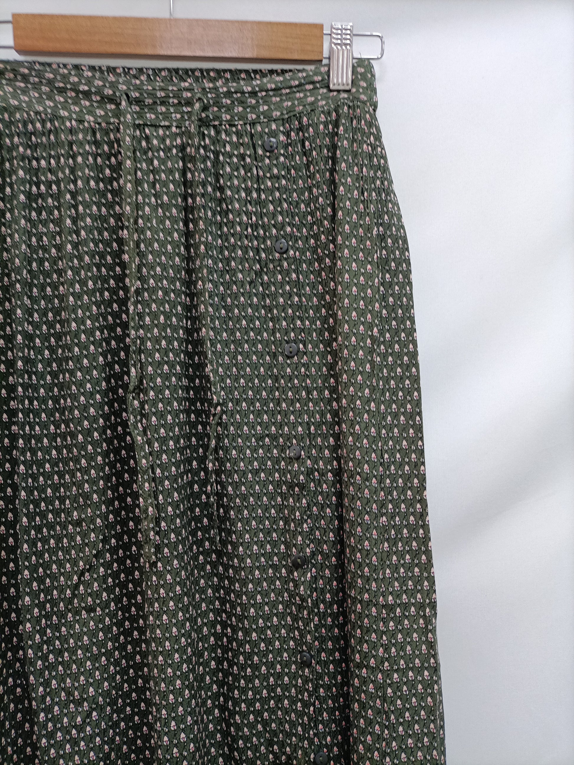 Falda midi verde abotonada con estampado y cintura elástica. largo 96 cm.