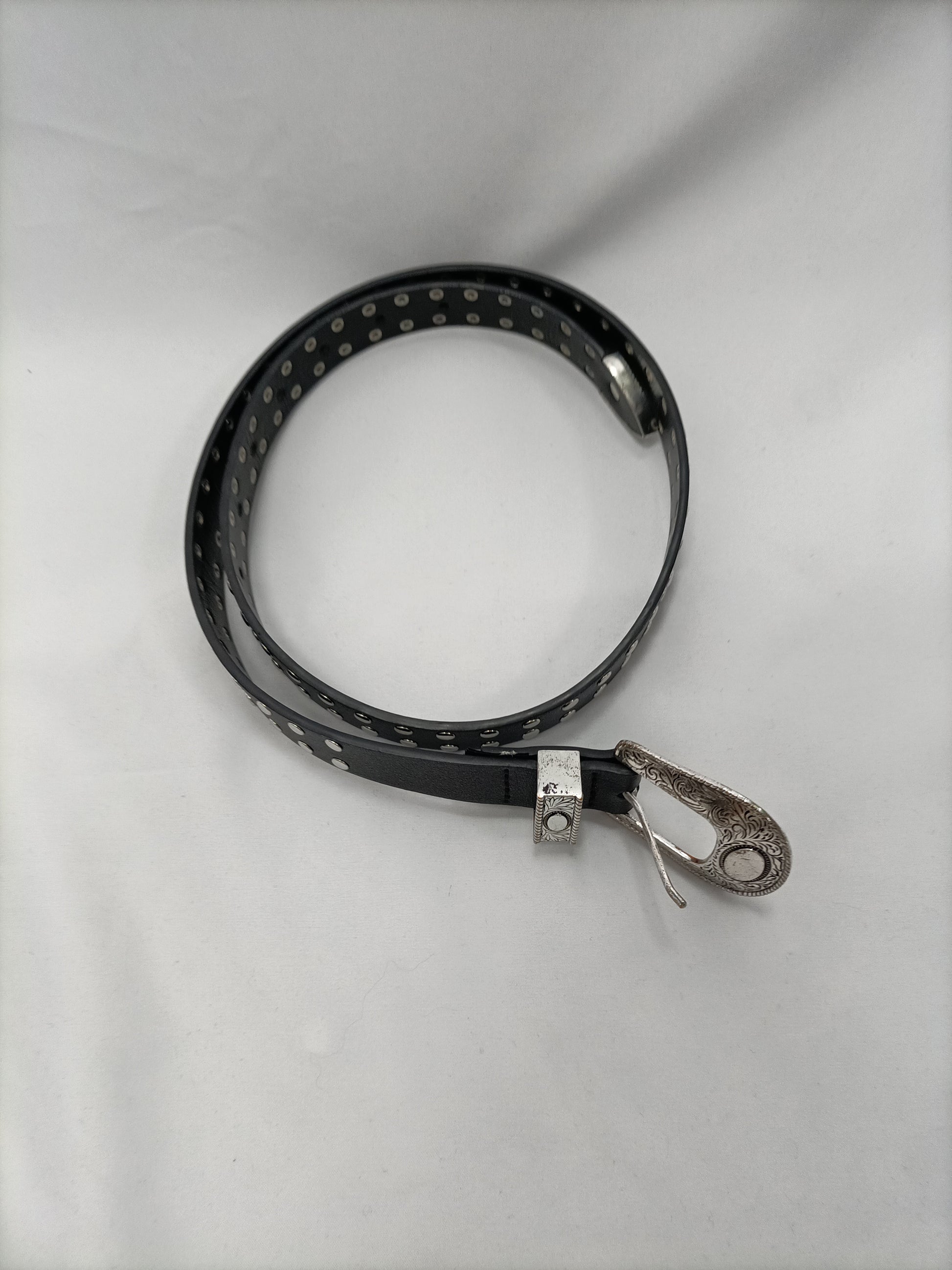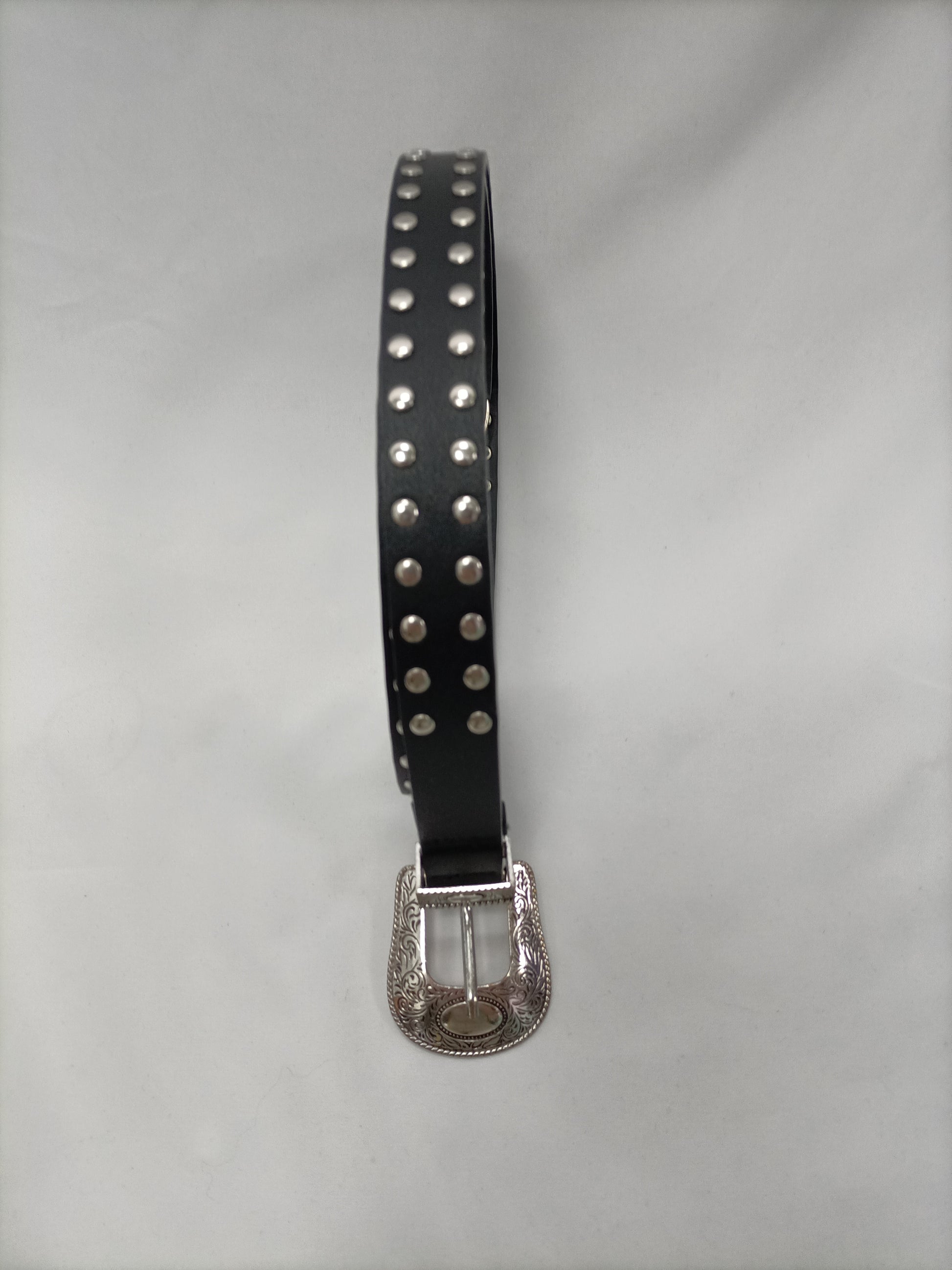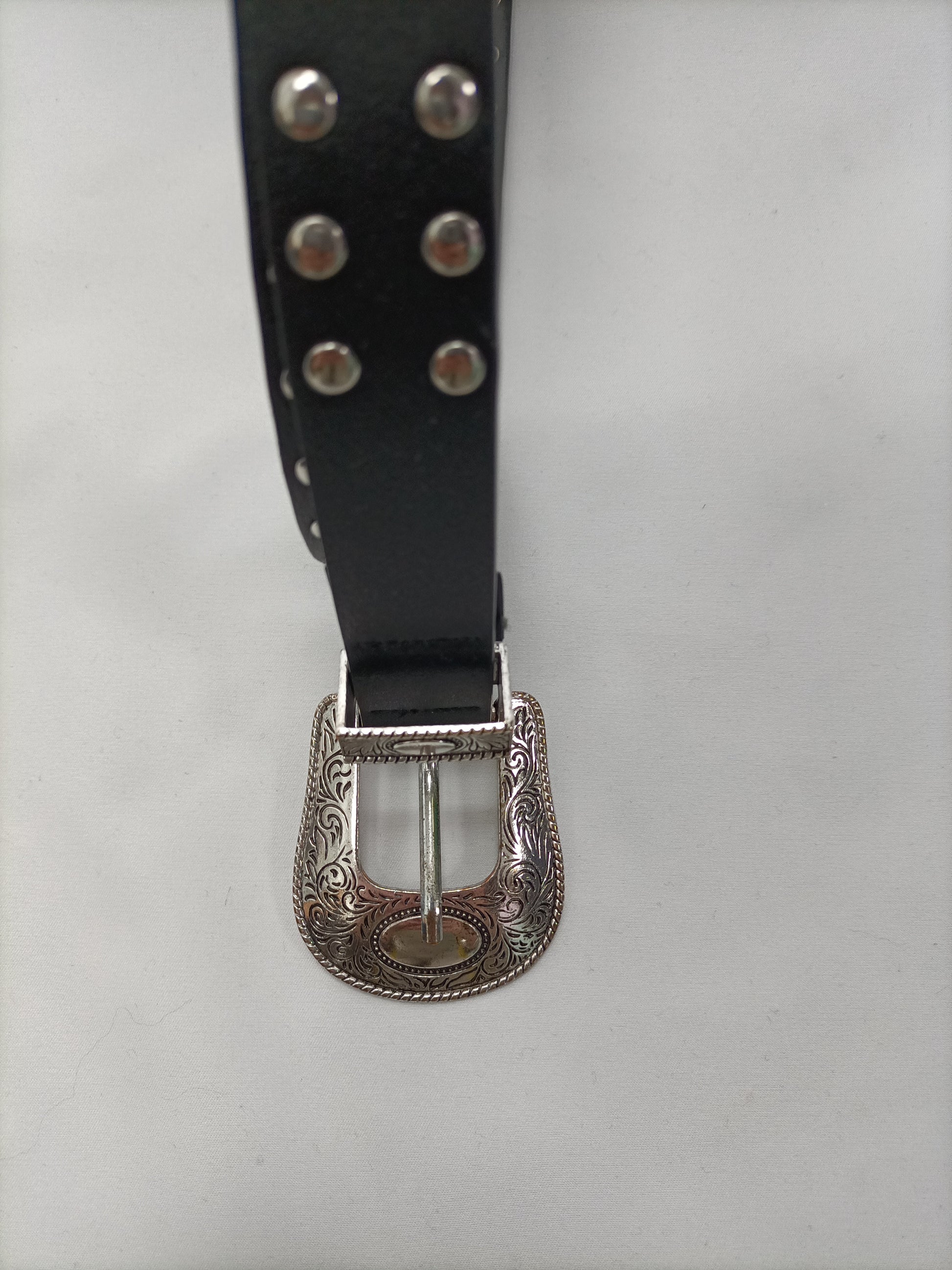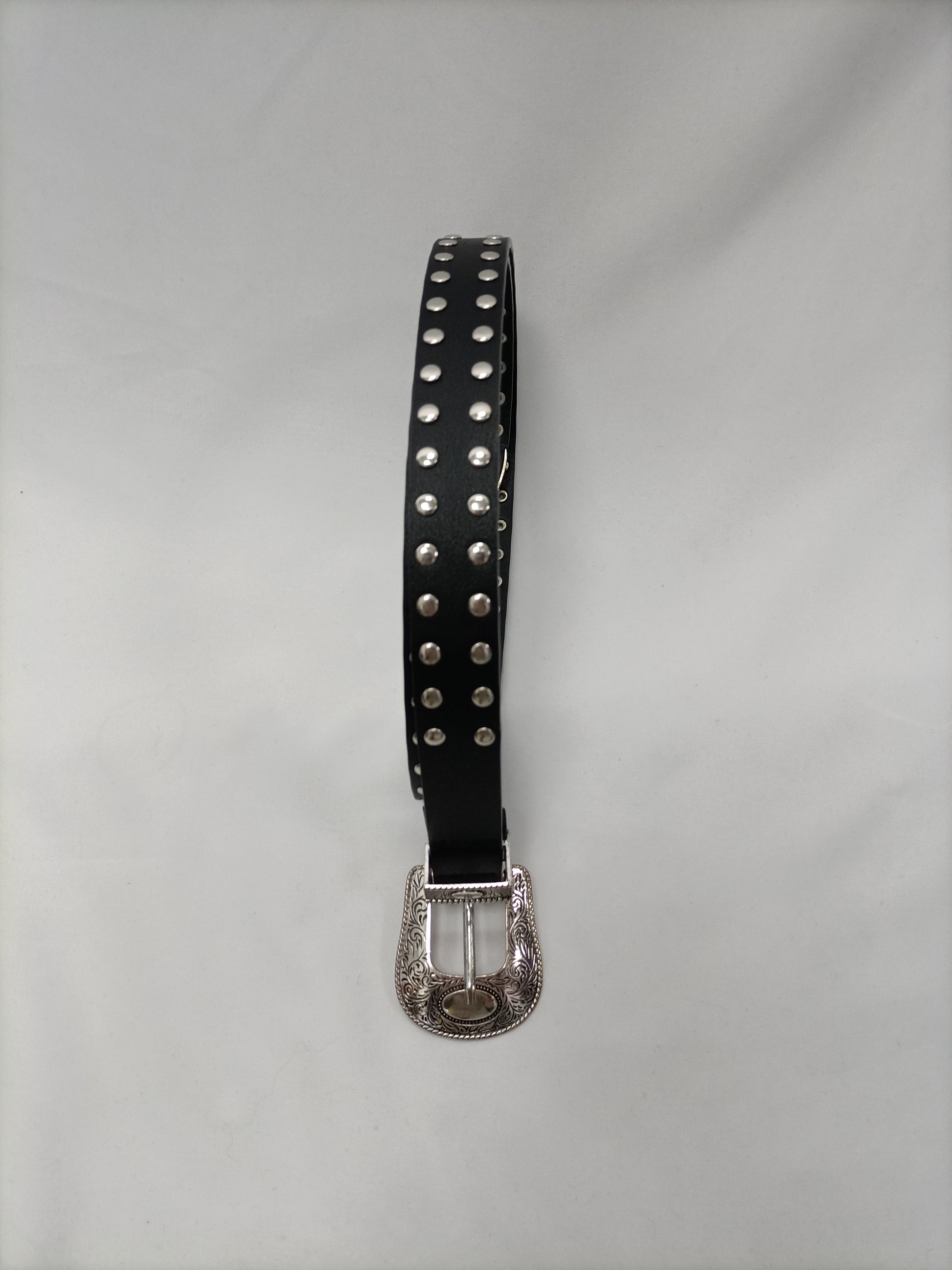 Cinturón negro efecto piel con tachuelas plateadas. Largo 94 cm