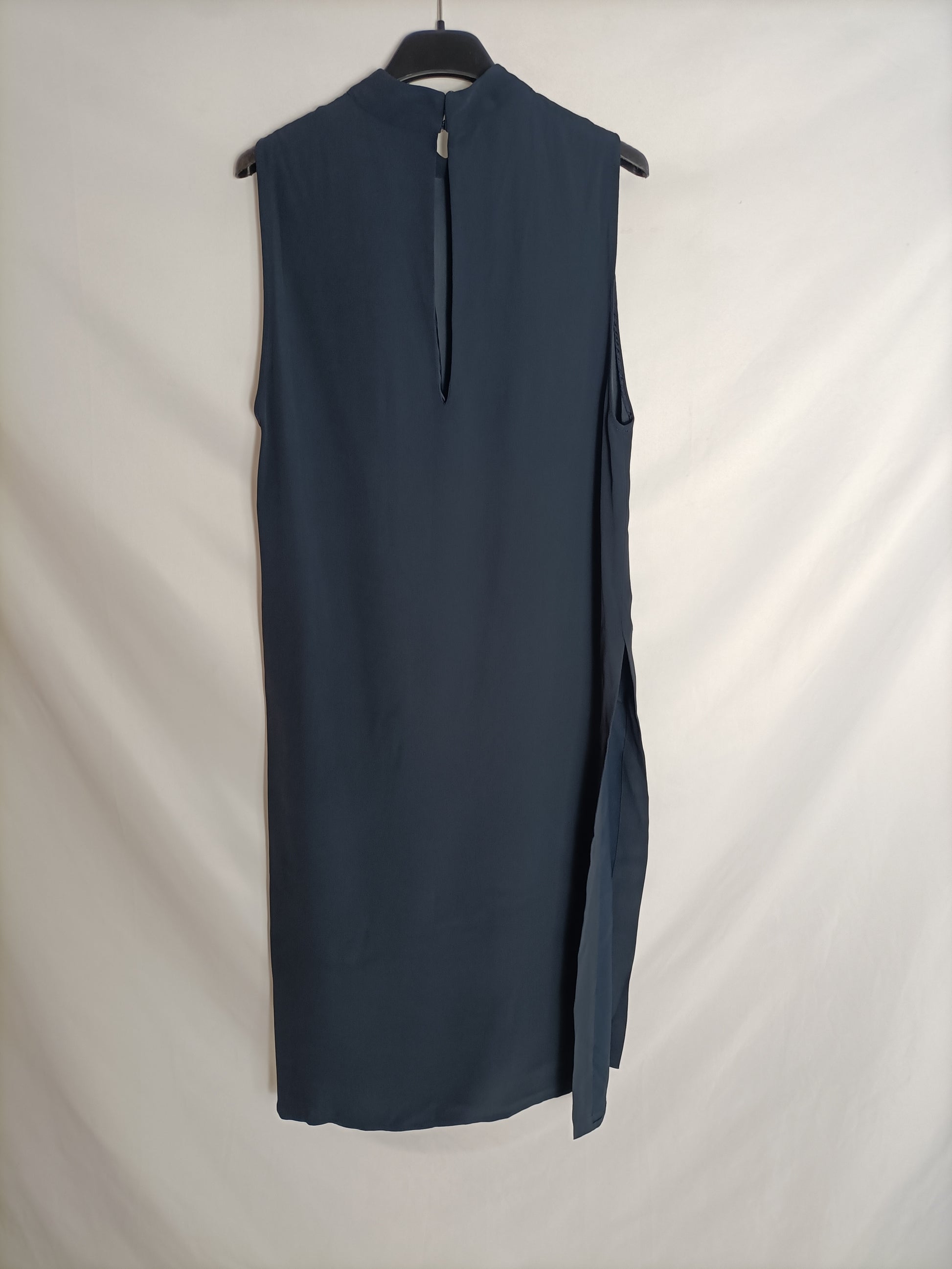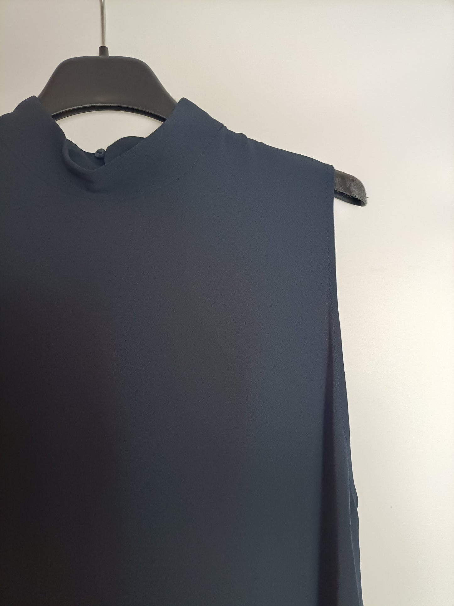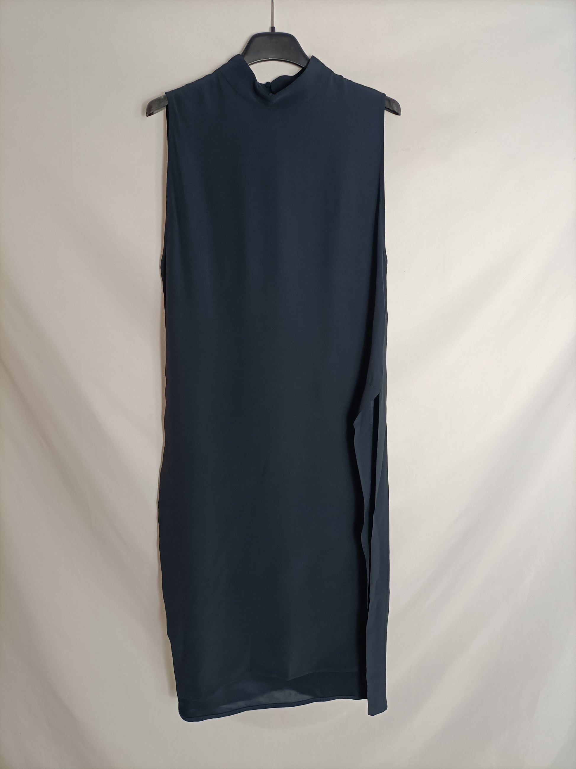 Top largo tipo vestido con aperturas laterales. Azul marino oscuro. Tejido no elástico.