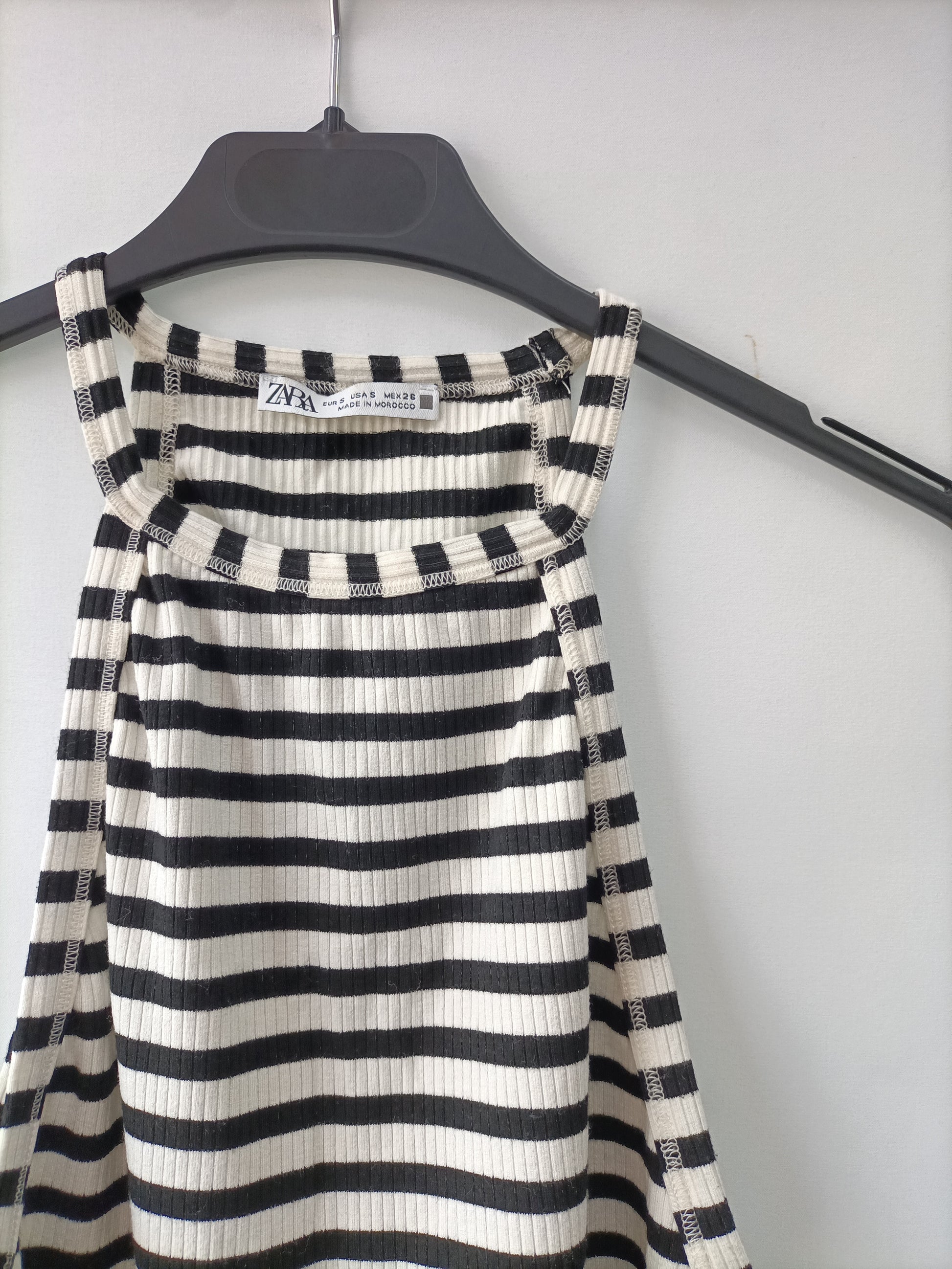 Croptop de rayas beige y negro con escote halter. Elástico y ajustado. Largo 37 cm