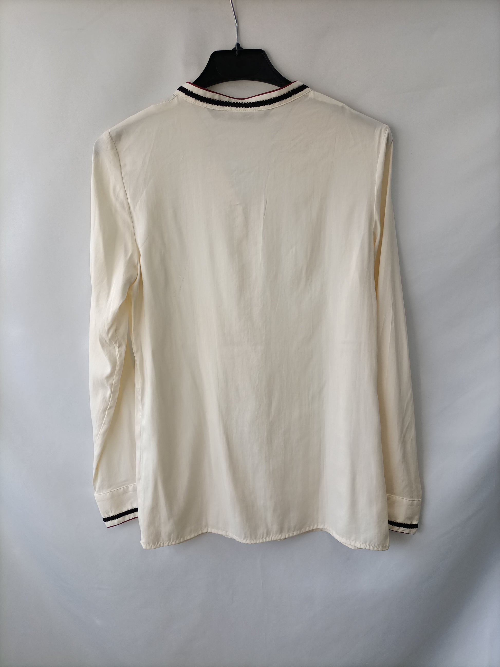Blusa beige fluida con detalle de ribete negro y Burdeos en cuello y mangas. No elastica. De sisa a sisa 41 largo 66 cm