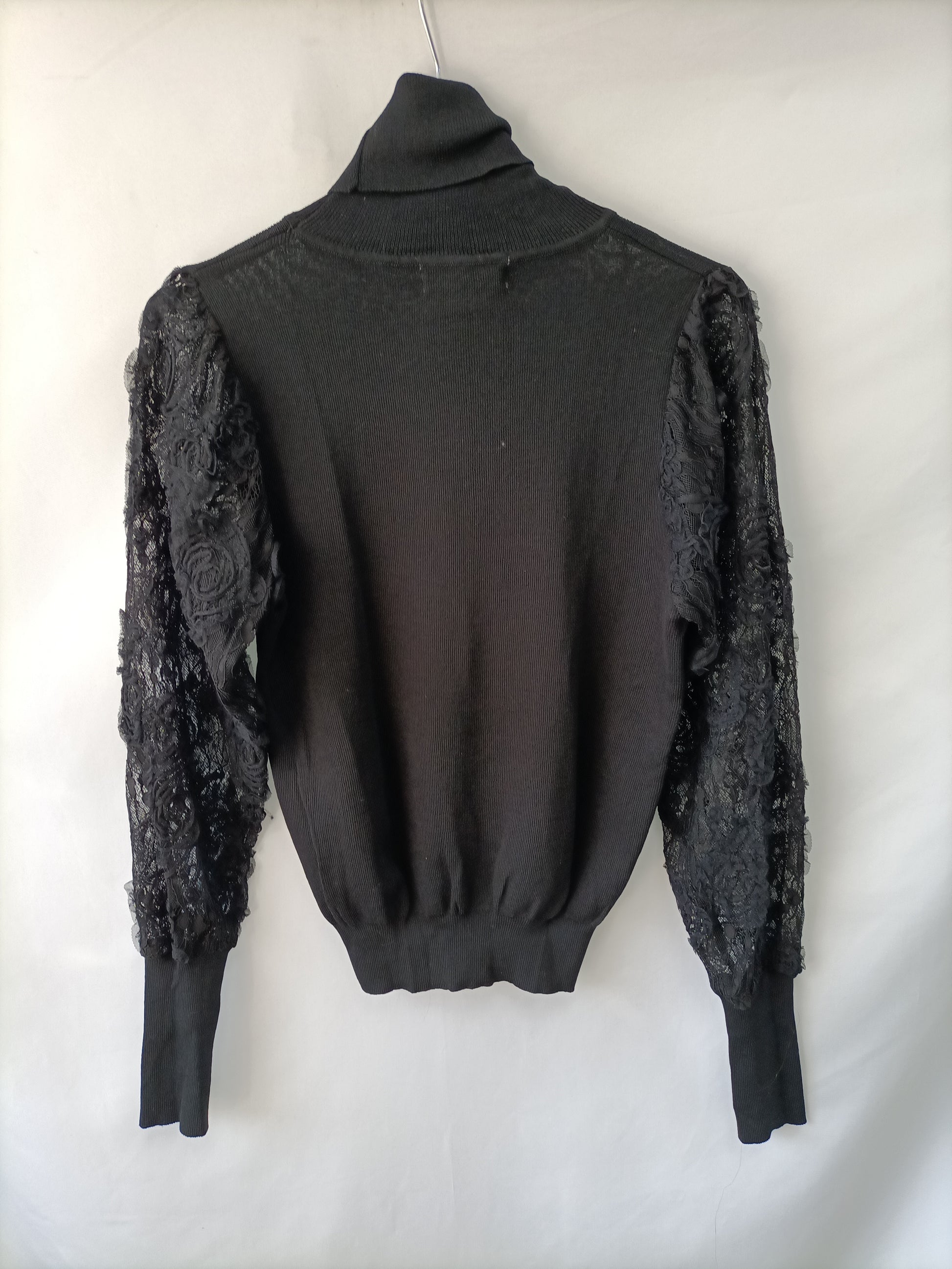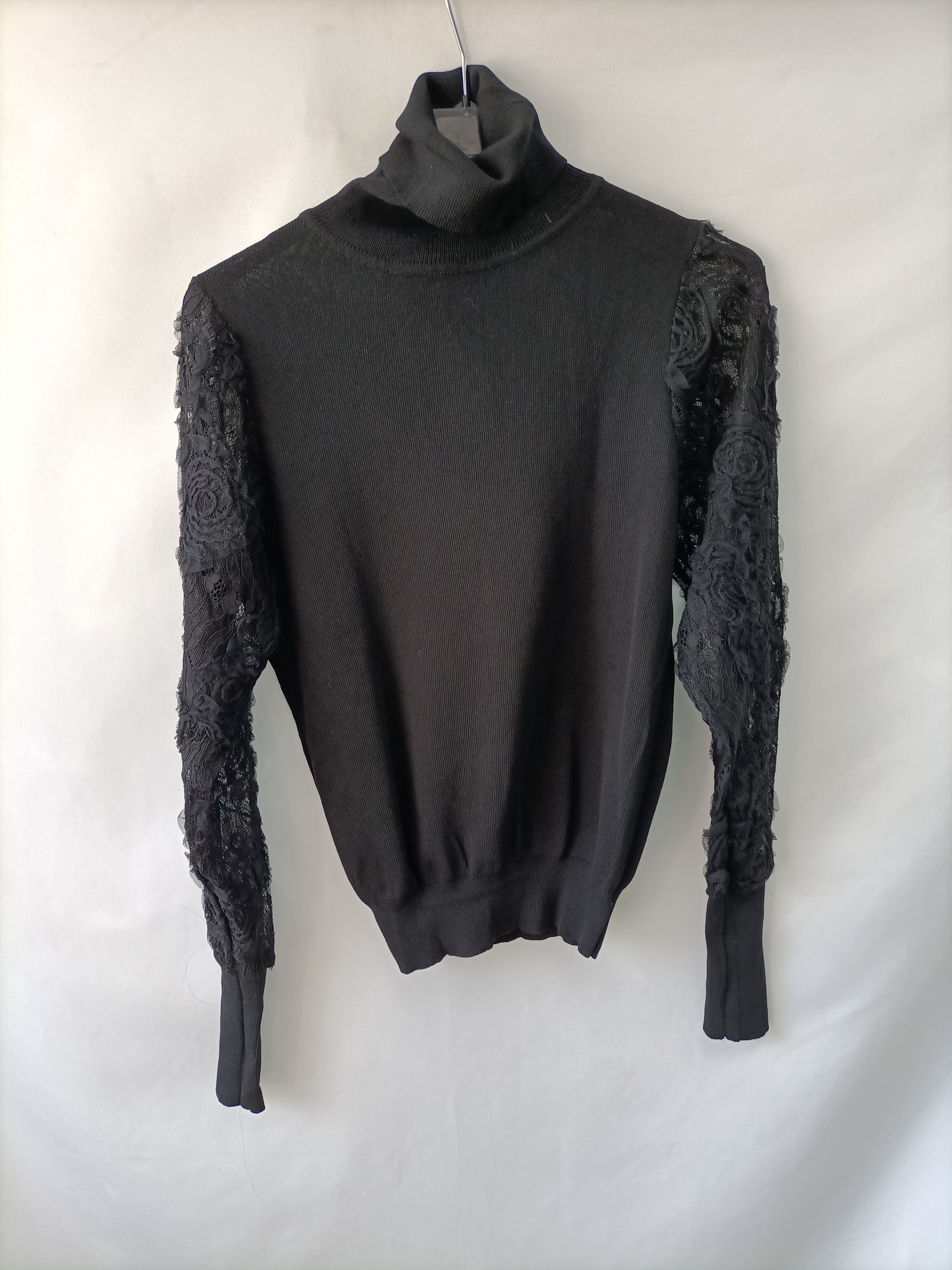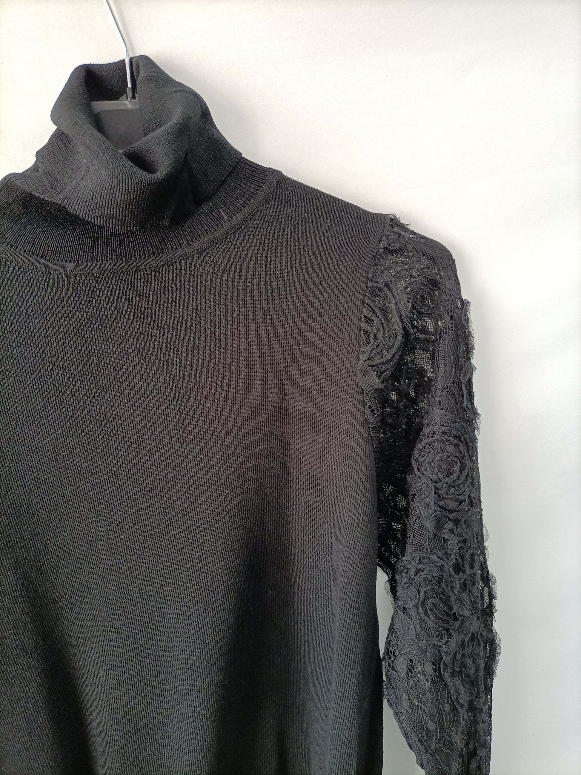 Jersey/top negro de cuello alto con las mangas ligeramente Abullonadas de encaje. Elastico. Largo 55 cm