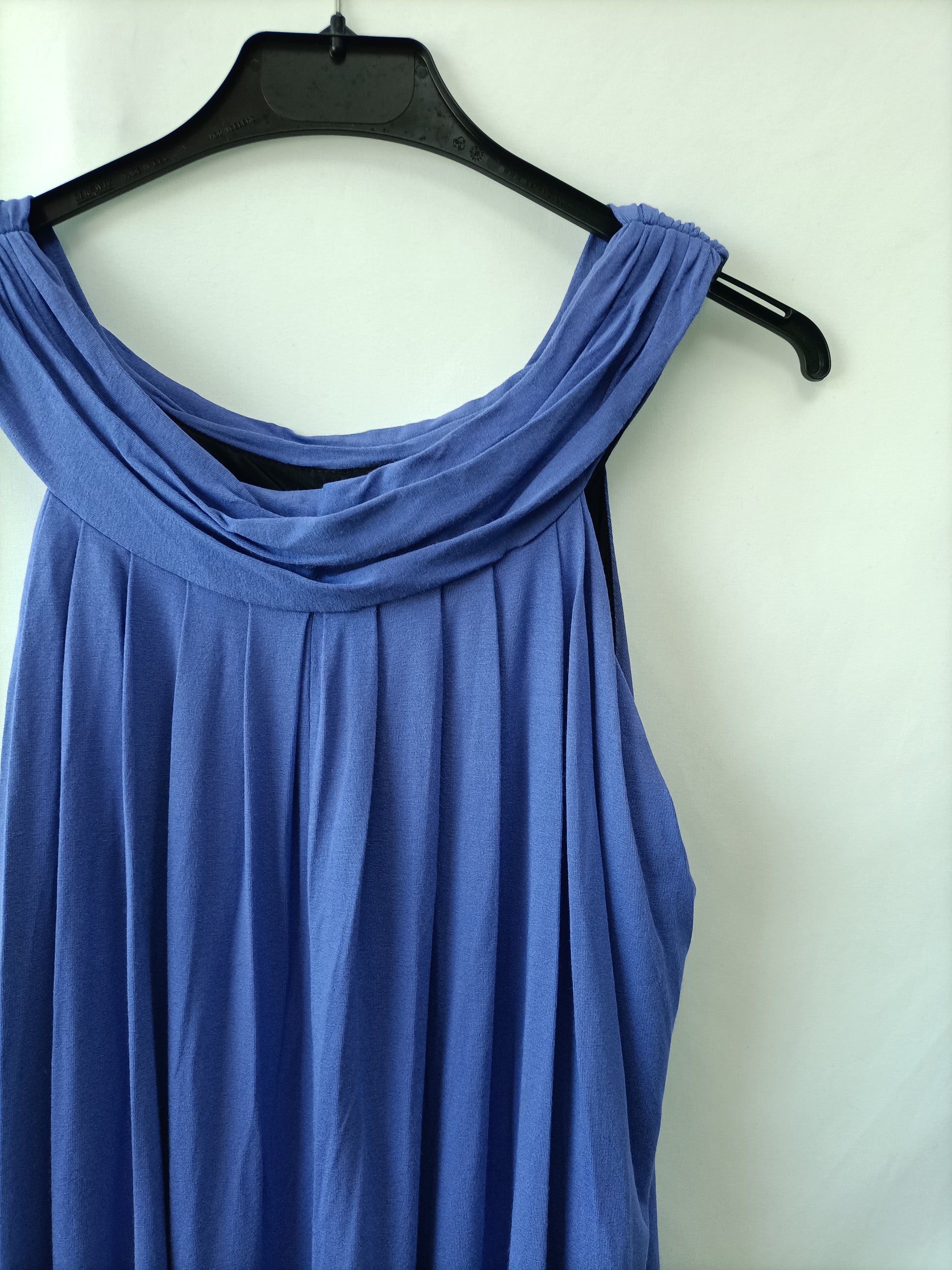 Vestido corto azul con el escote plisado. Parte de abajo bombacha. De sisa a sisa 45 cm largo 76 cm