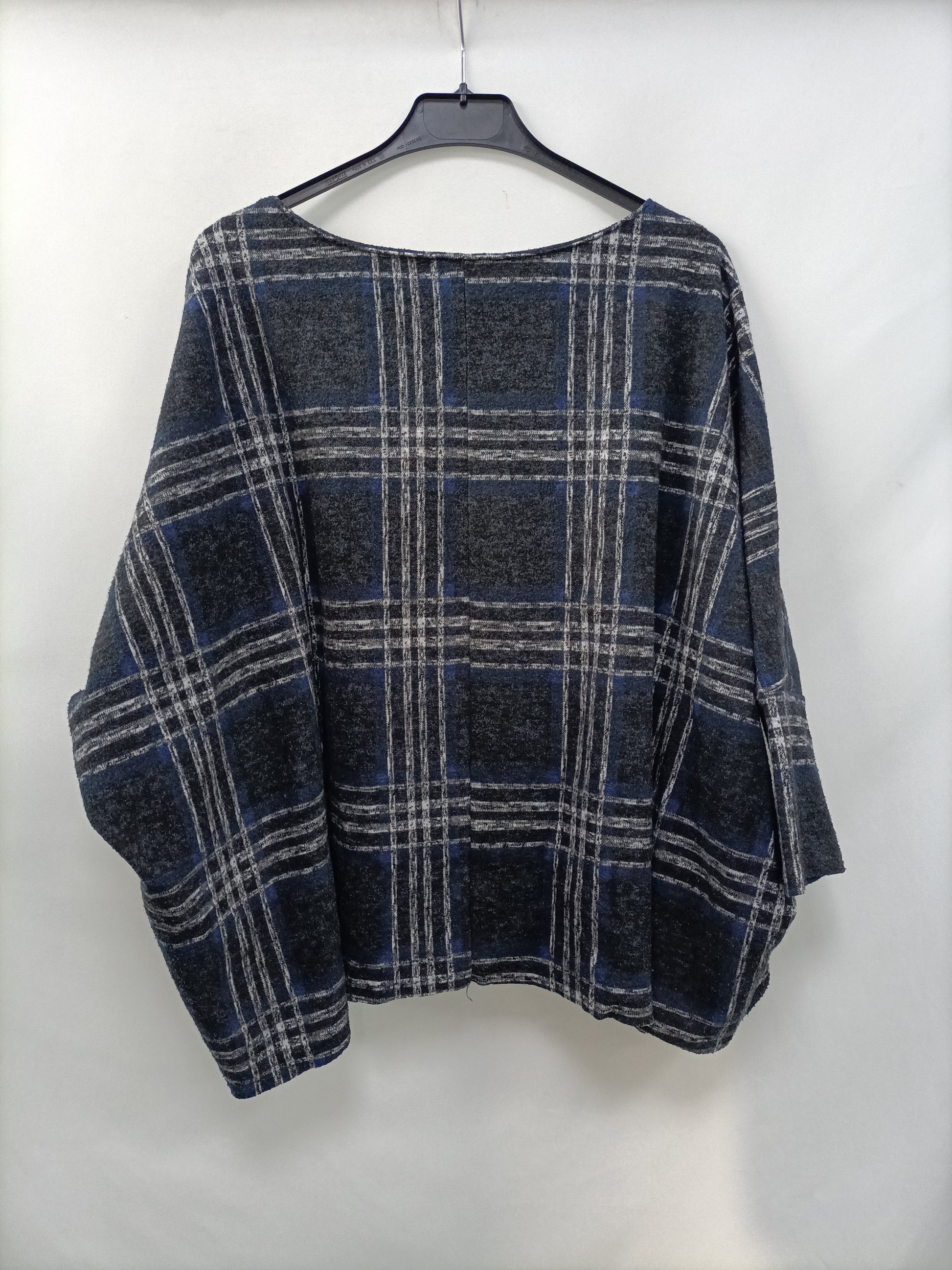 Top gris de franela con cuadros grises y azules. largo 57 cm