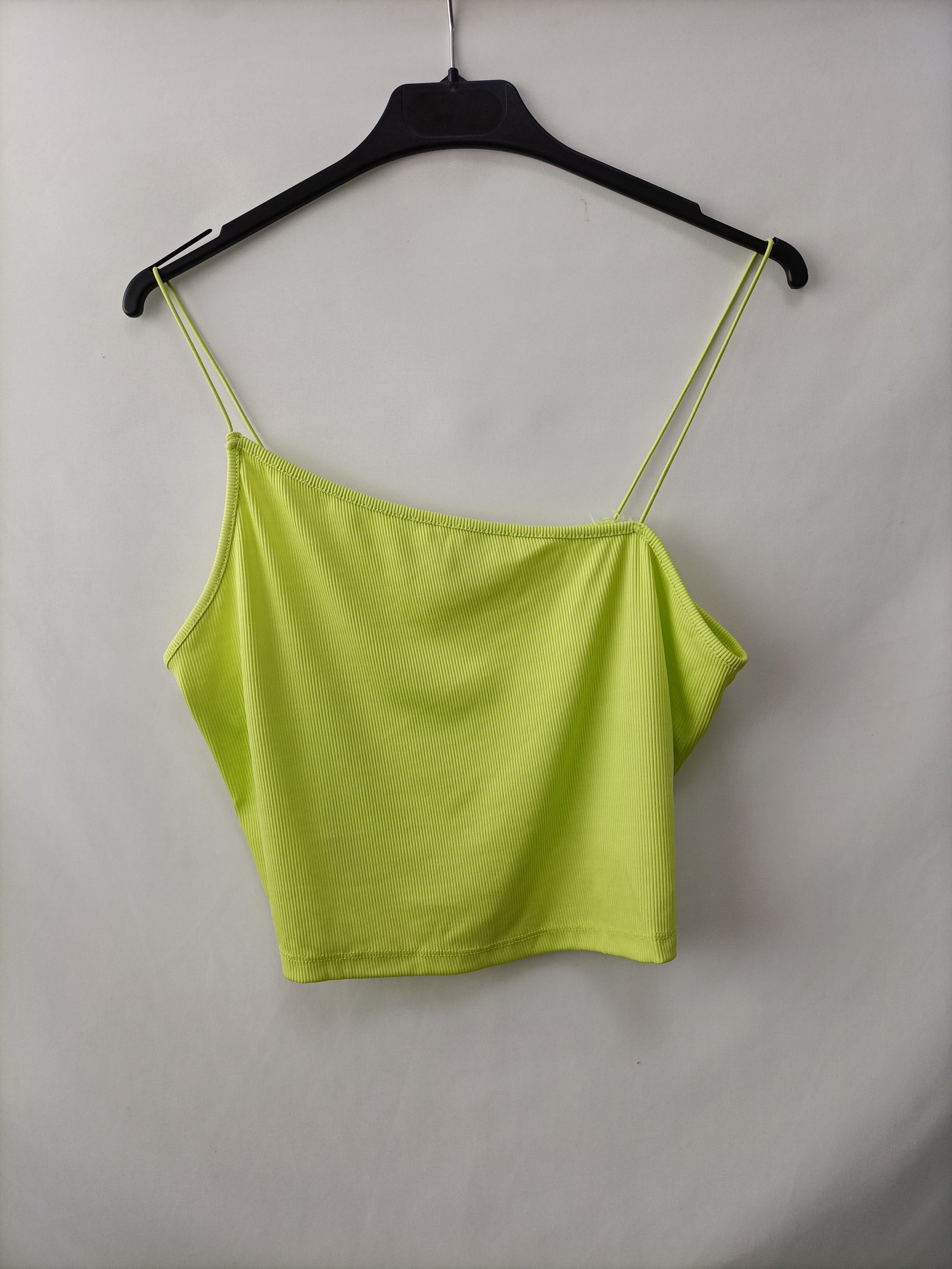 Top de canalé verde con el Escote asimétrico. Largo 41 cm