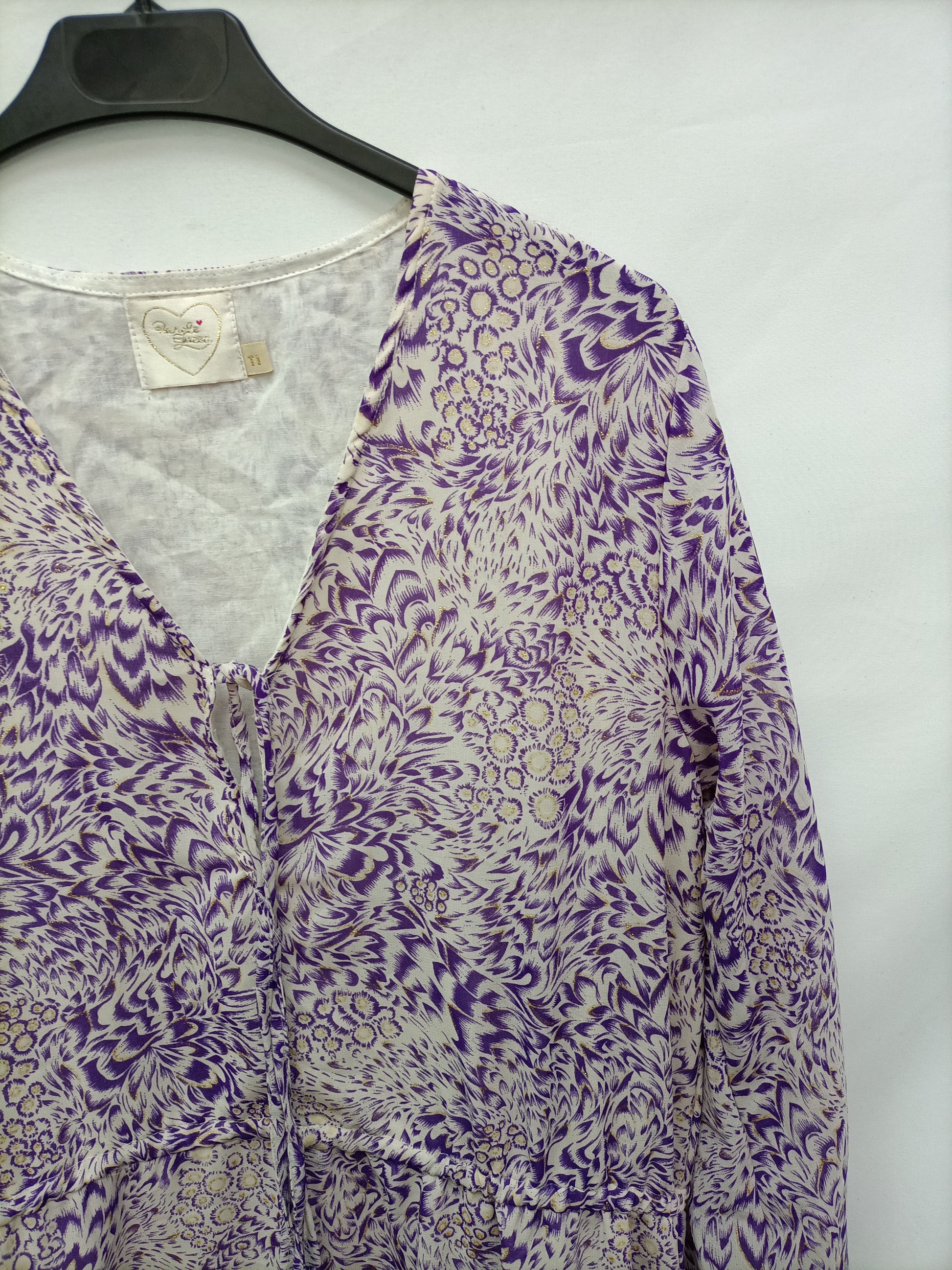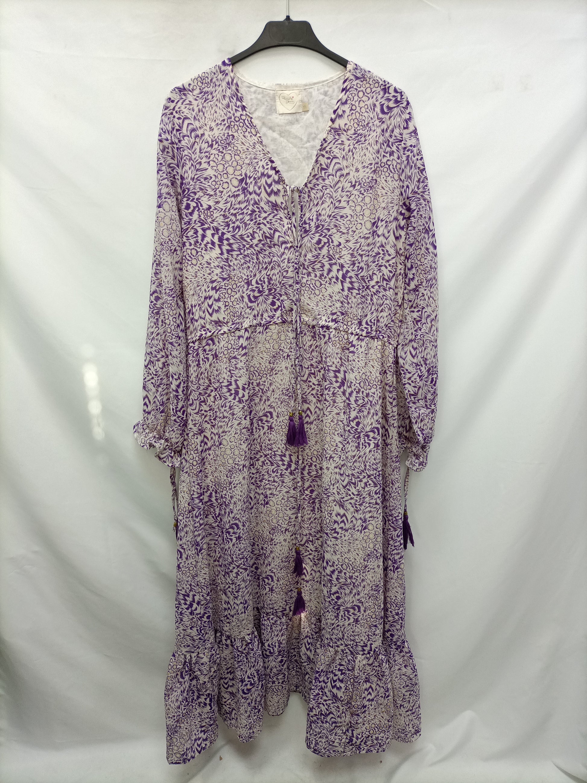 Vestido largo fluido beiges con estampado animal print en morado. Detalle de hilos dorados. No elástico. De sisa a sisa 51 cm Largo 104 cm