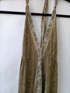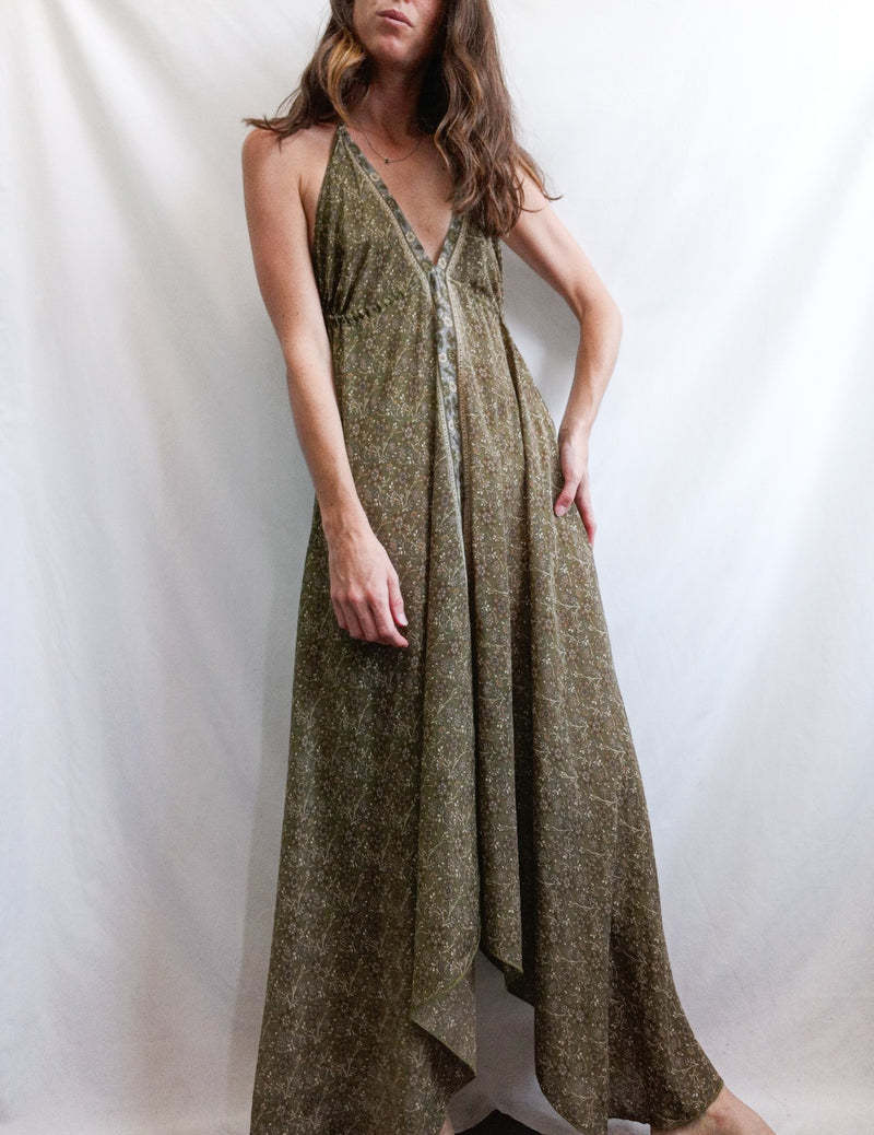 Vestido largo asimétrico verde con flores. Atado al cuello con espalda baja. Largo 107 cm