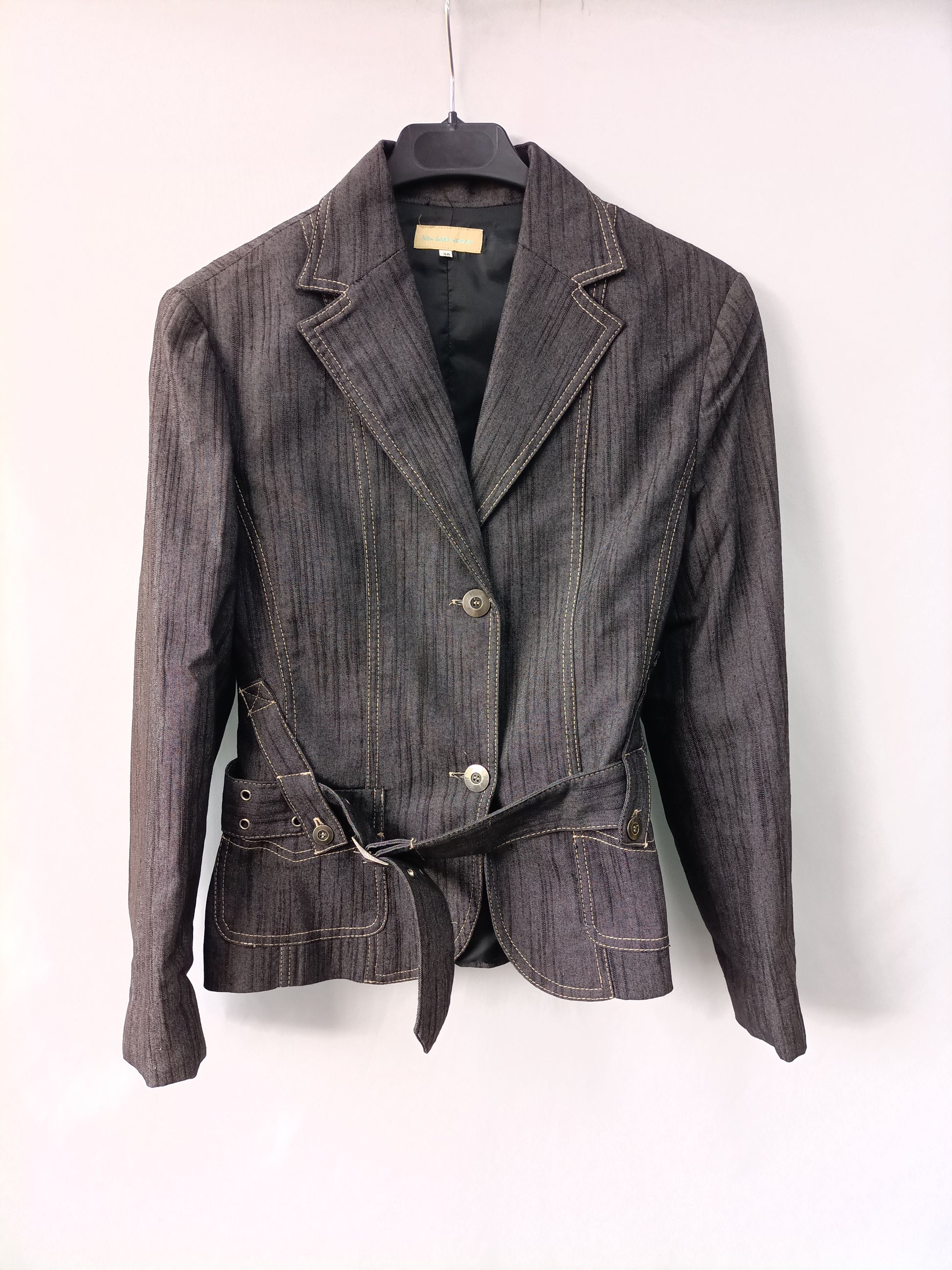 Blazer denim gris con cinturón. No elástica. De sisa a sisa 42 cm Largo 55 cm