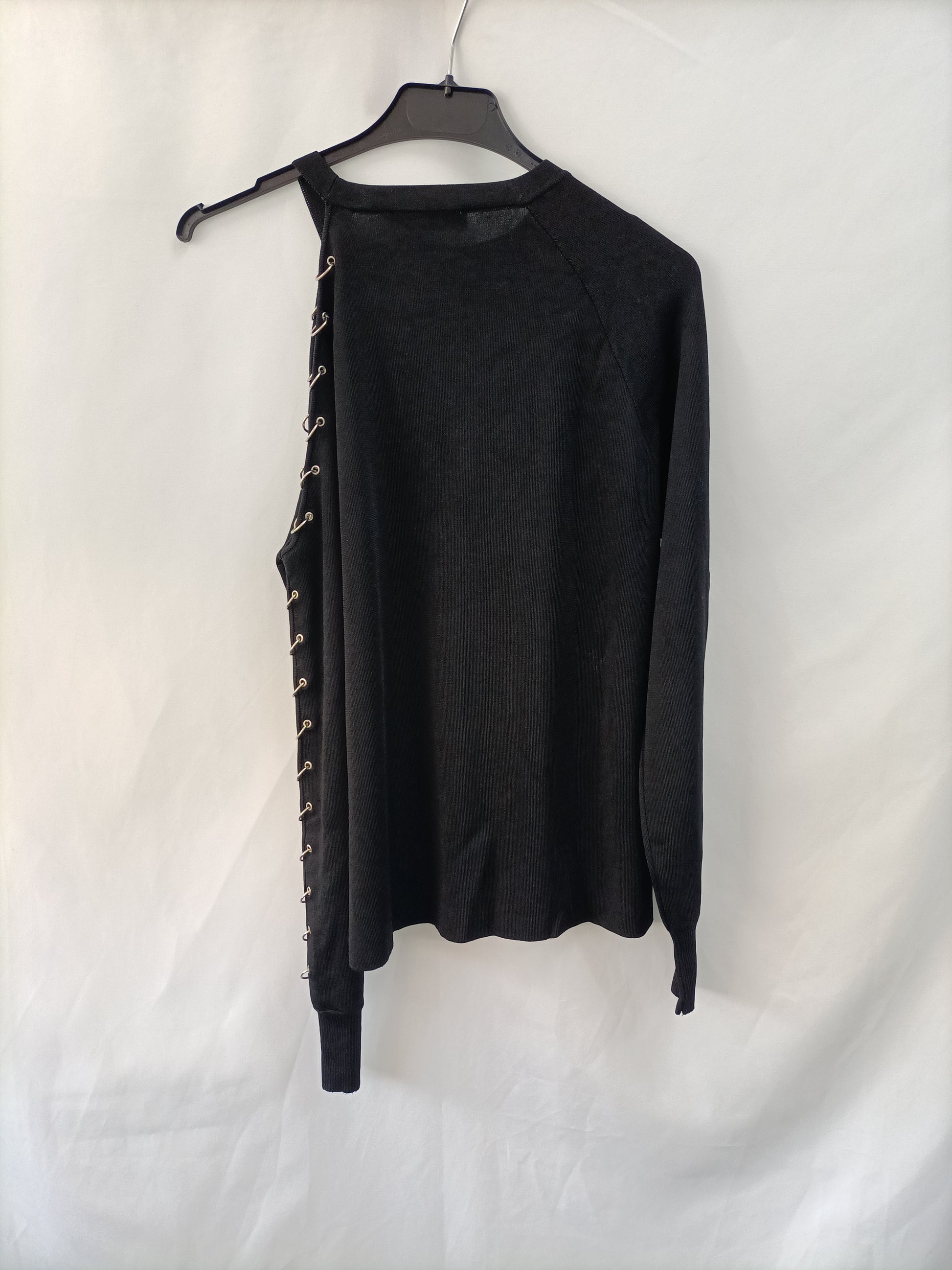 Jersey/top negro con homgro al descubierto y mangas abierta con argollas plantadas. largo 62 cm