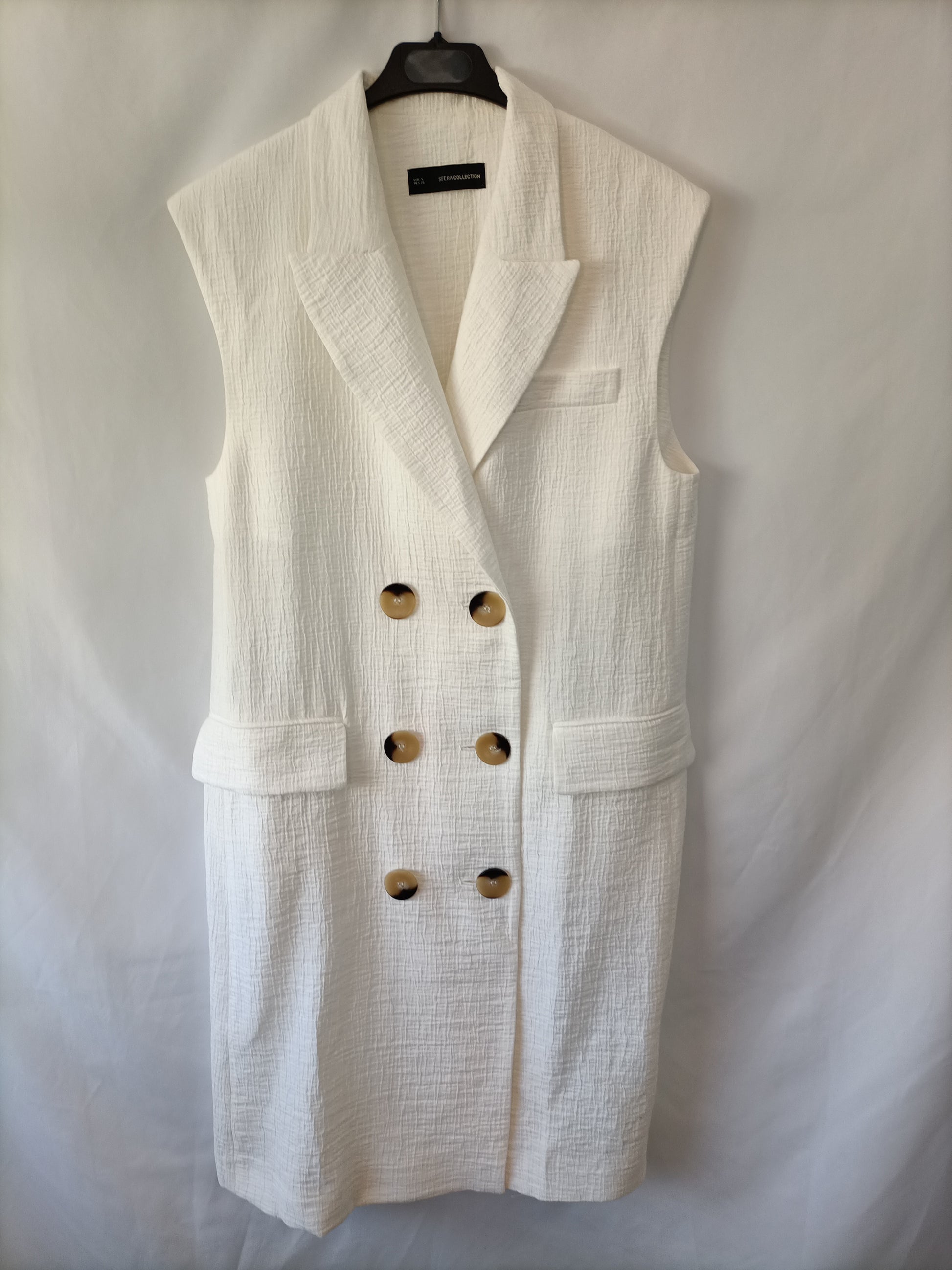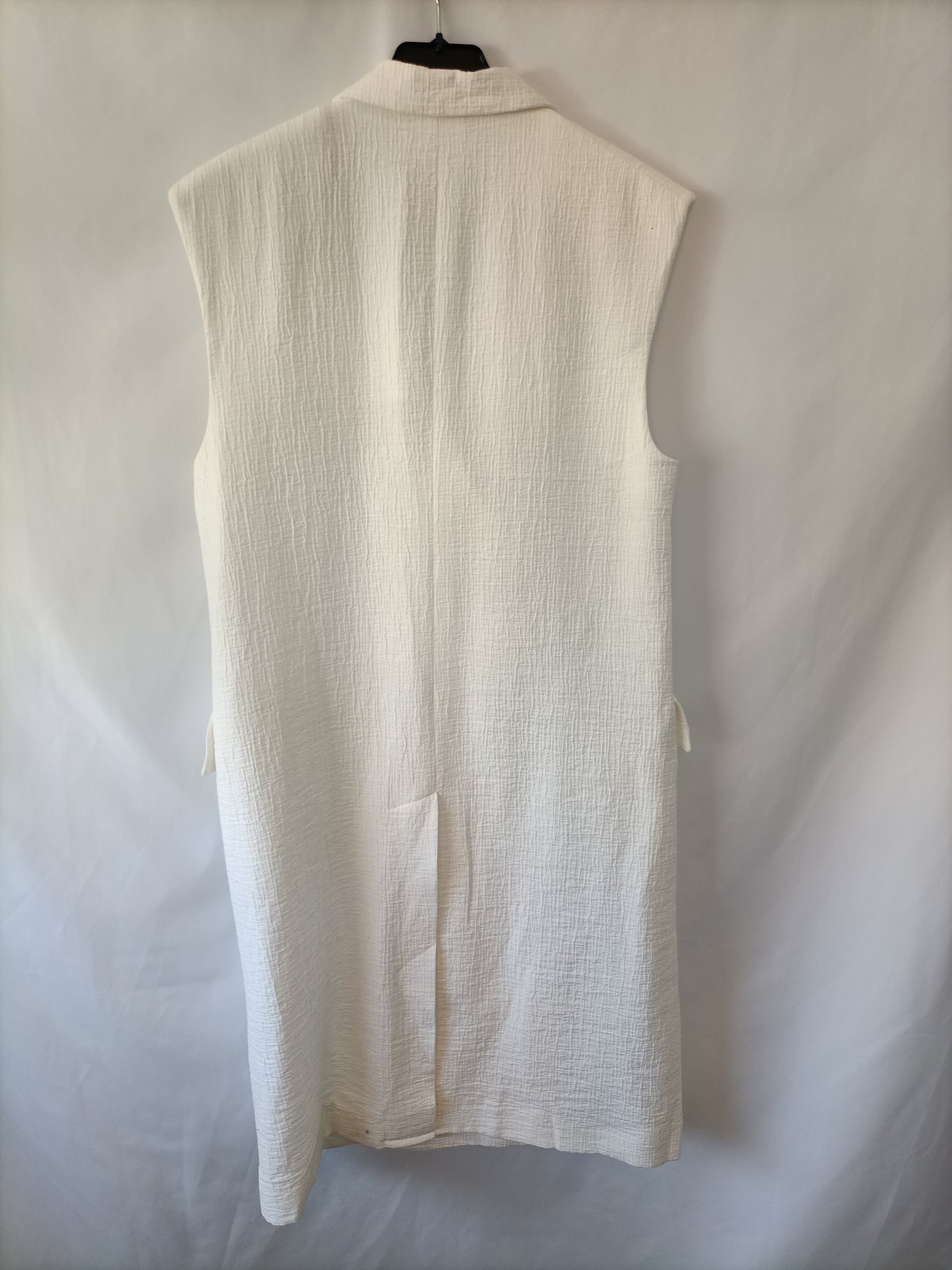Chaleco blanco cruzado estilo oversized de tejido con textura. De sisa a sisa 47 cm Largo 104 cm