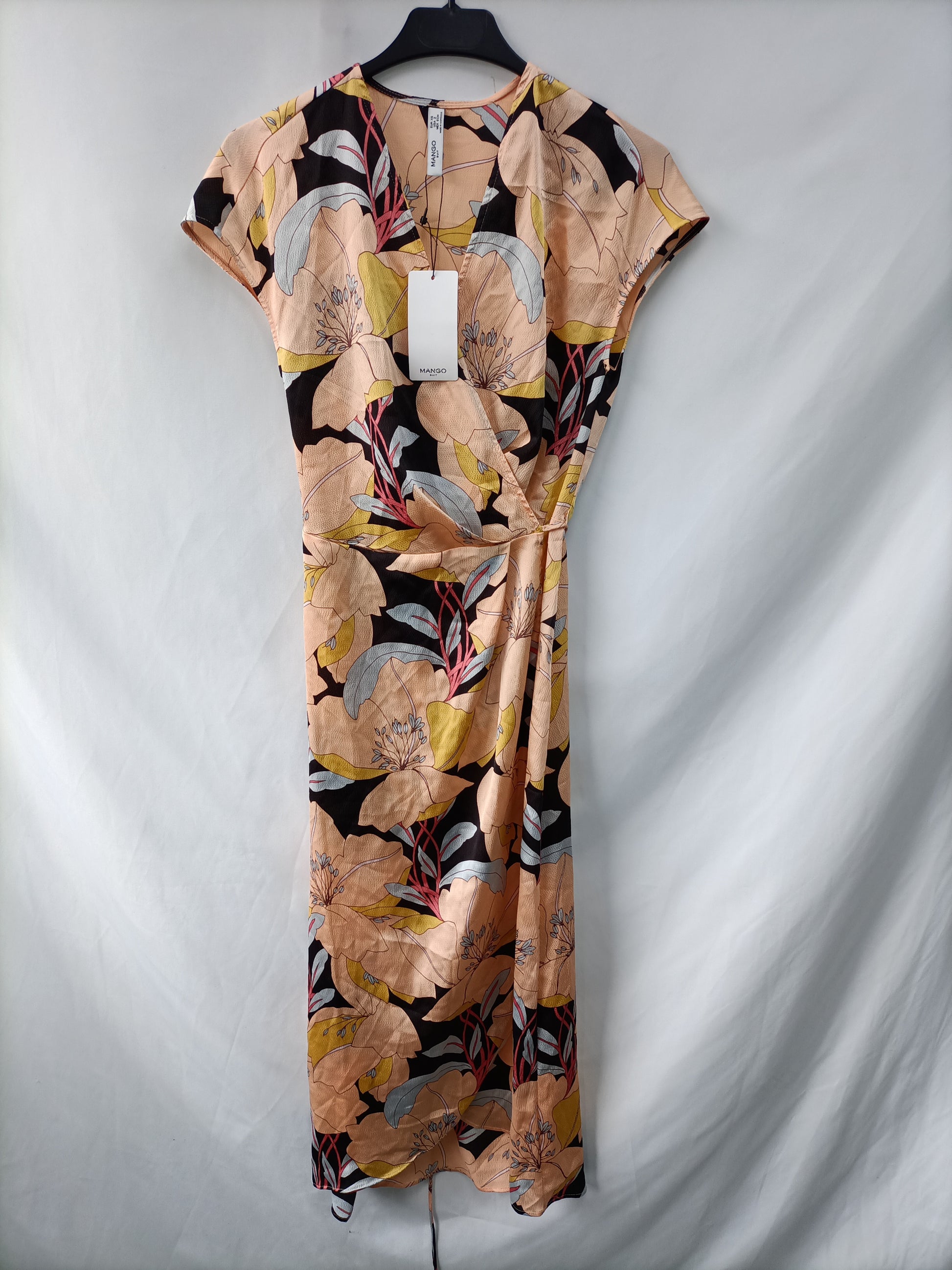 NUEVO CON ETIQUETA. Vestido midi cruzado con flores en tono naranja palo. De sisa a sisa 43 cm largo 127 cm