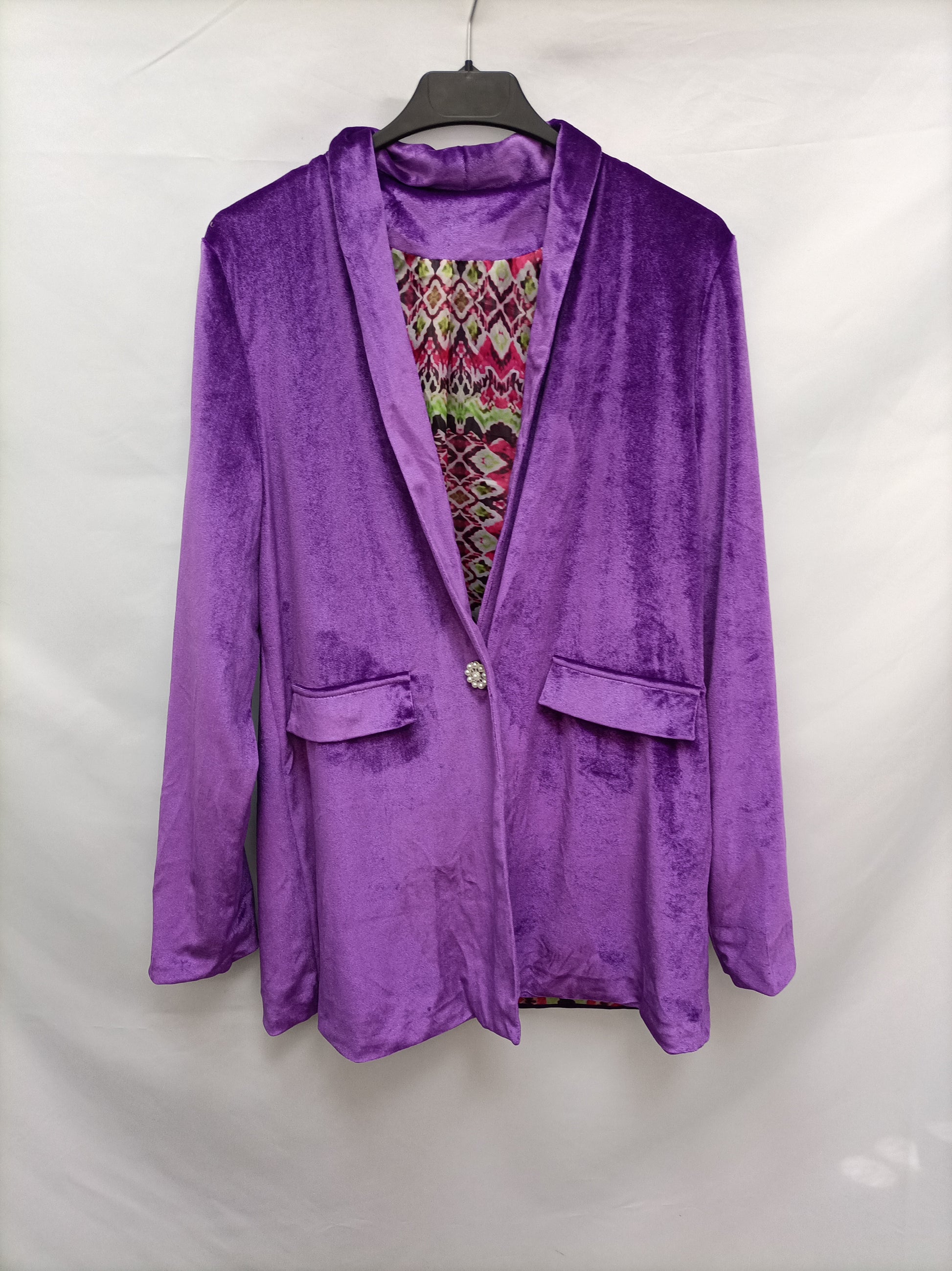 Blazer fluida de terciopelo morada con detalle de boton joya de perlas. Elastica. De sisa a sisa 49 cm Largo 78 cm