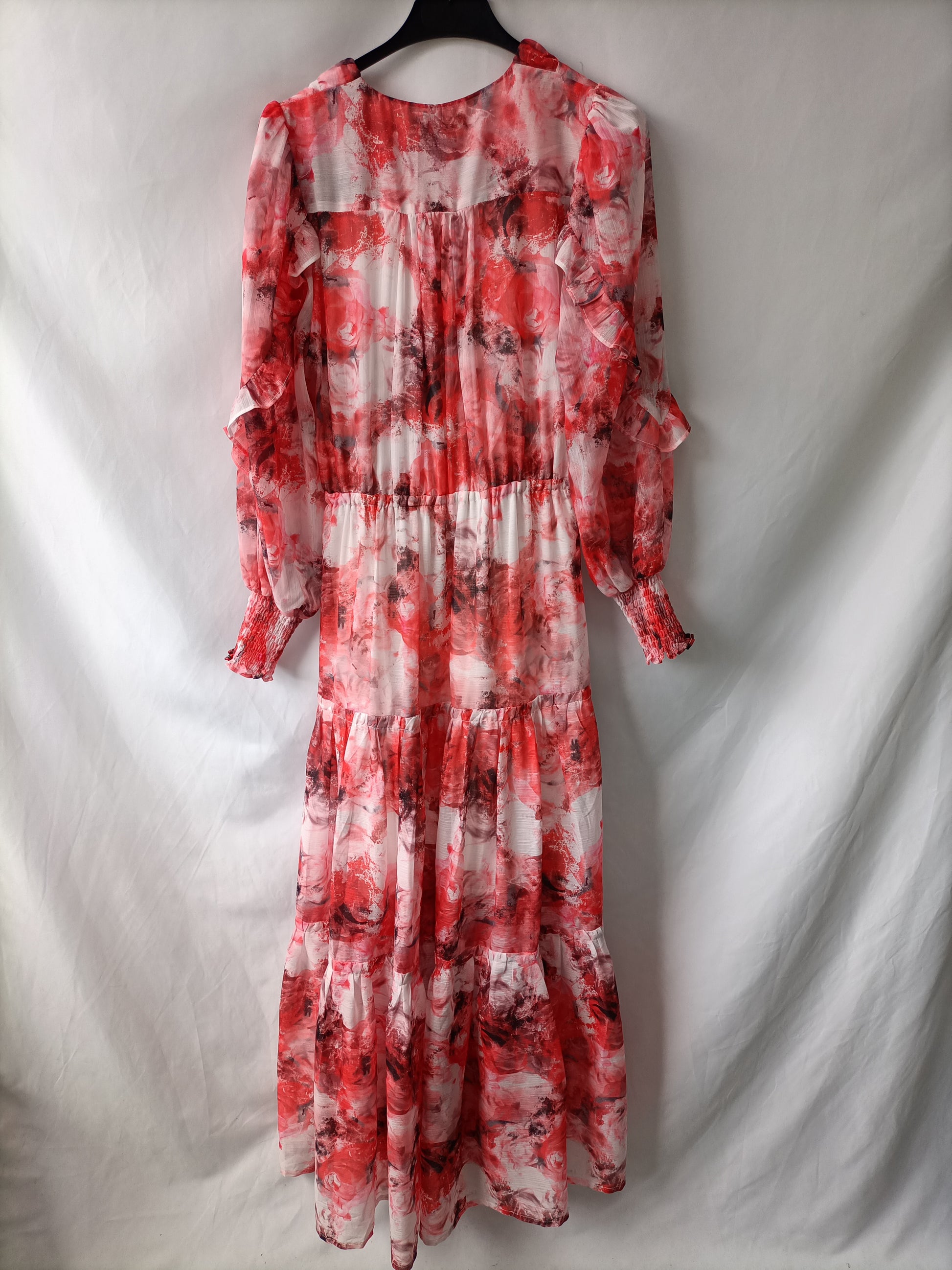 Vestido largo blanco y rojo estampado con volantes en las mangas. Fluido. De sisa a sisa 40 cm largo 143 cm