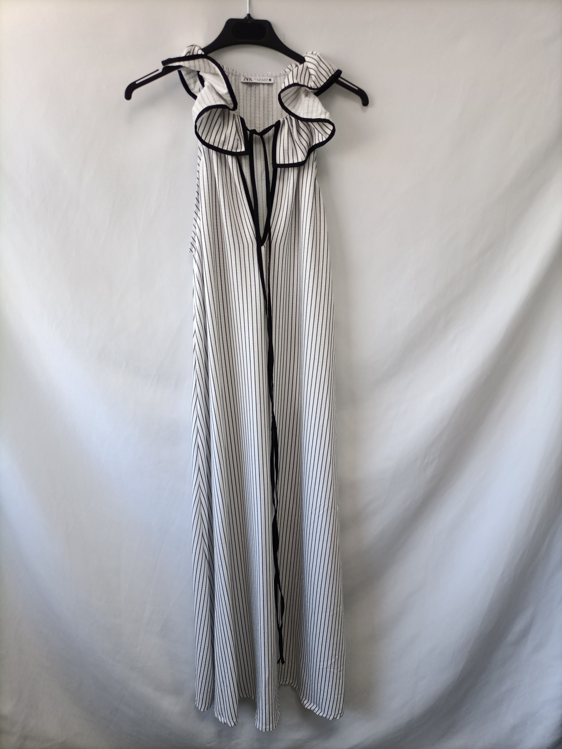 Vestido largo de rayas blanco y negro con detalle de volante en el cuello. De sisa a sisa 48 cm largo 134 cm