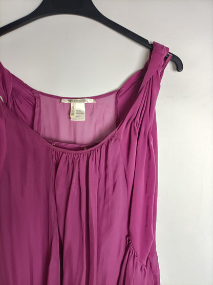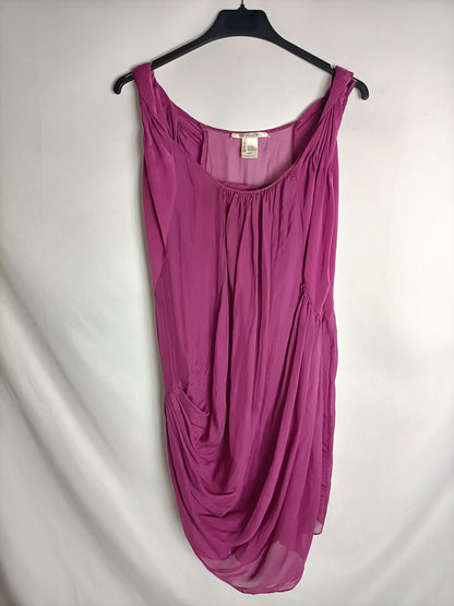 Vestido violeta corto de seda. Lleva un vestido interior. Tejido no elástico.