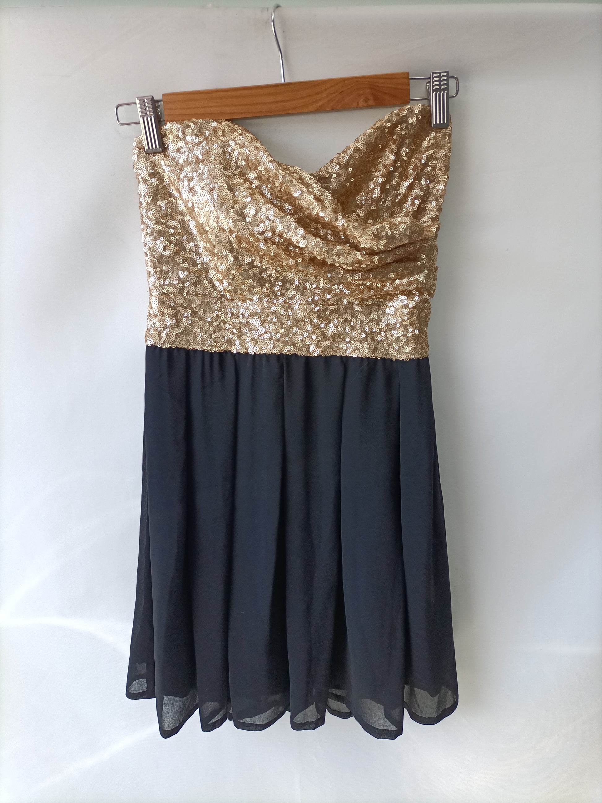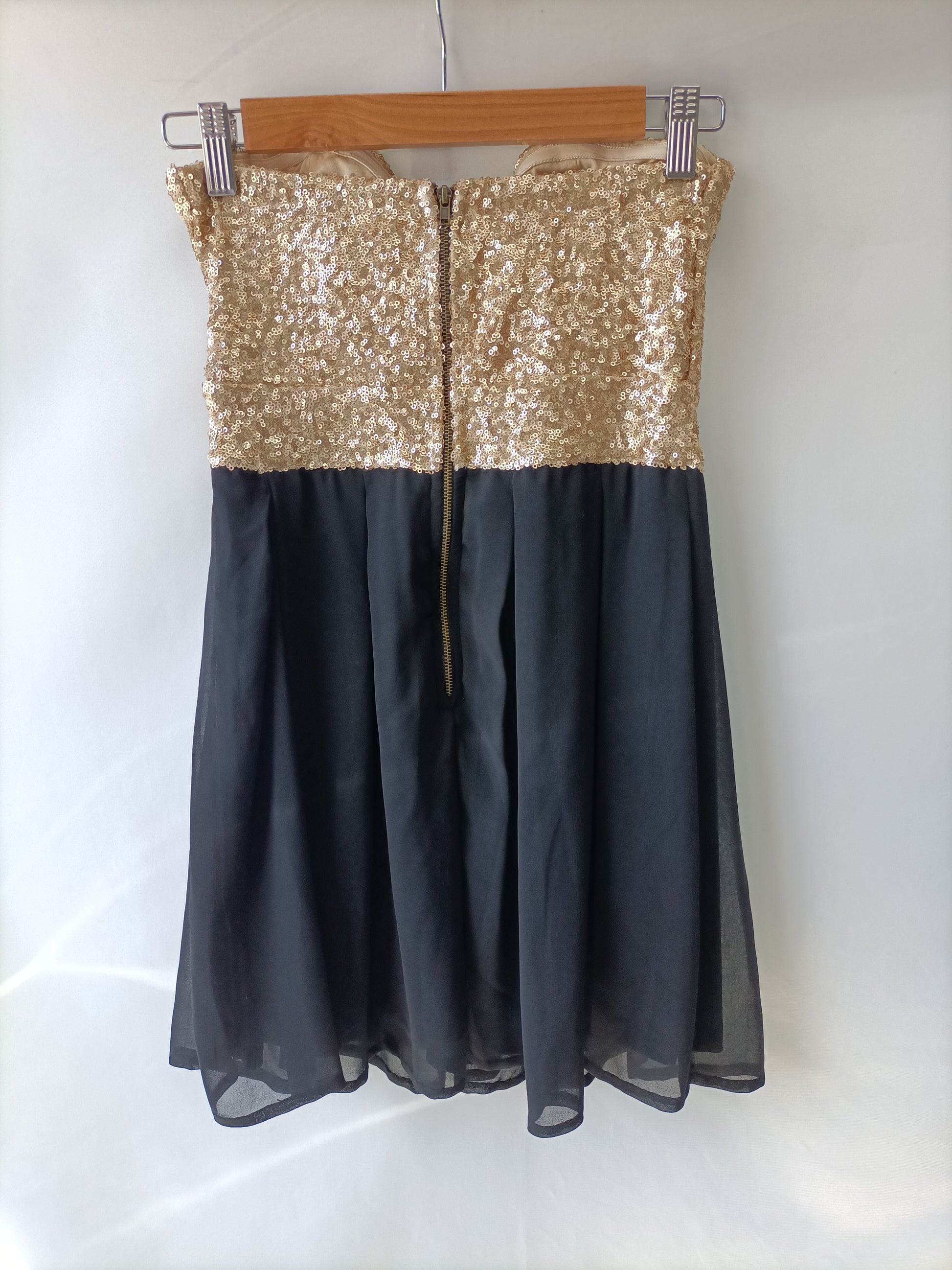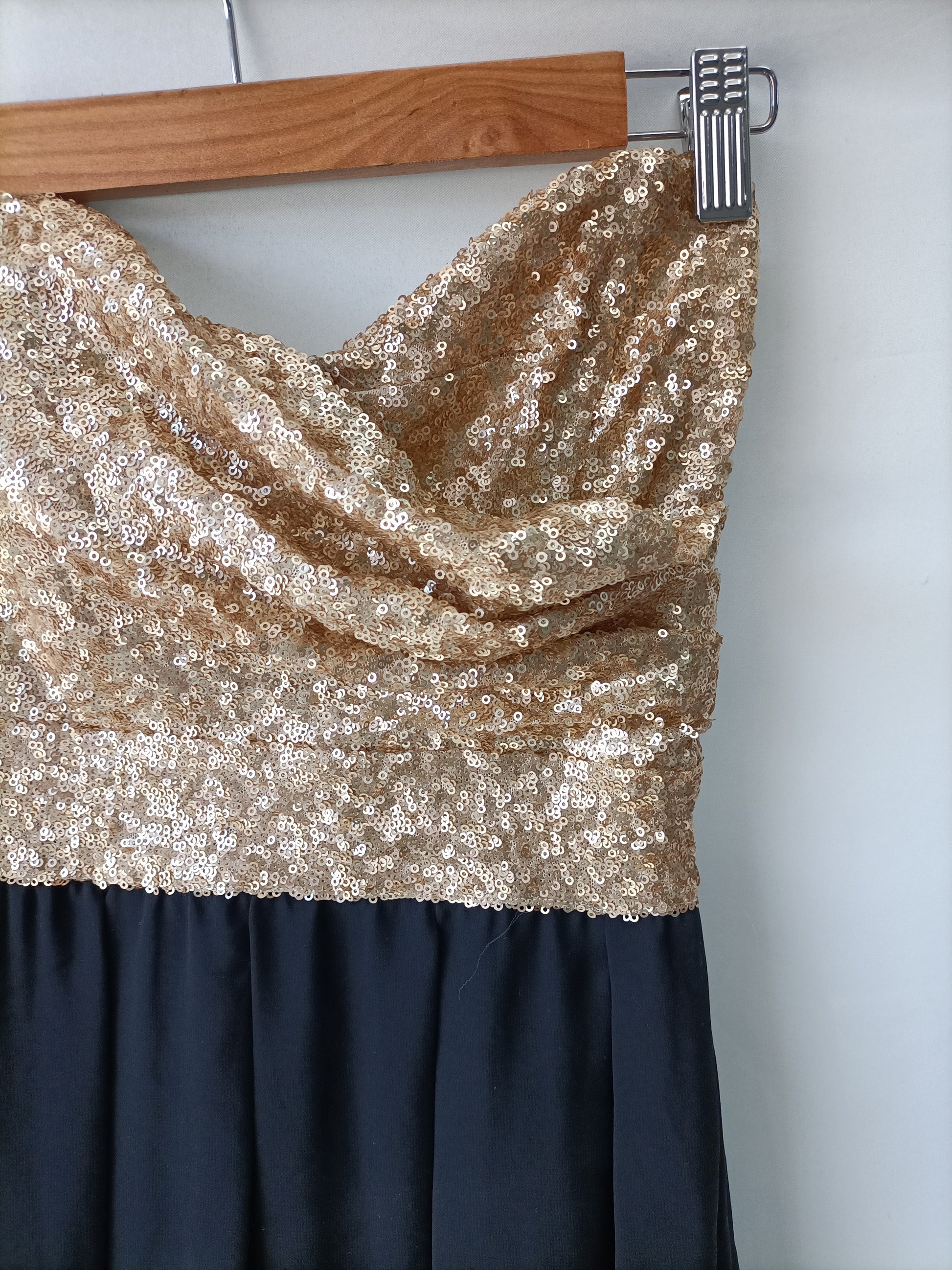 Vestido corto negro palabra de honor con el escote de lentejuelas doradas. Semielastico. Pecho 31 cm largo 58 cm