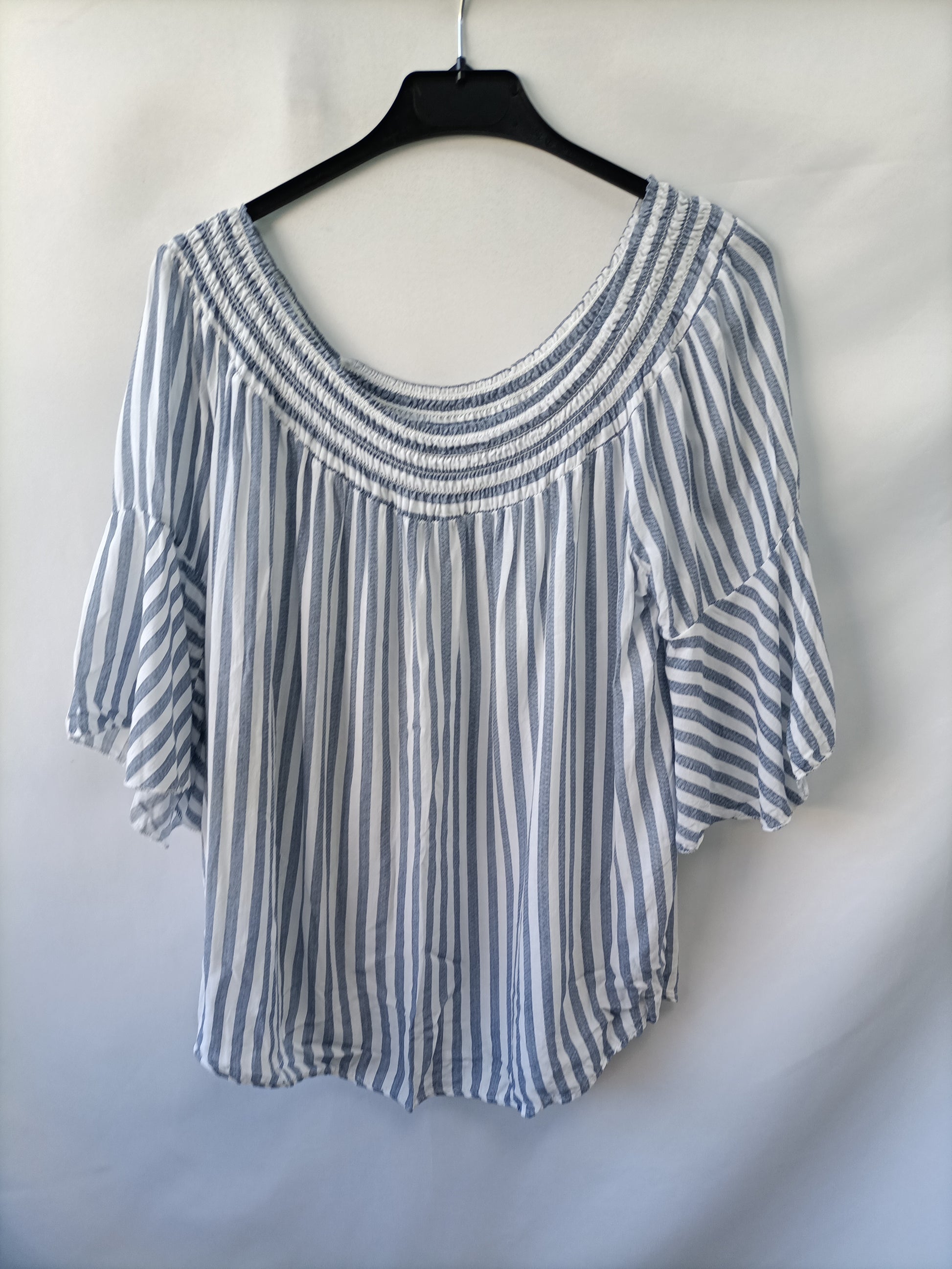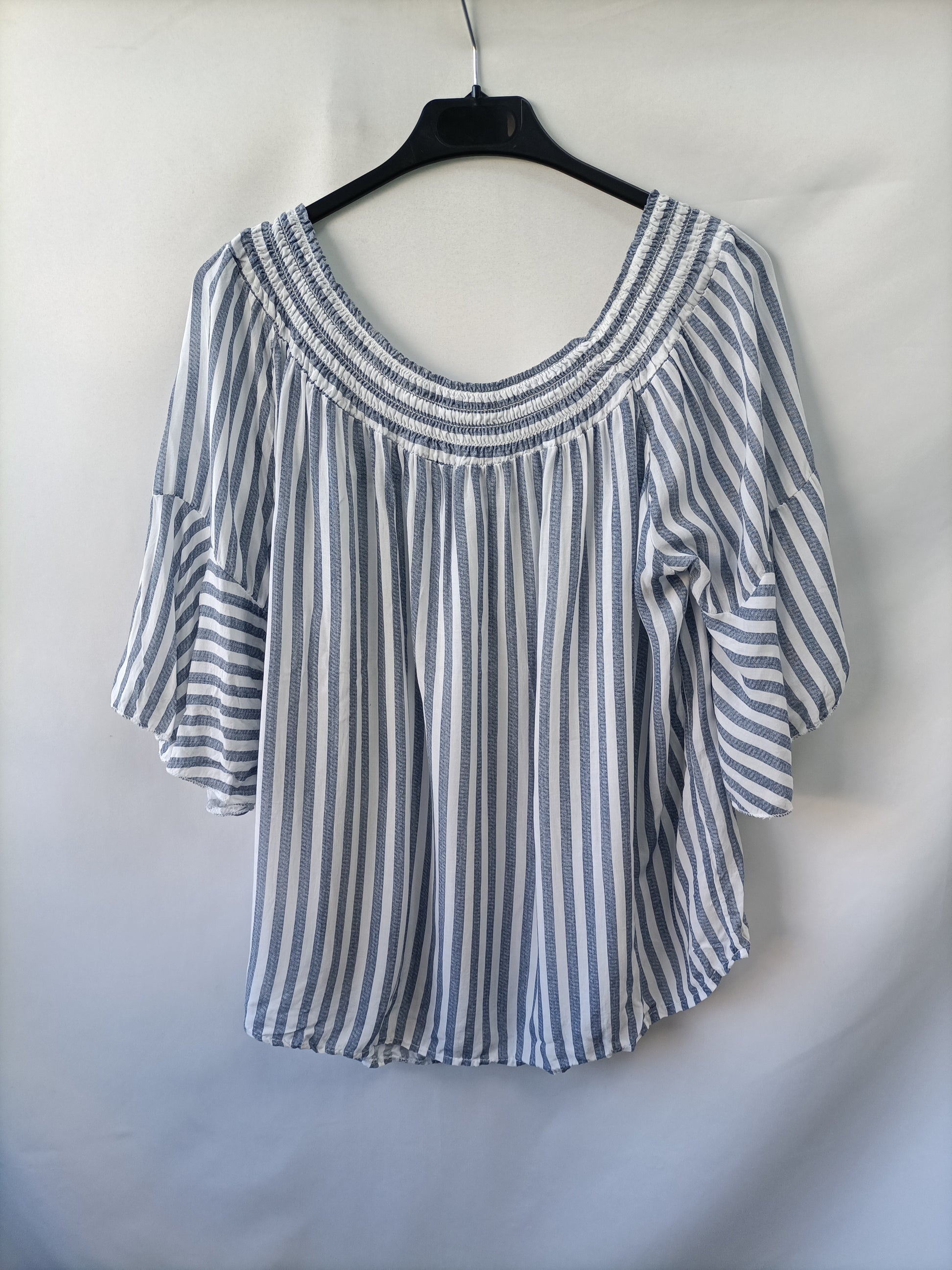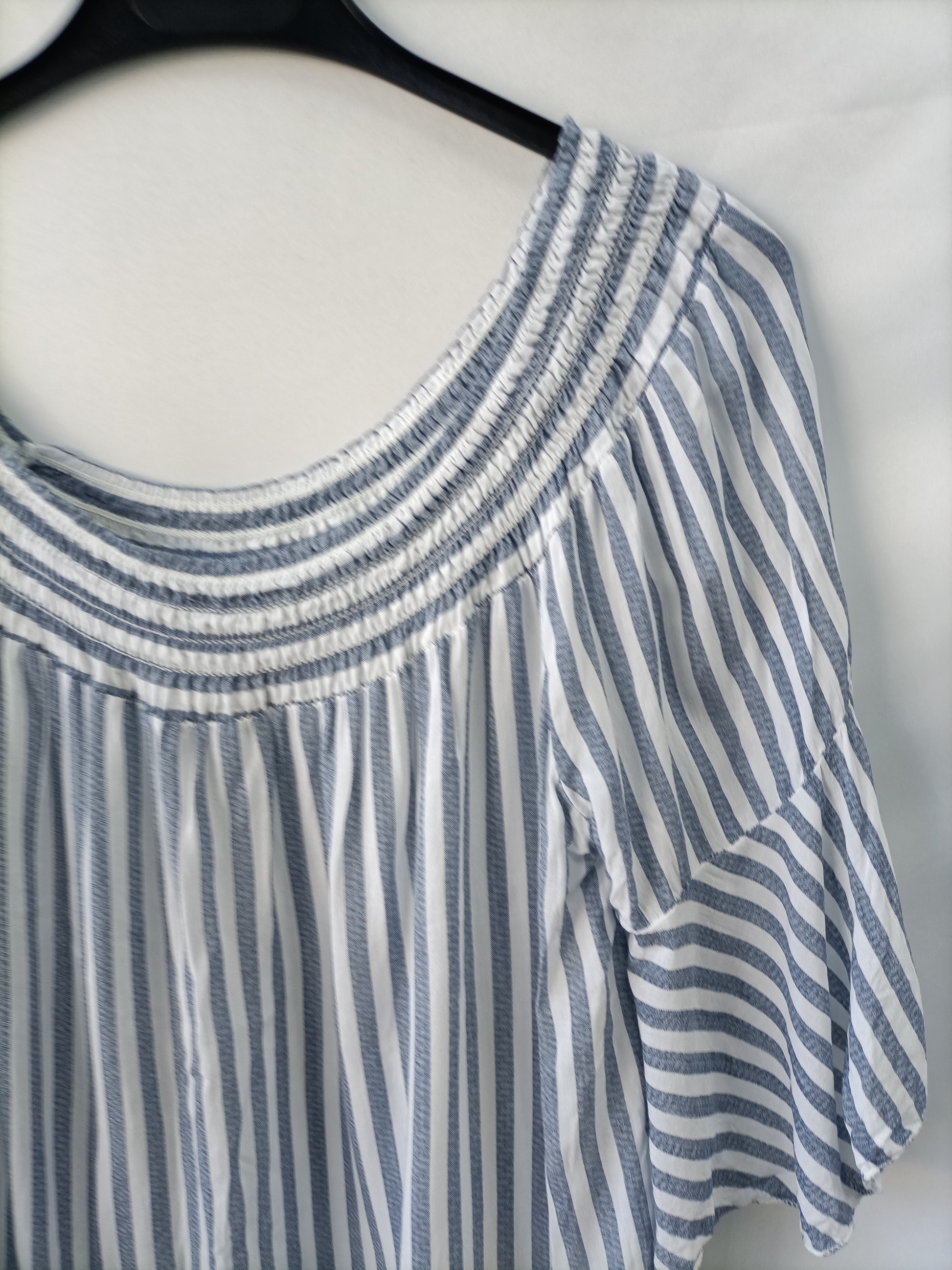 Top fluido de rayas azul y blanco con el cuello barco elástico. Largo 56 cm