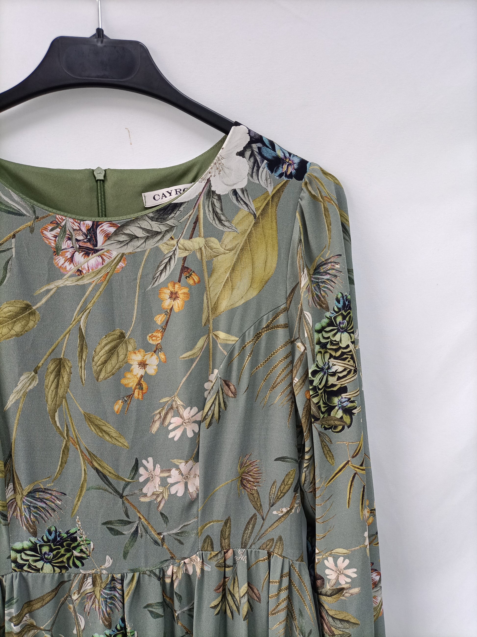 Vestido largo verde fluido con estampado de flores. No elástico. De sisa a sisa 40 cm Largo 146 cm