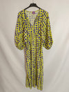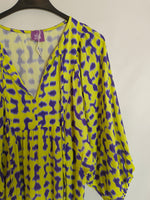 Vestido largo fluido con las mangas ligeramente abullonada amarillo y morado.