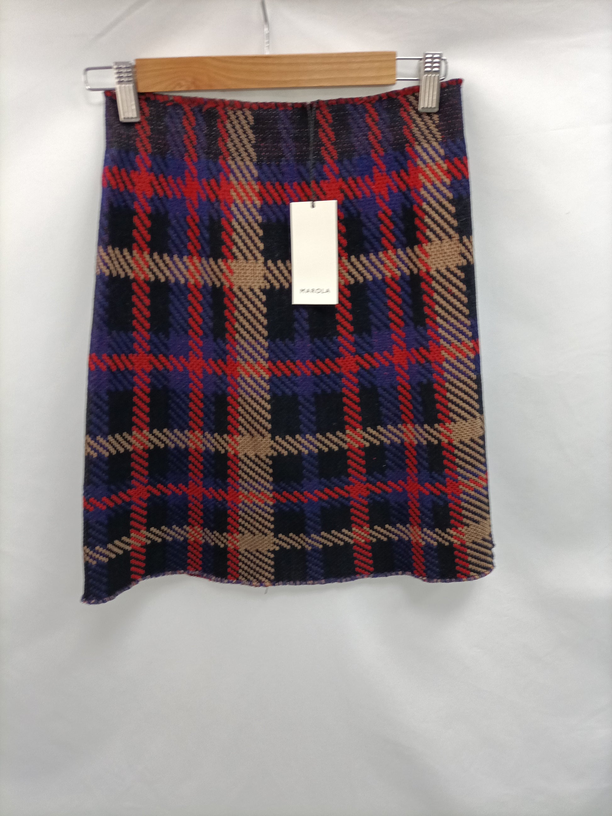 NUEVO CON ETIQUETA. Falda corta de cuadros en tonos azules, beiges y rojos, elastica. largo 50 cm