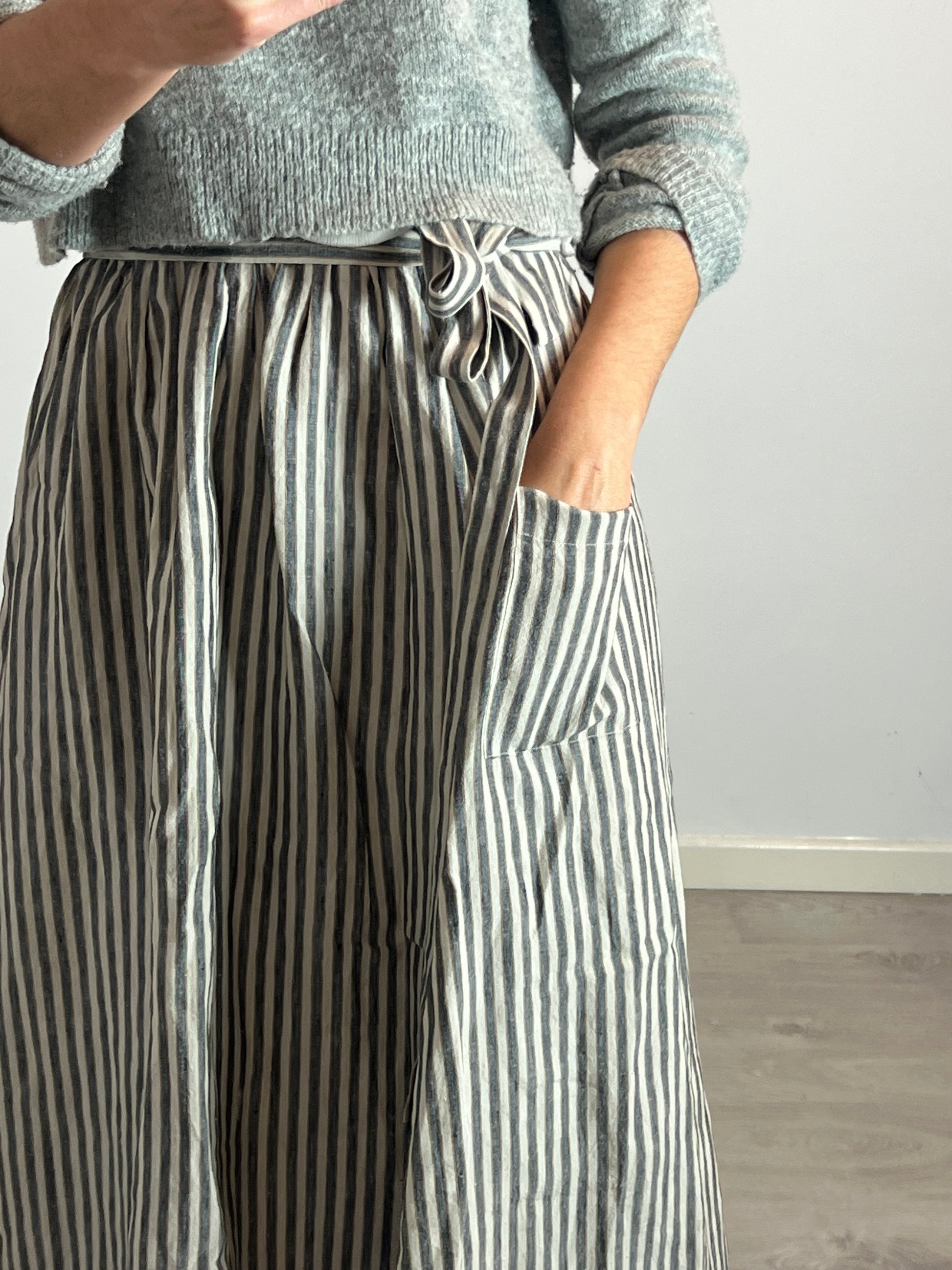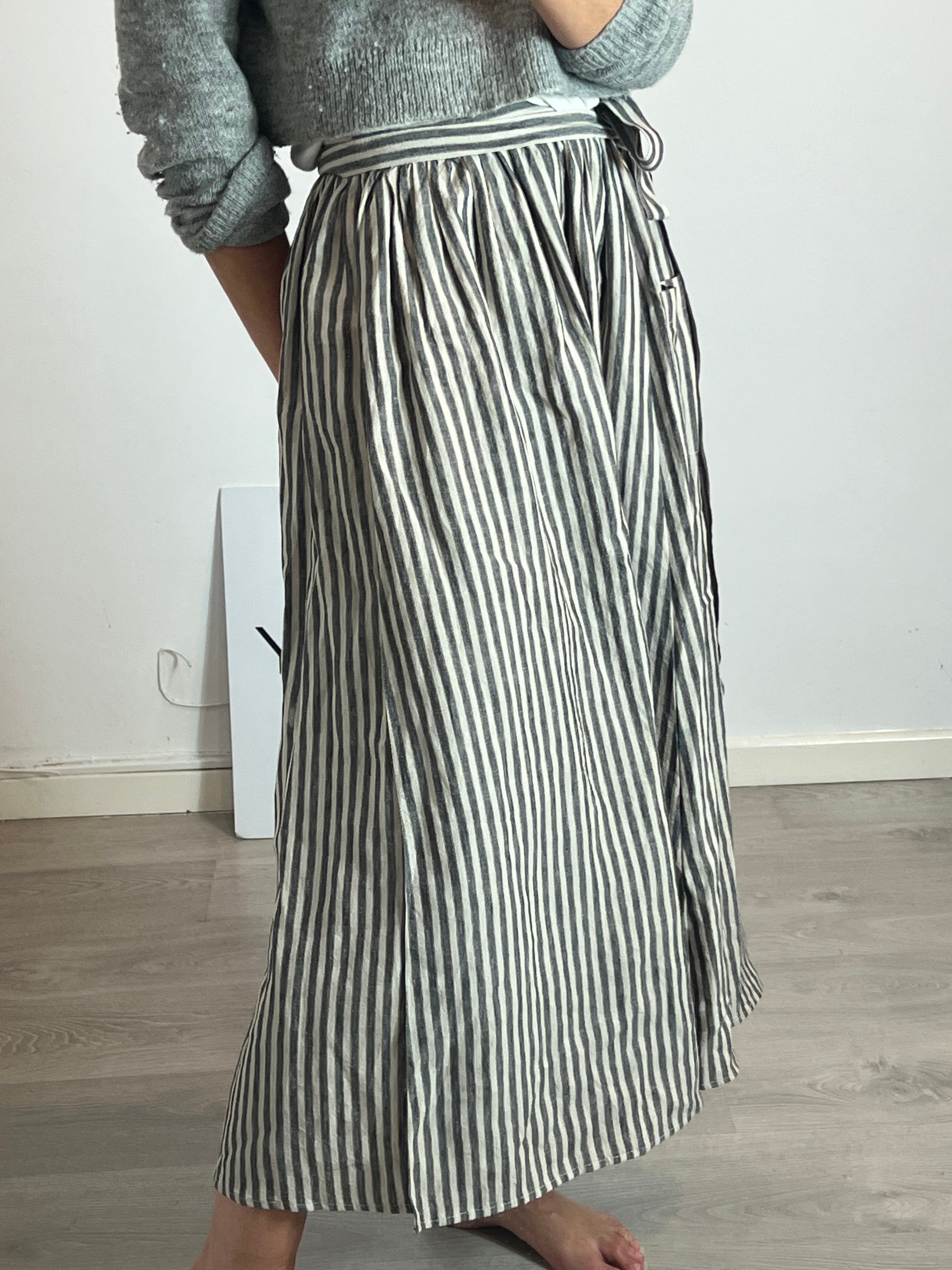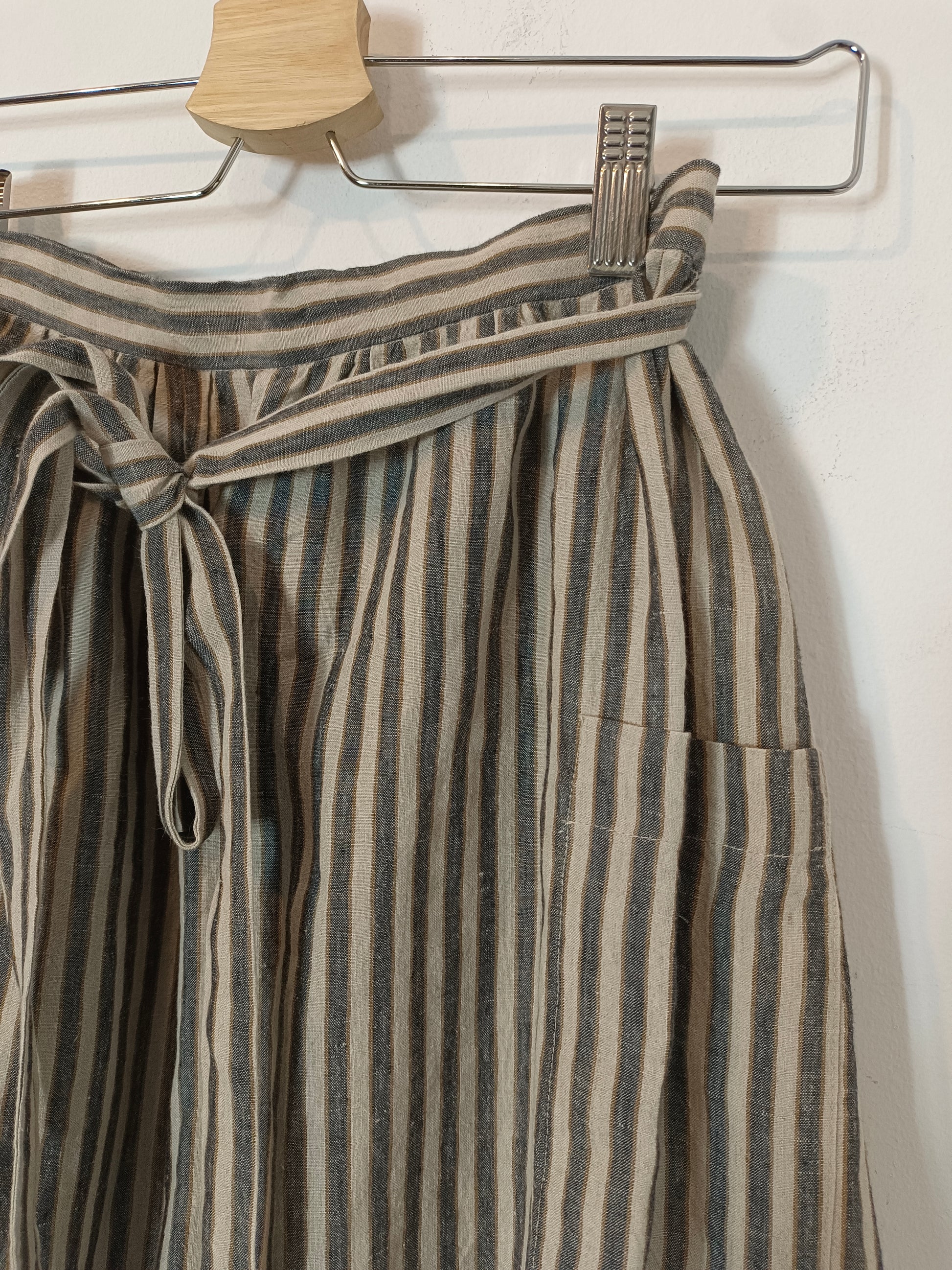 Falda midi lino rayas azul grisáceo y verde pistacho con vuelo Largo 89 cm. Estilo pareo cintura ajustable