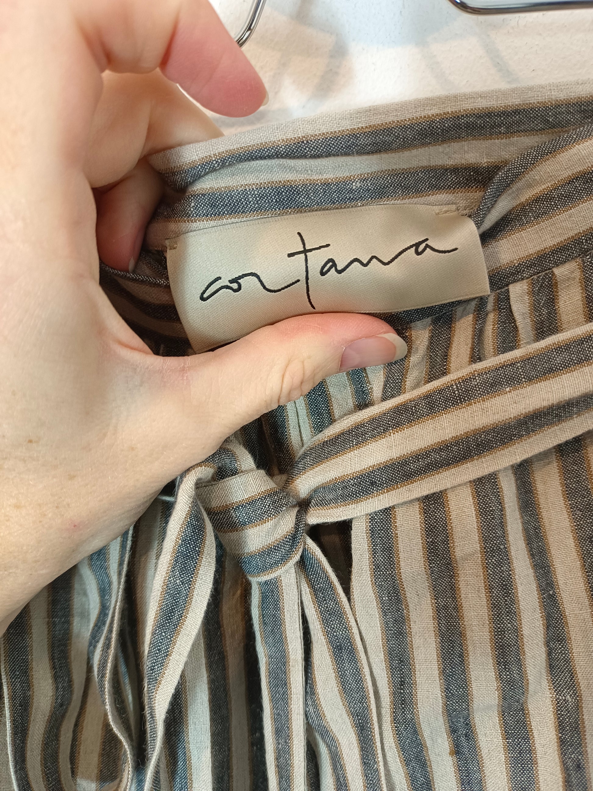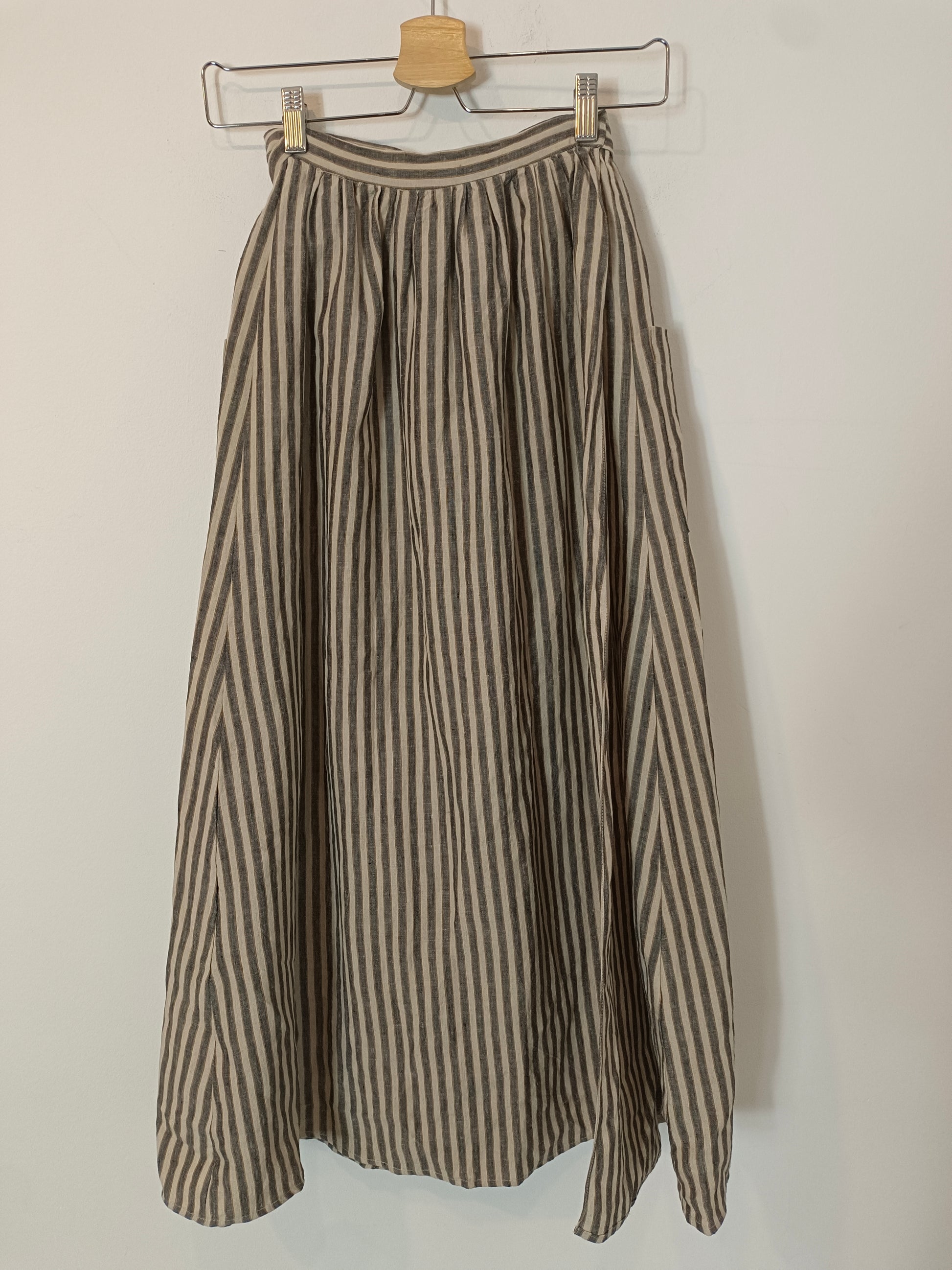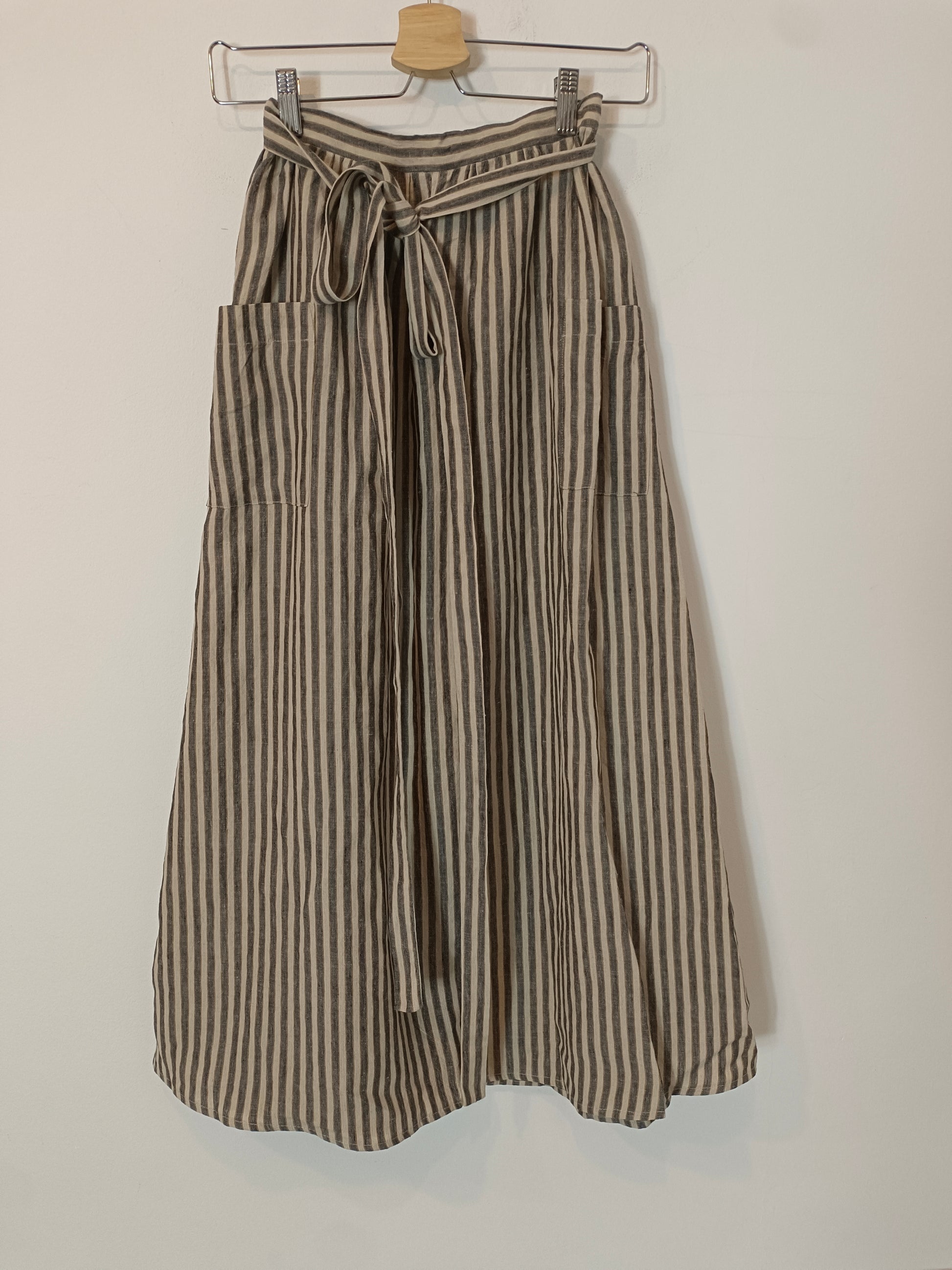 Falda midi lino rayas azul grisáceo y verde pistacho con vuelo Largo 89 cm. Estilo pareo cintura ajustable