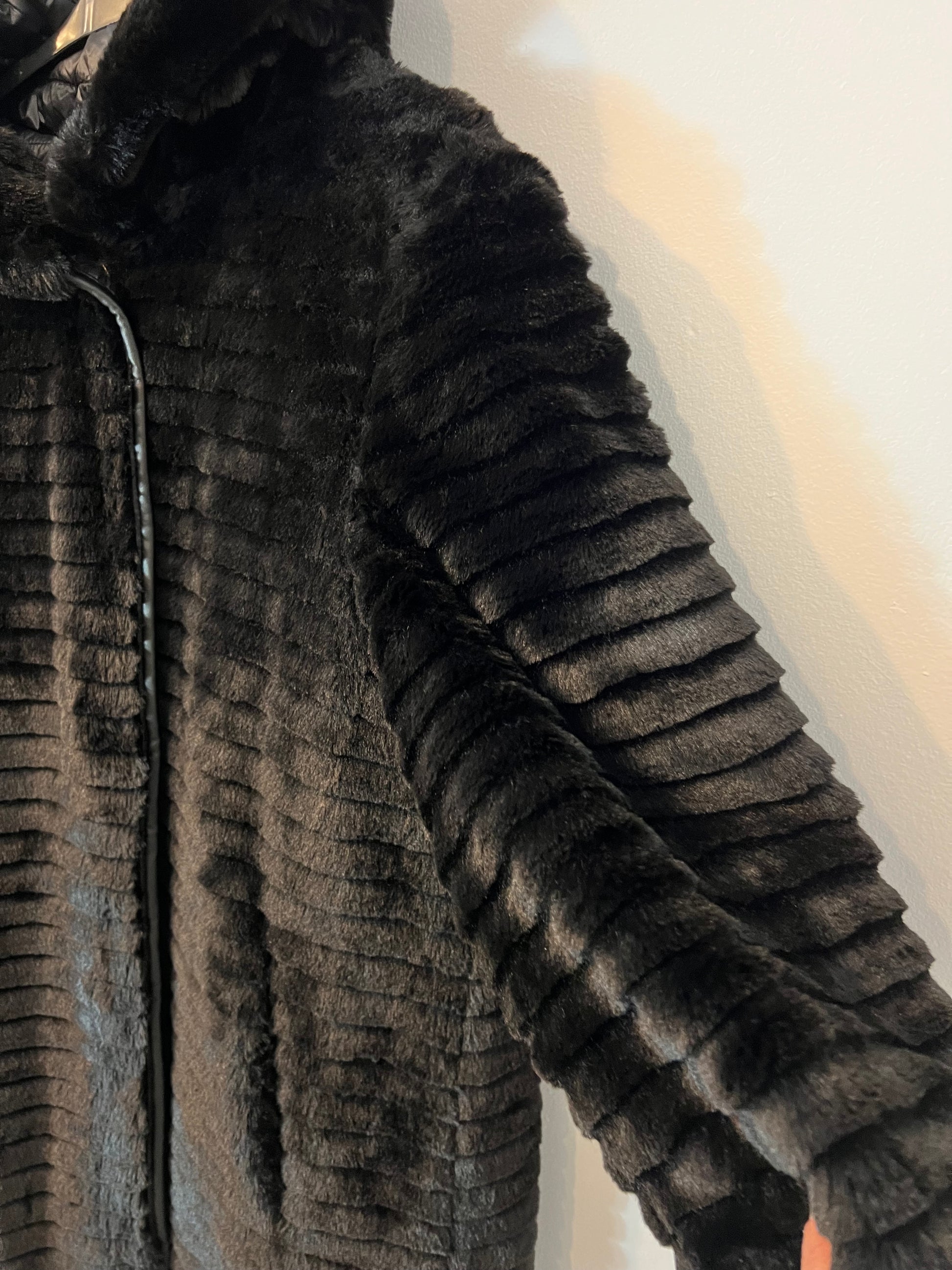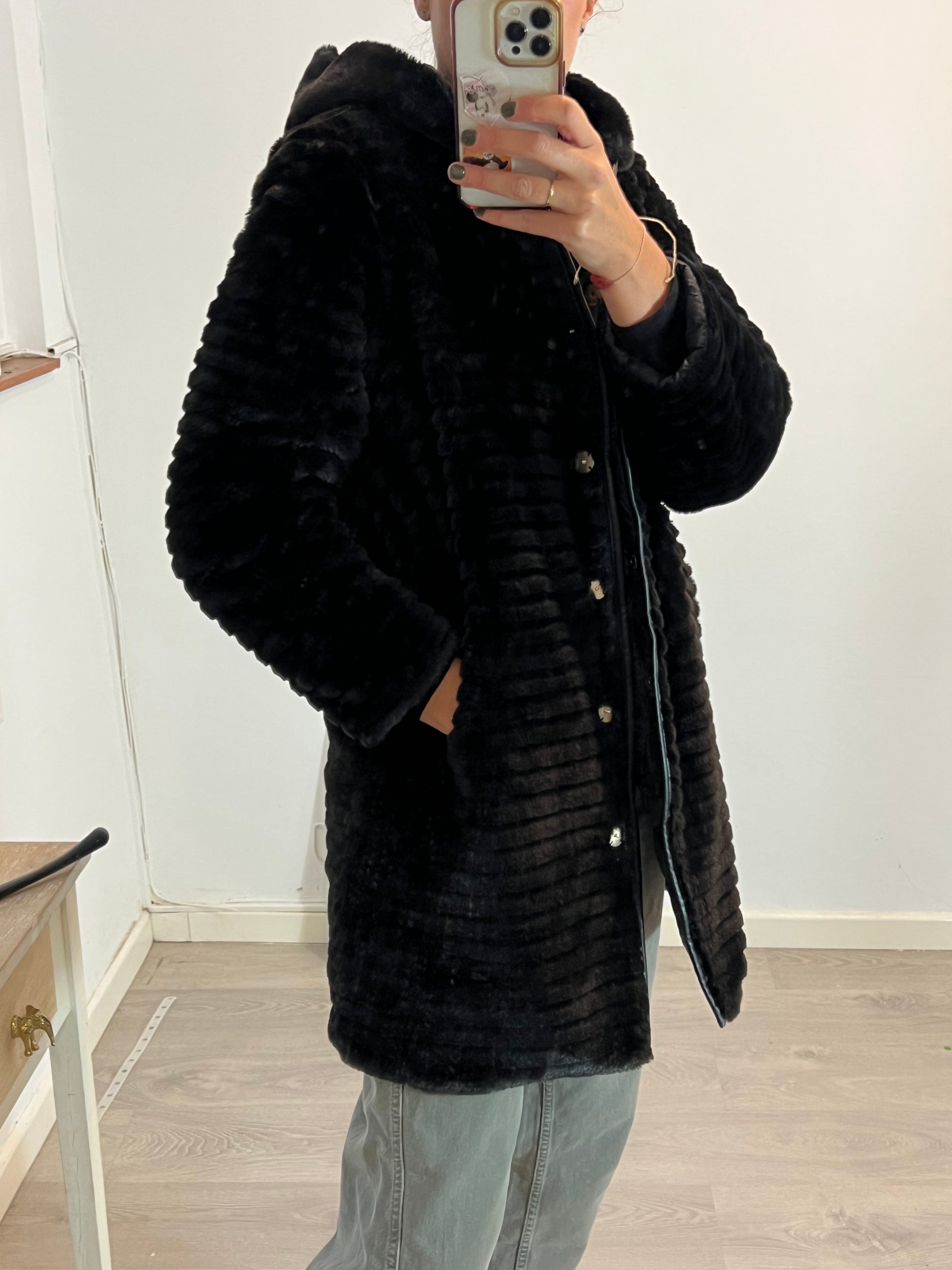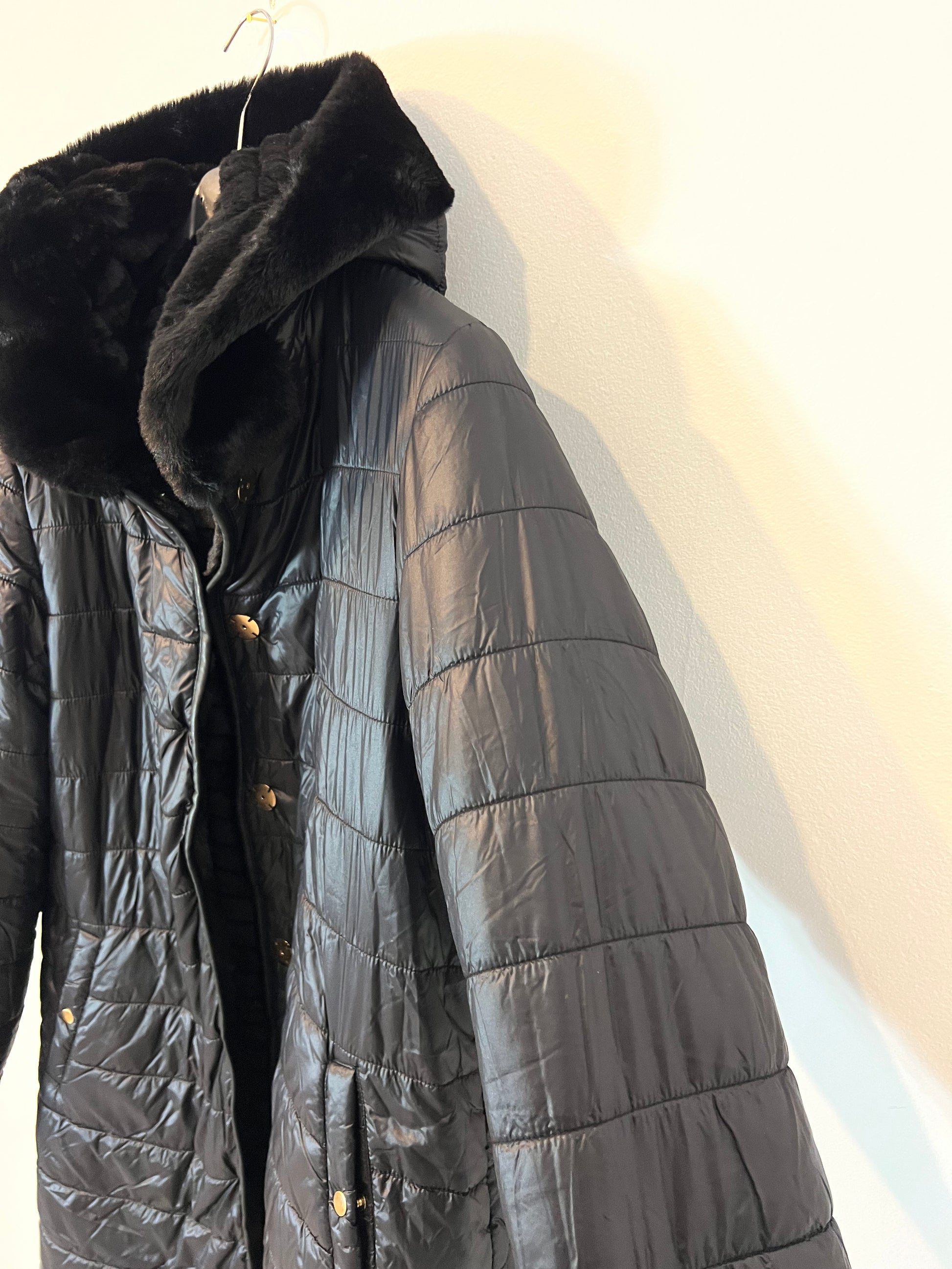 abrigo negro reservable de pelo sintético y plumas.  Largo 86cm