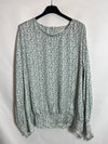 Blusa satinada estampada hojas blanca. Detalle fruncidos cintura y puños