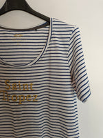 camiseta blanca y azul de rayas marineras