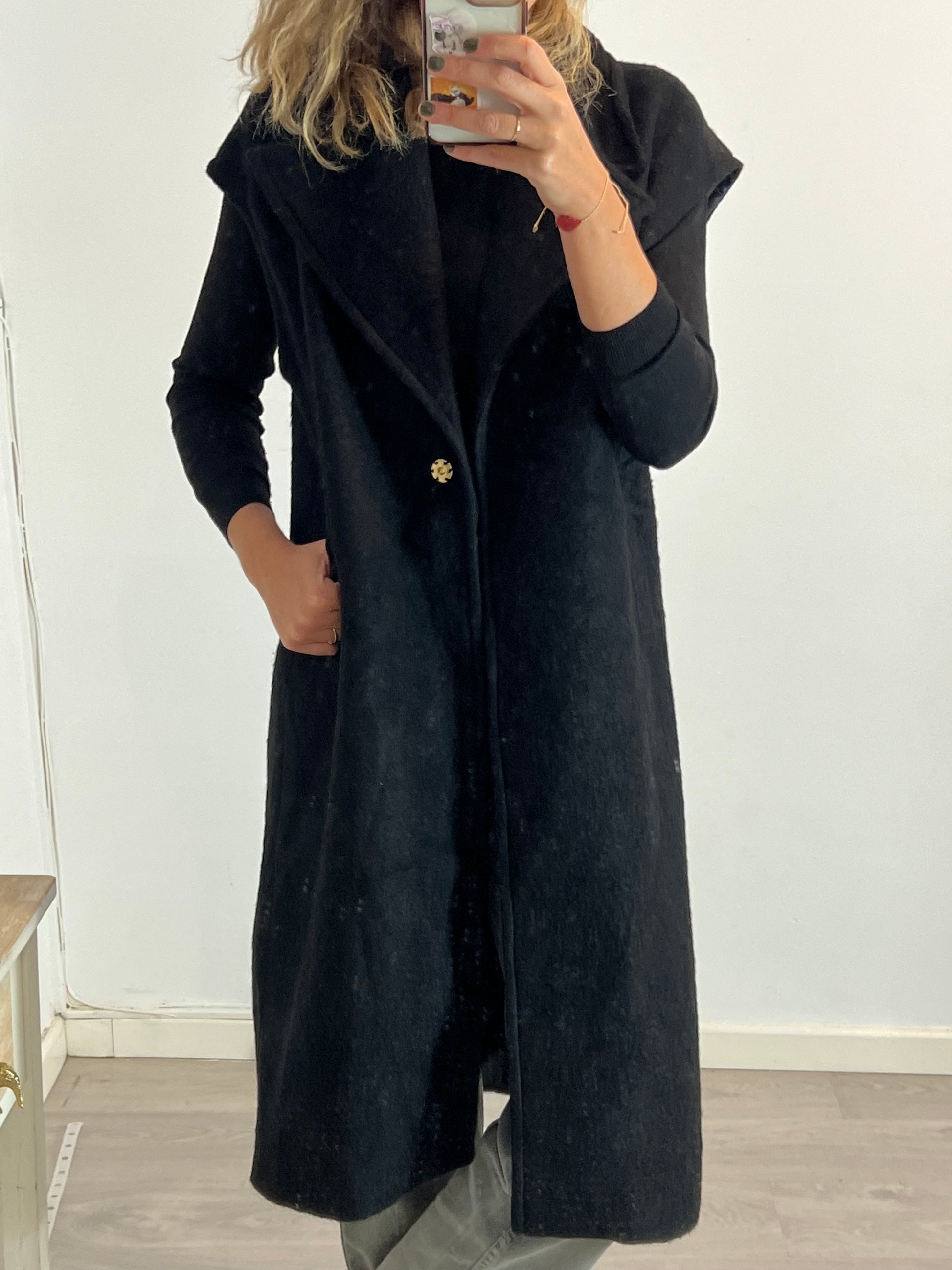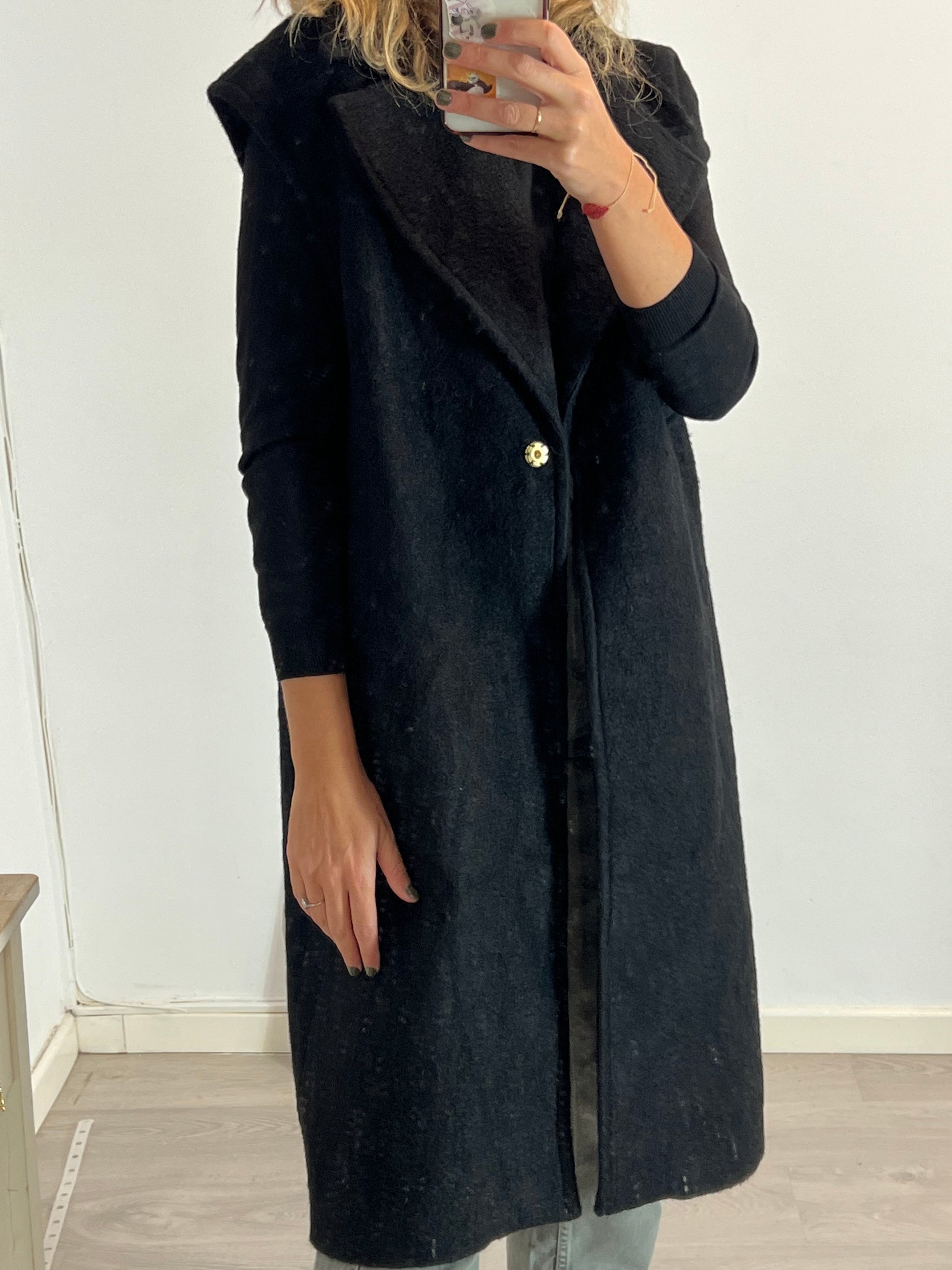 chaleco negro largo de textura. Largo 112cm
