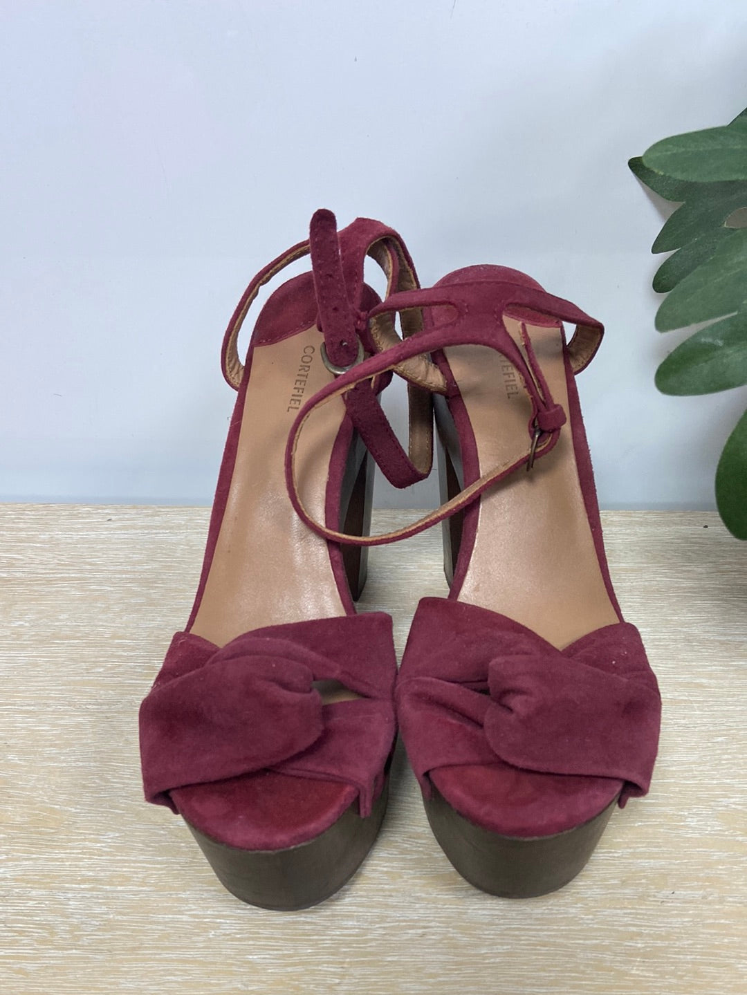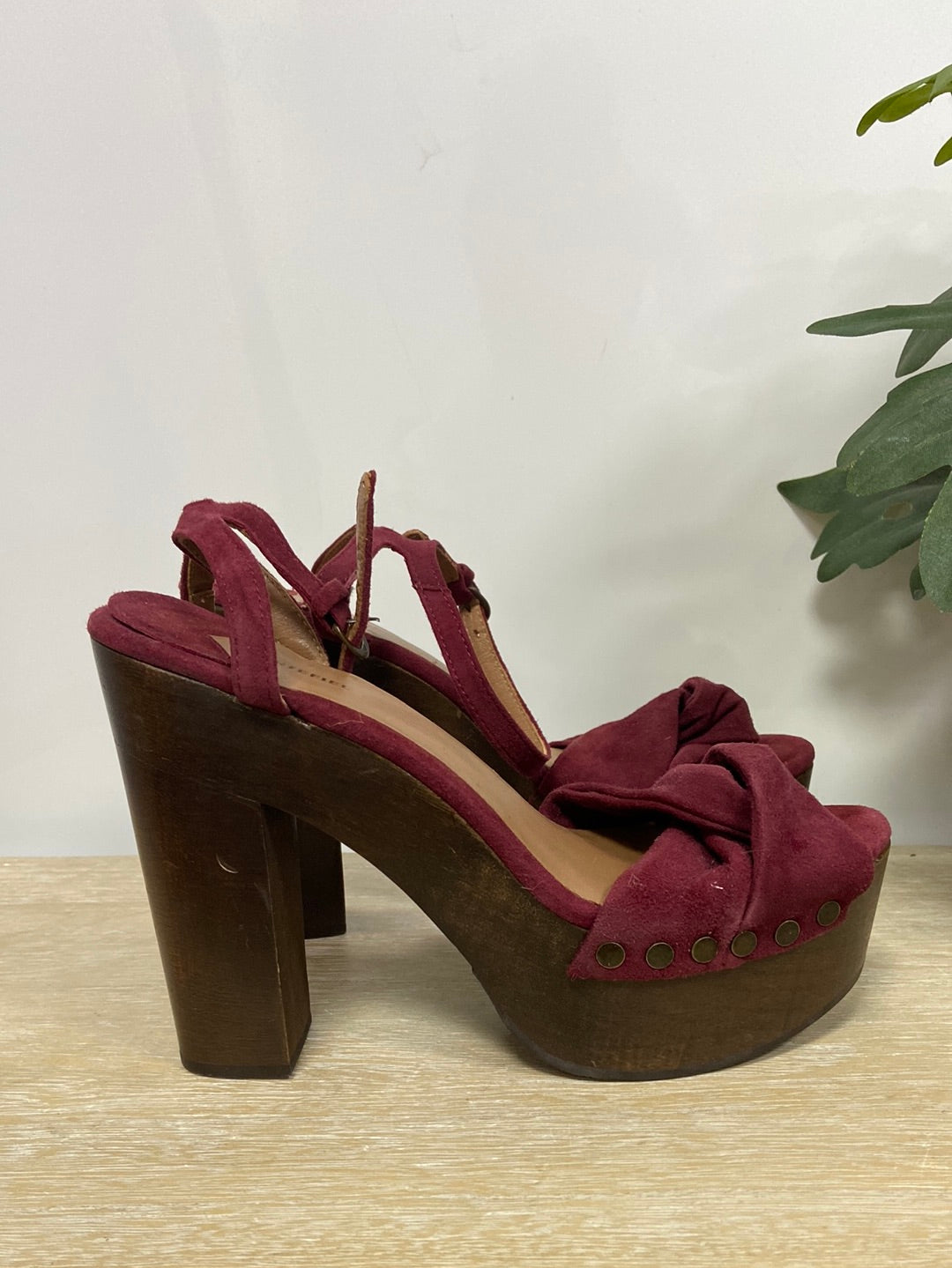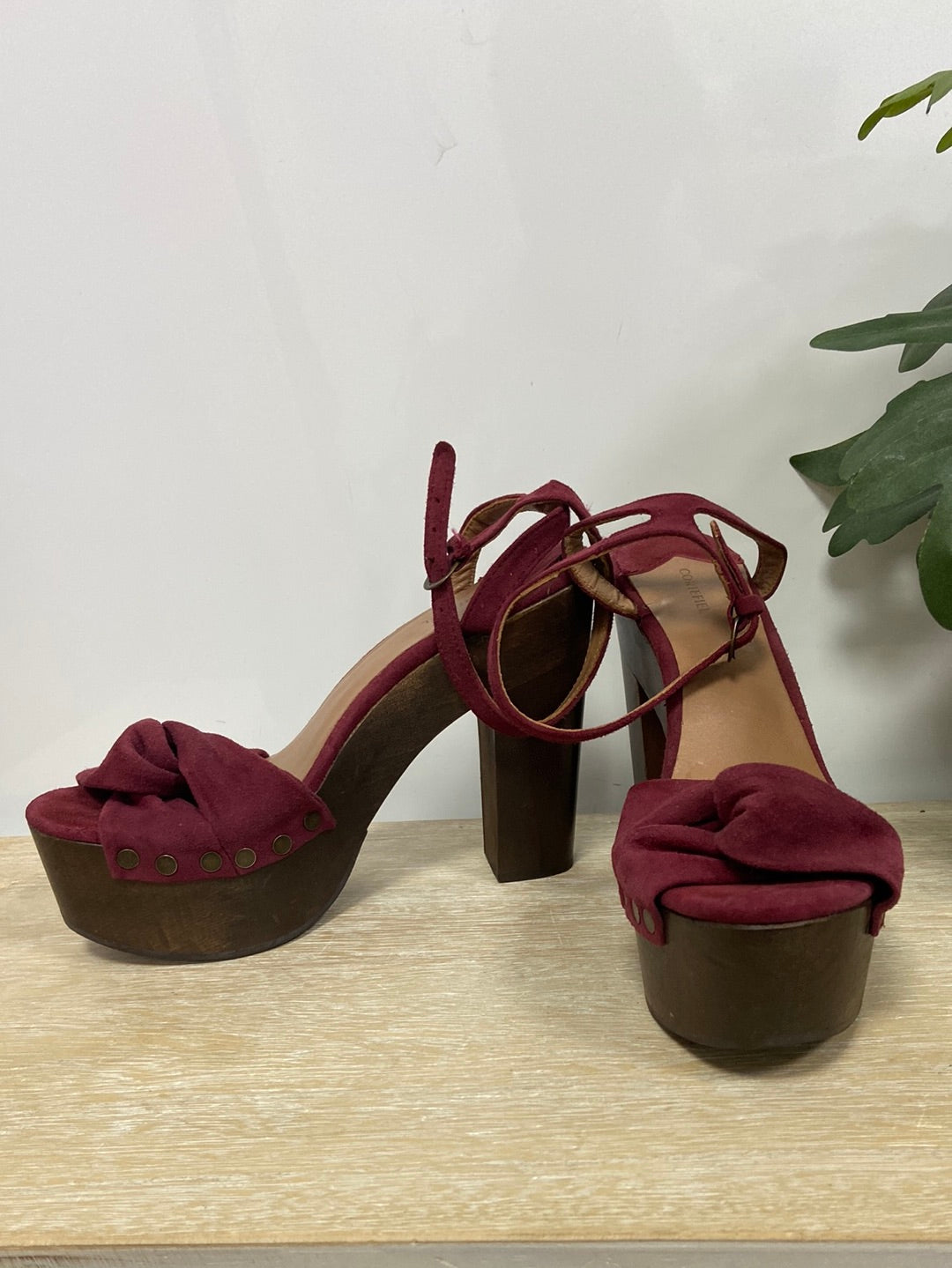 Plataformas burdeos de antelina con tacón y plataformas de madera.