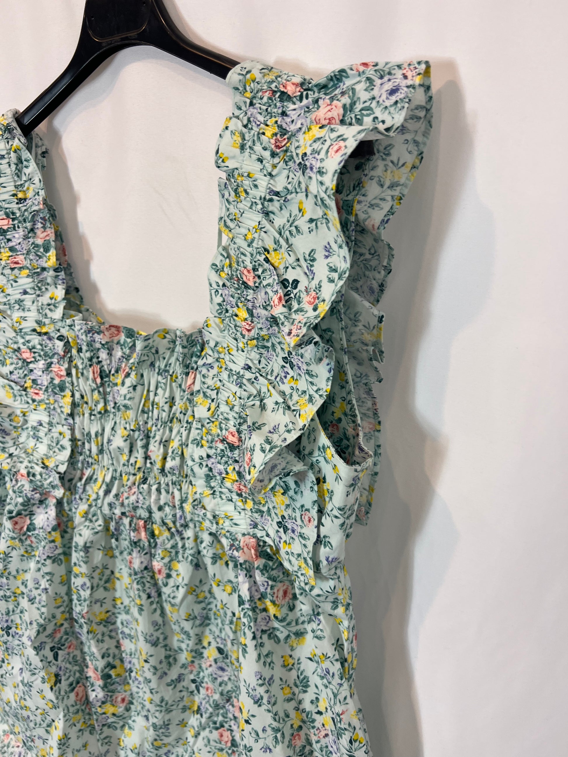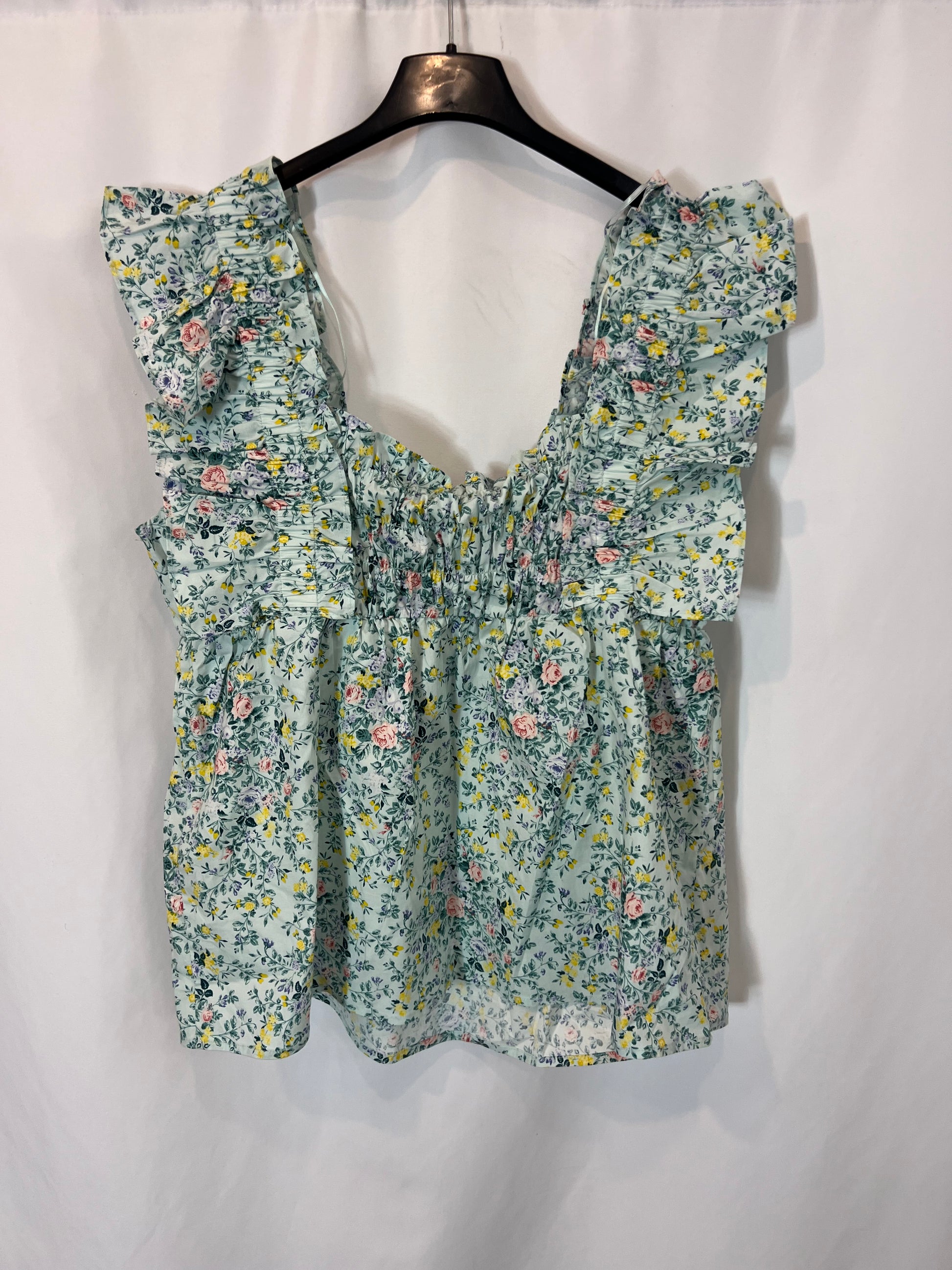 top azul estampado de flores y detalle de volantes . De sisa a sisa 49cm, largo 49cm. Talla como una m