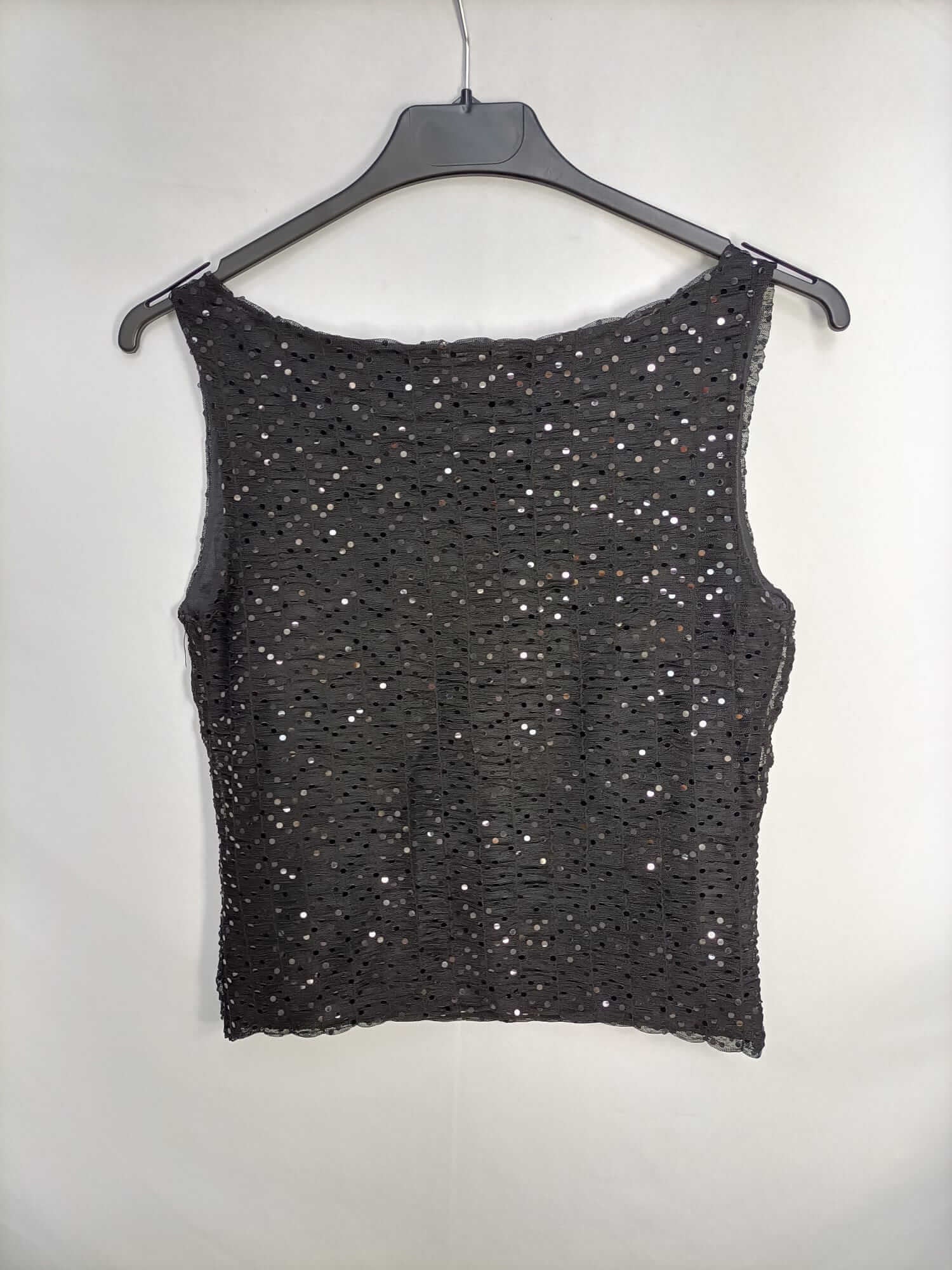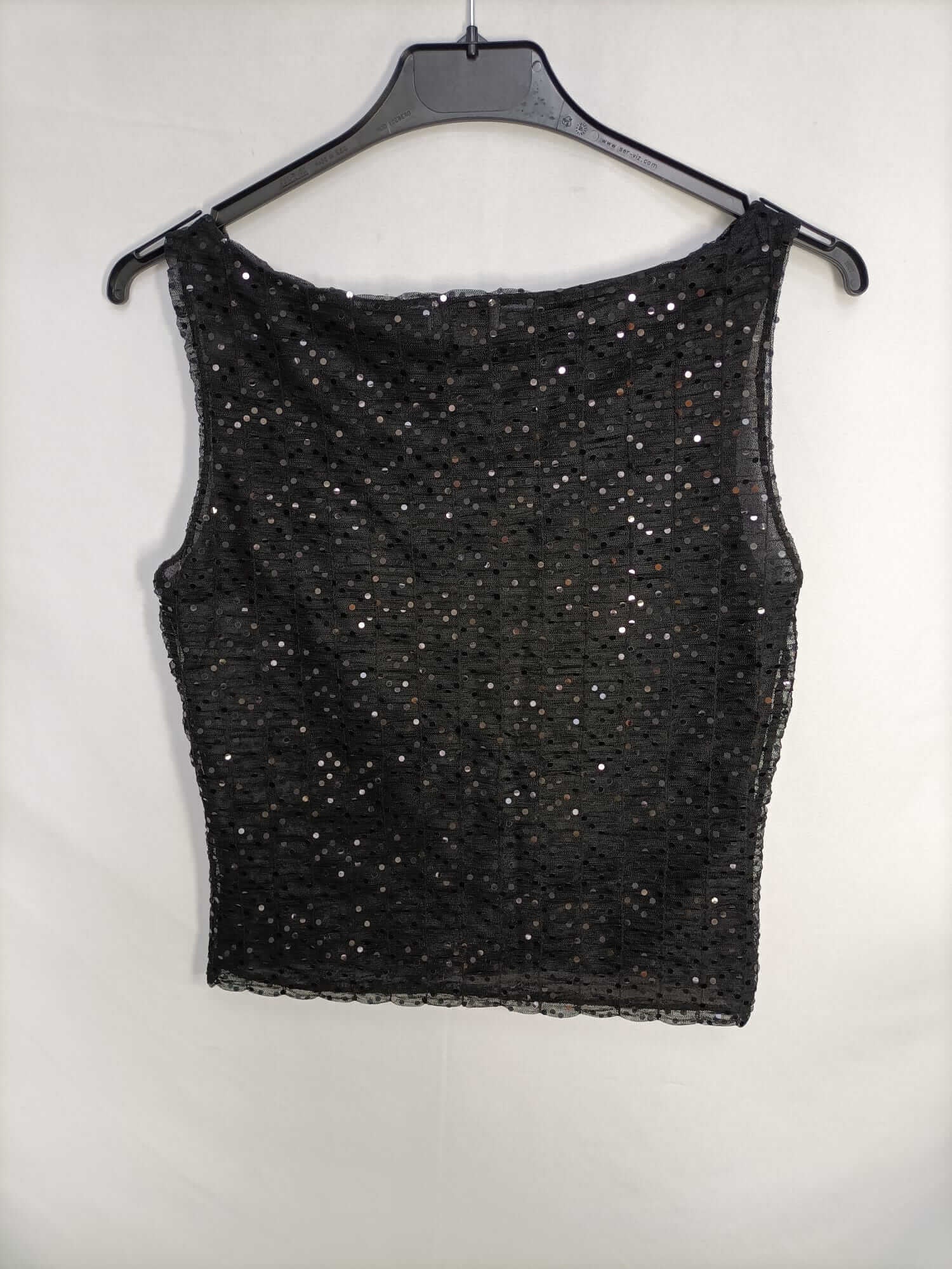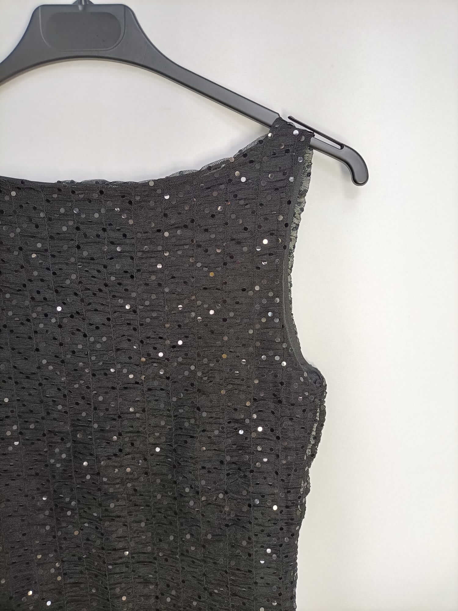 Cortefiel. S. Top negro ajustado y fruncido con lentejuelas. Elastico. Largo 45 cm