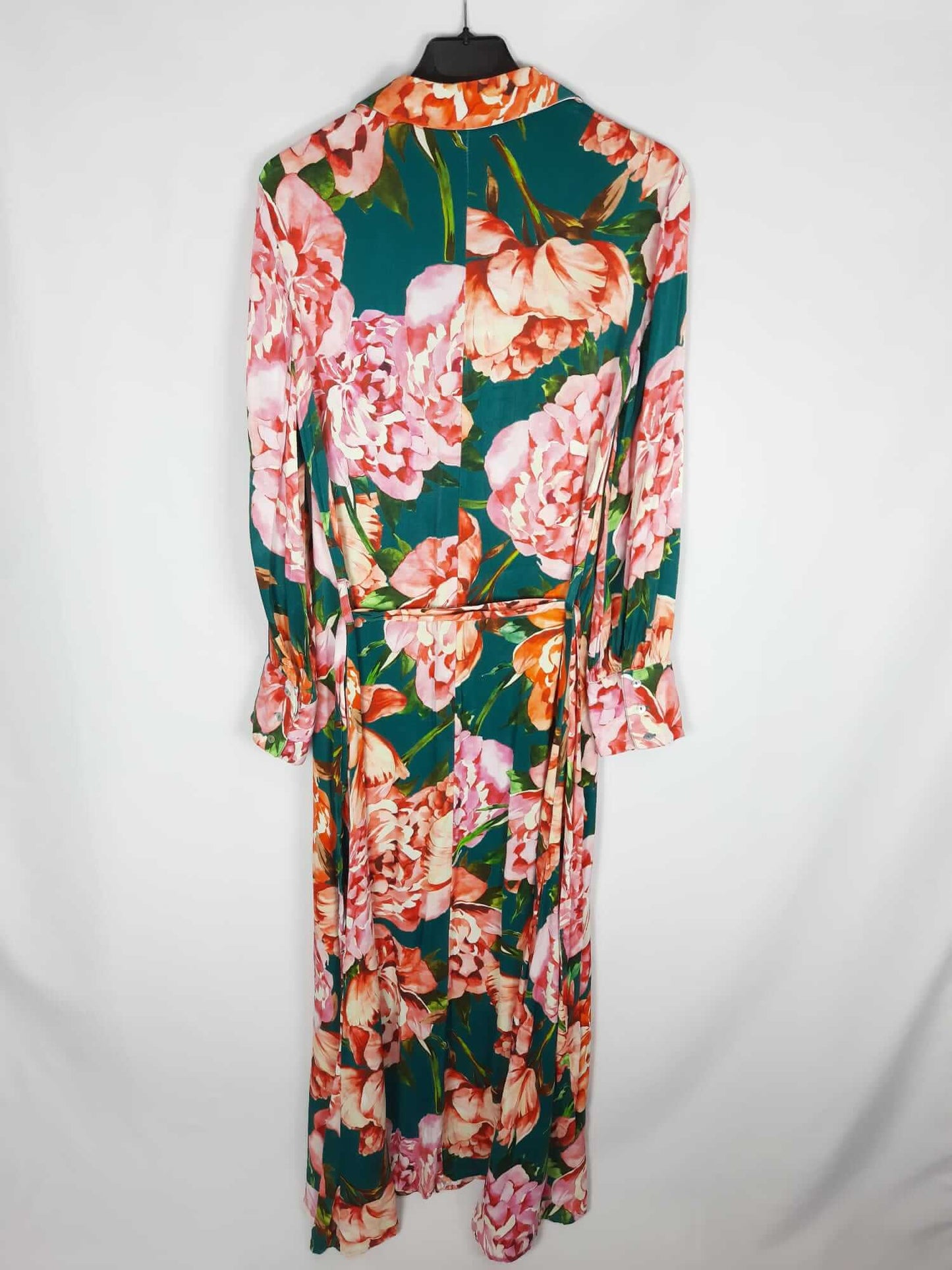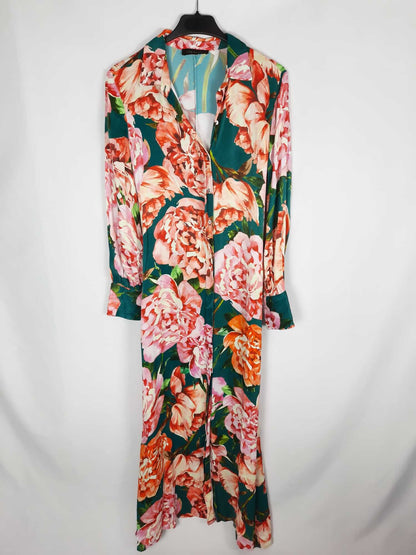 Cortefiel. Vestido largo camisero de tejido tipo seda. Abotonado y con lazada. Fluido y fino. De sisa a sisa 48 cm largo 138 cm