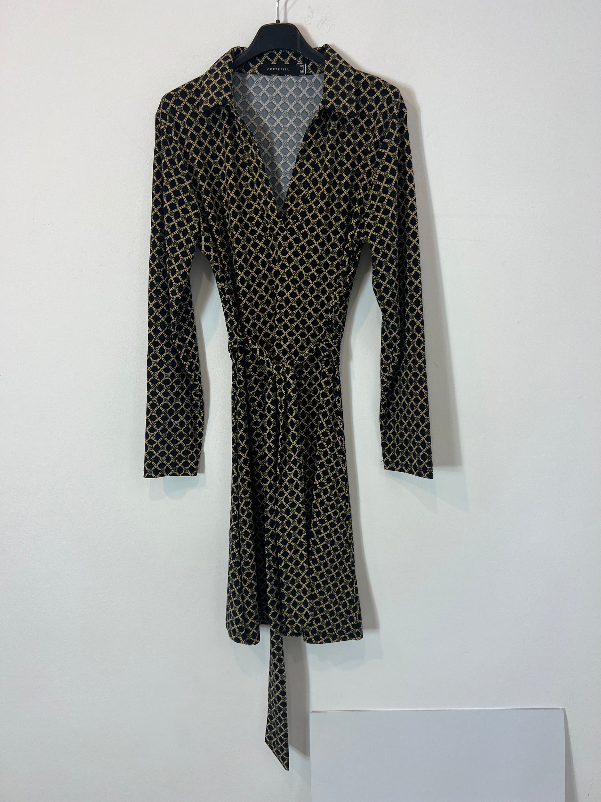 Vestido corto elástico negro con estampado de cadenas. Cinturón incorporados