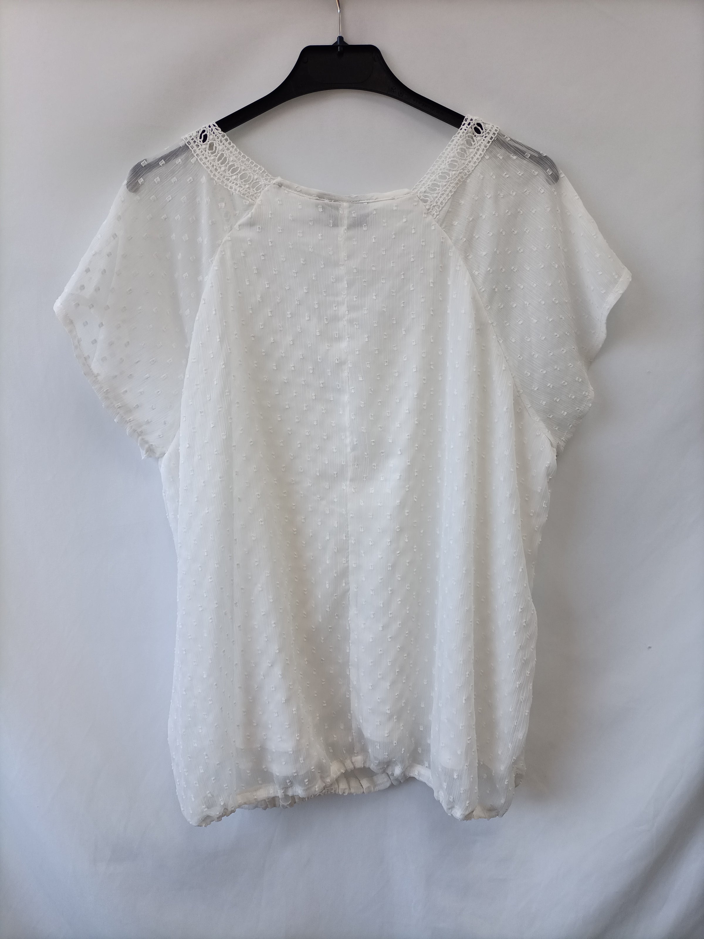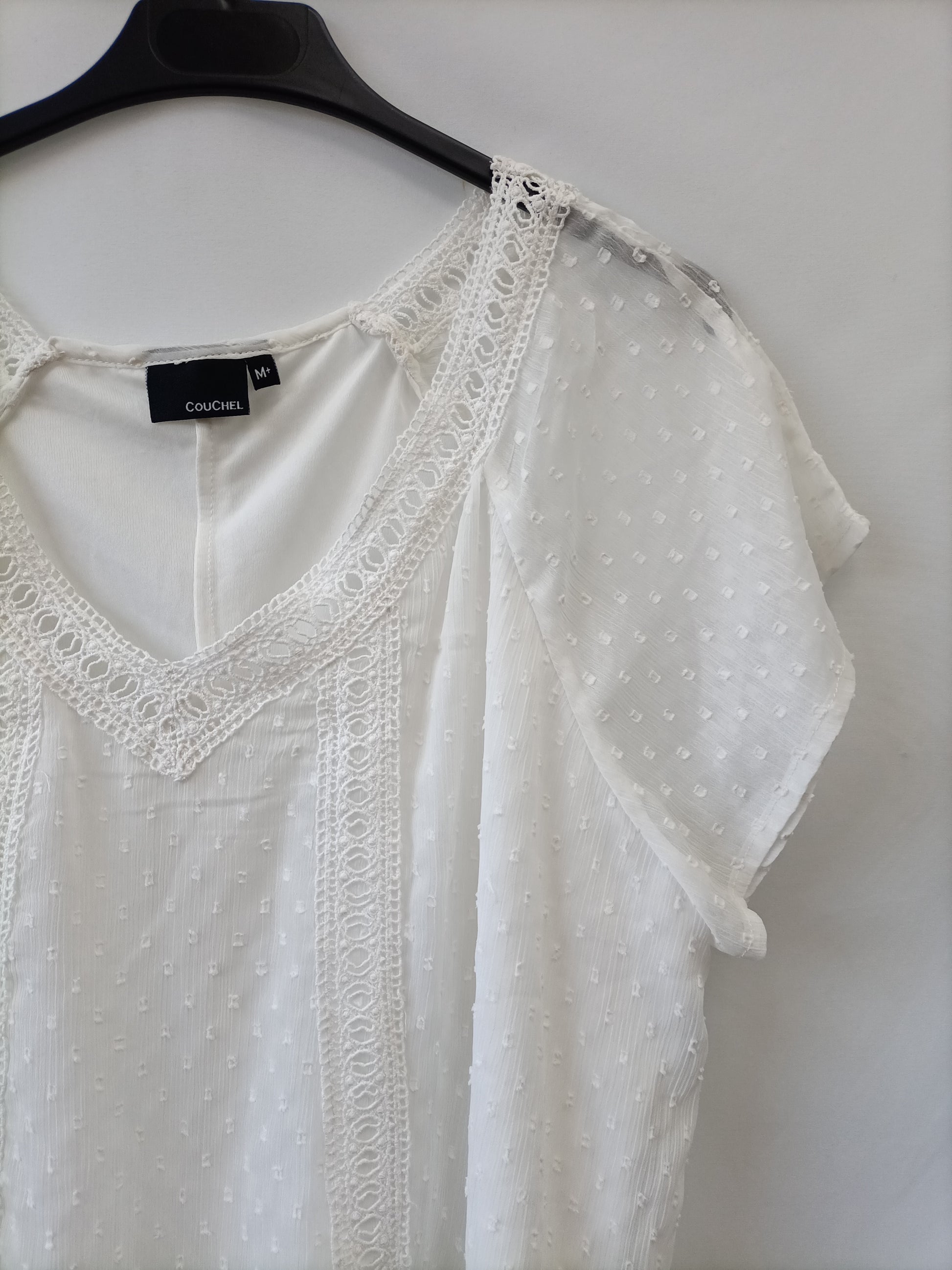 Blusa fluida blanca de plumeti y croché y manga corta.