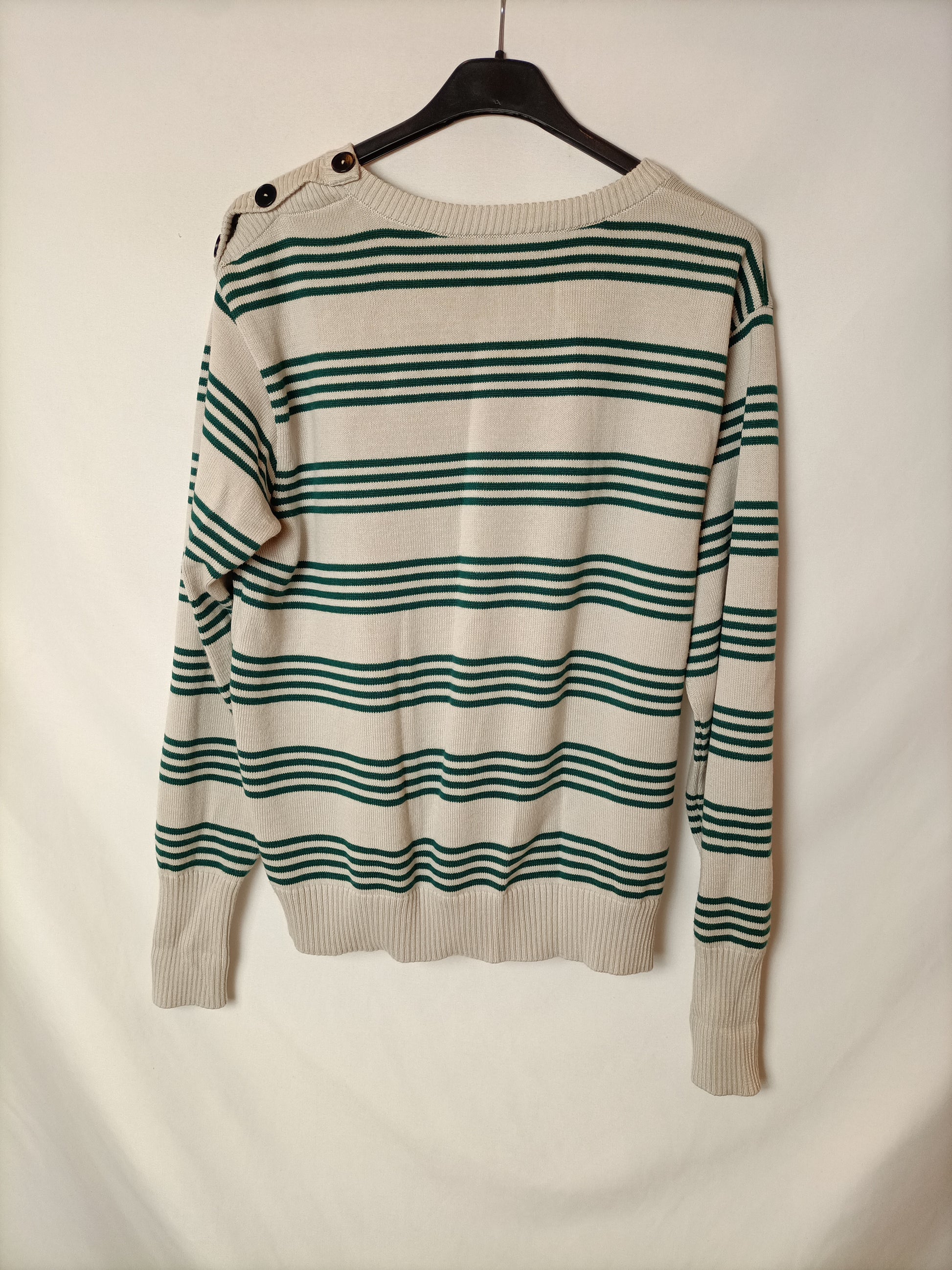 NUEVO CON ETIQUETA. Jersey beige con rayas verdes. Botones en el hombro.