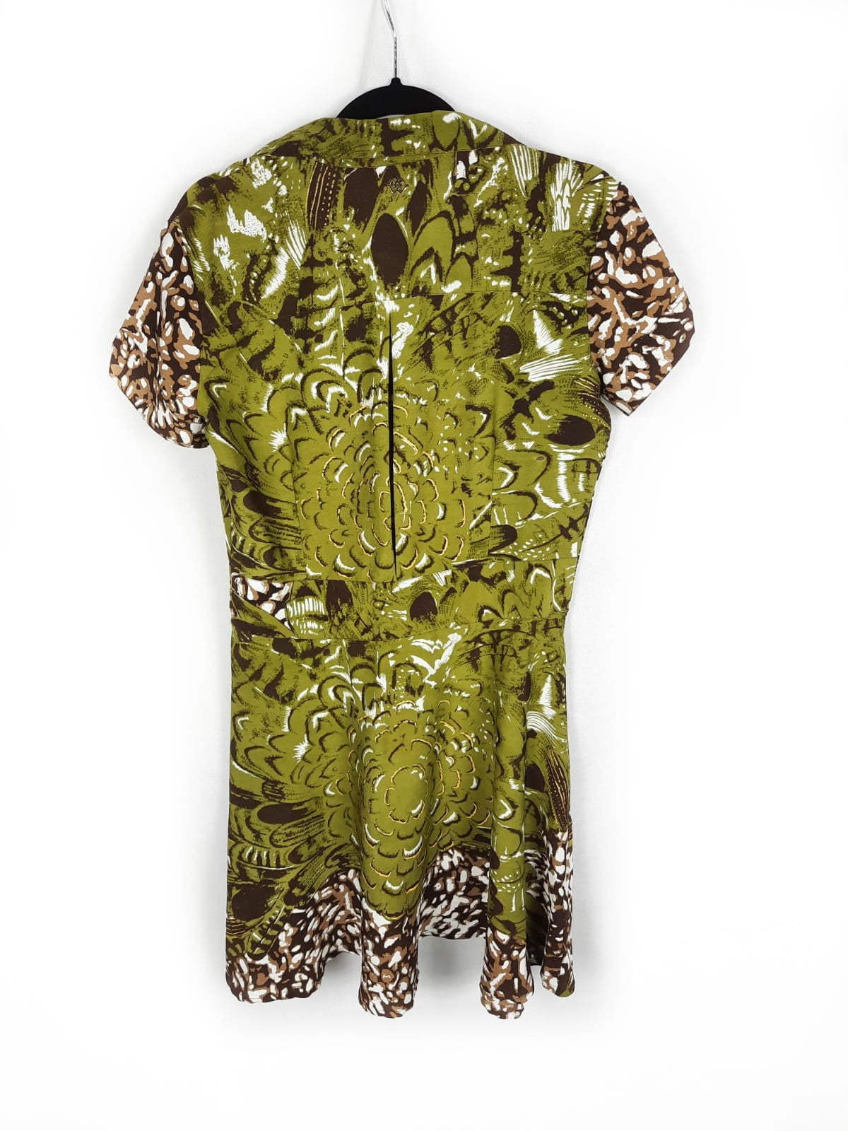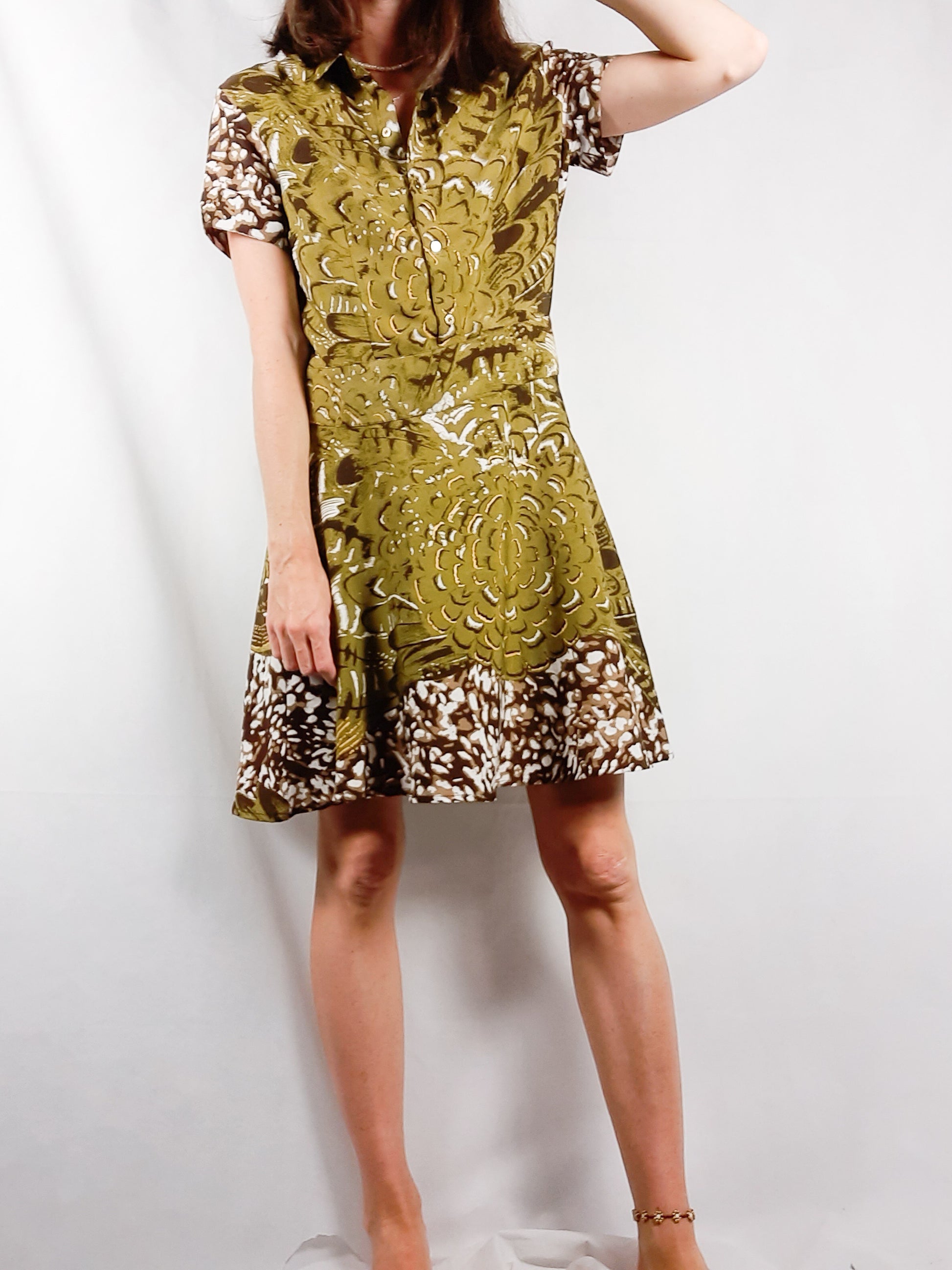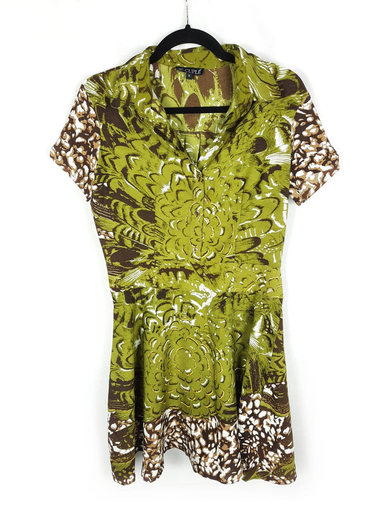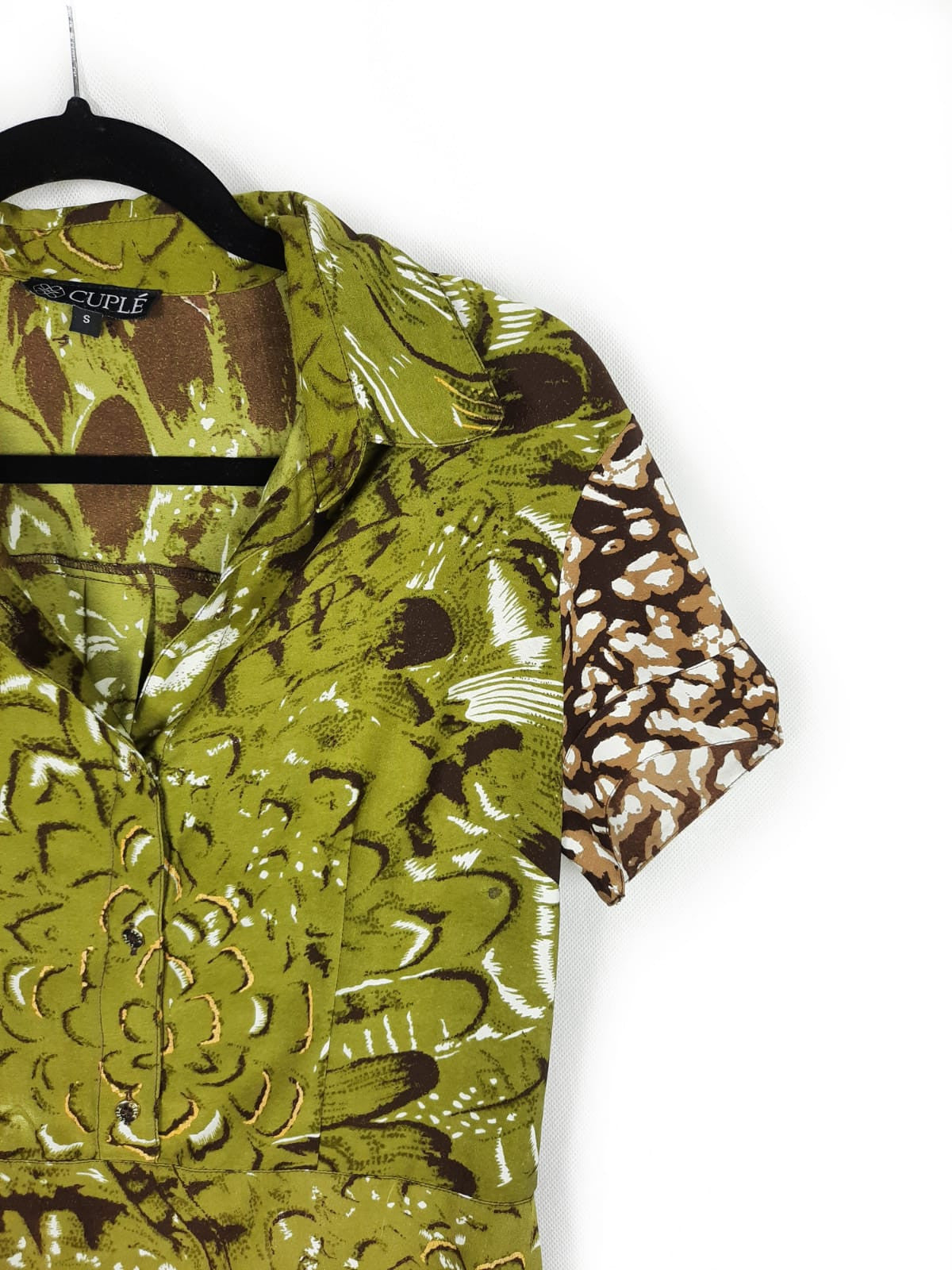 Vestido corto camisero con estampado animal print y flores. Es fluido y fino. No es elástico. De sisa a sisa 54 cm largo 93 cm