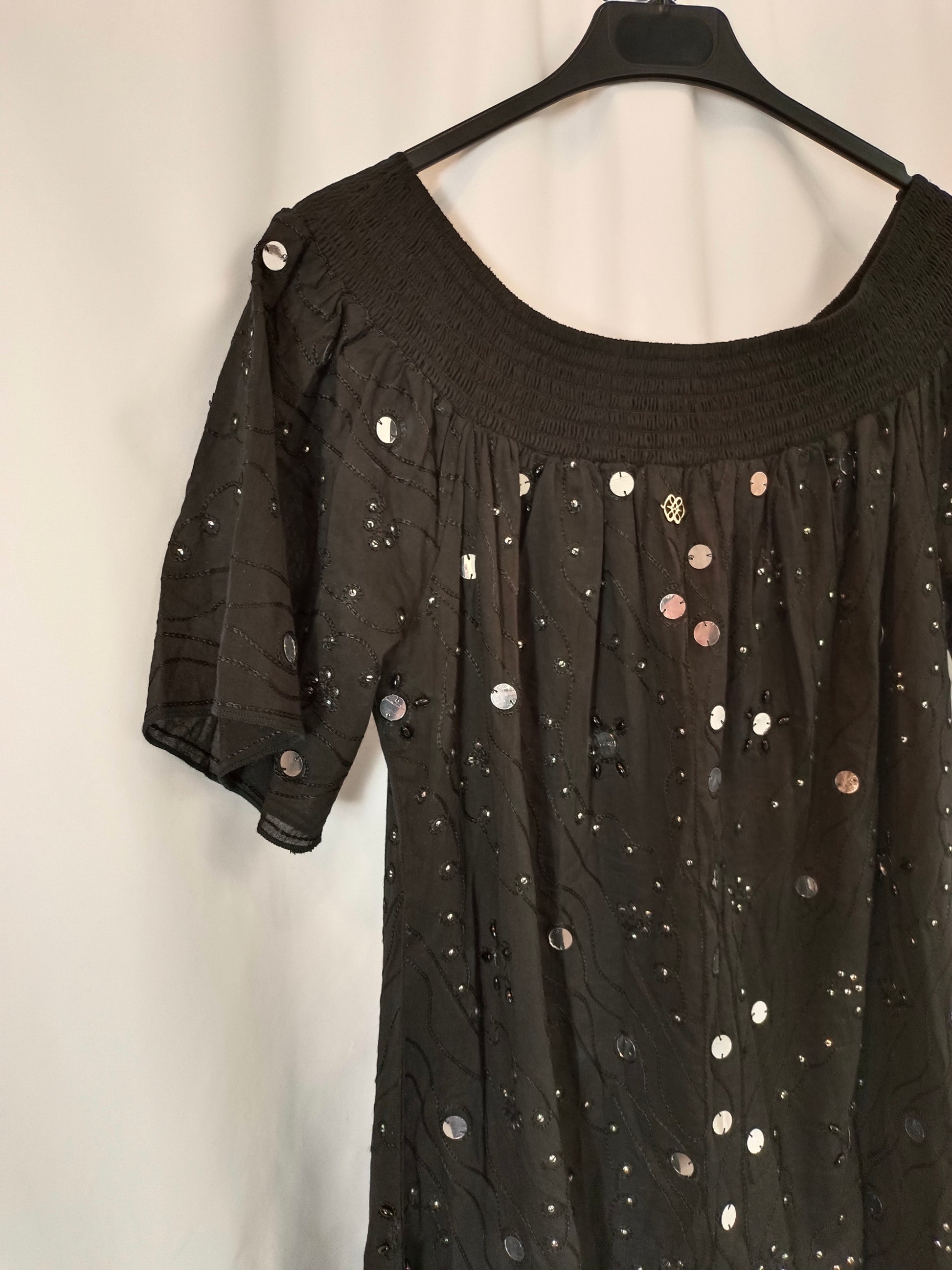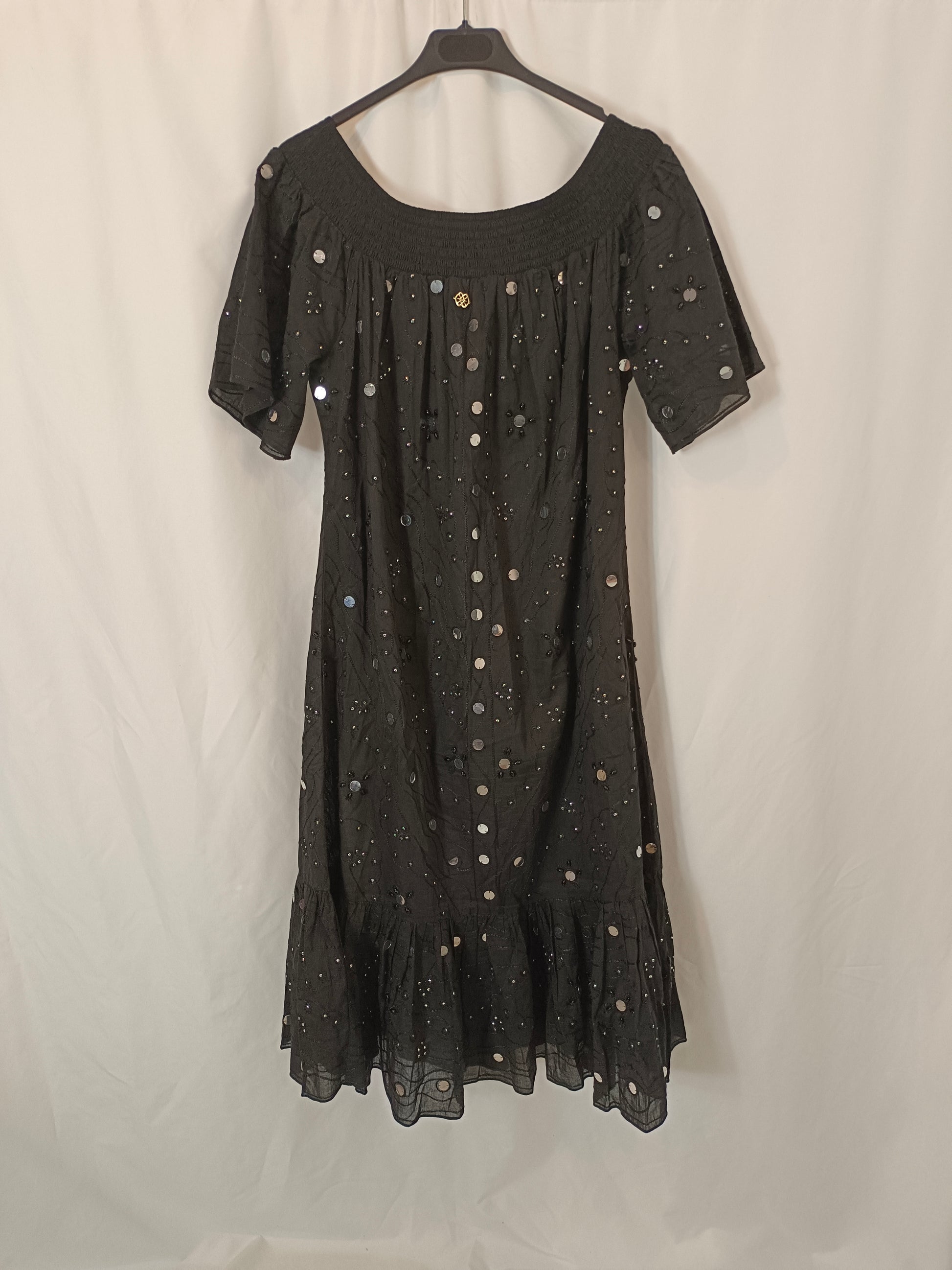 Vestido midi/largo negro con detalles bordados y con abalorios. Escote barco elástico