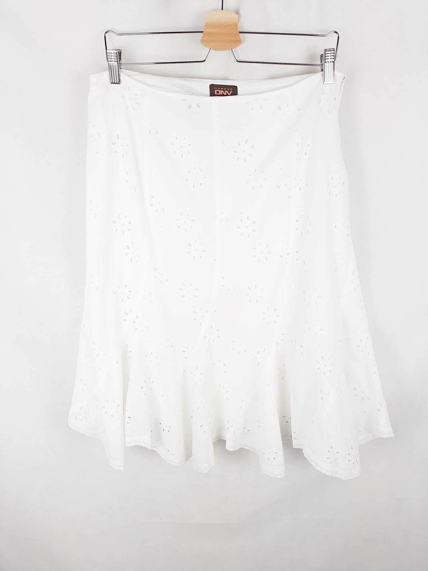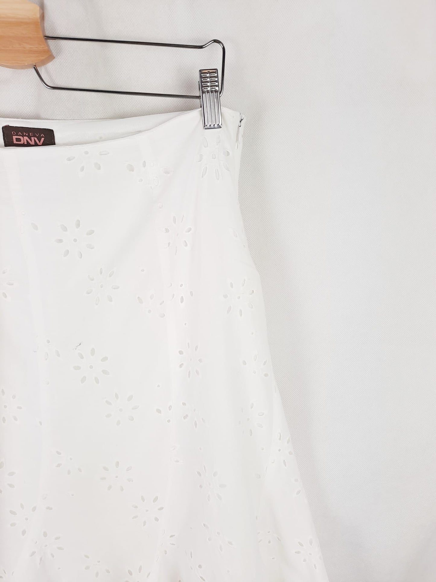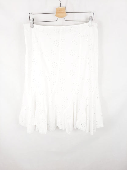 Falda midi blanca troquelada con vuelo. No es elástica. Cintura 44 cm larg9 72 cm