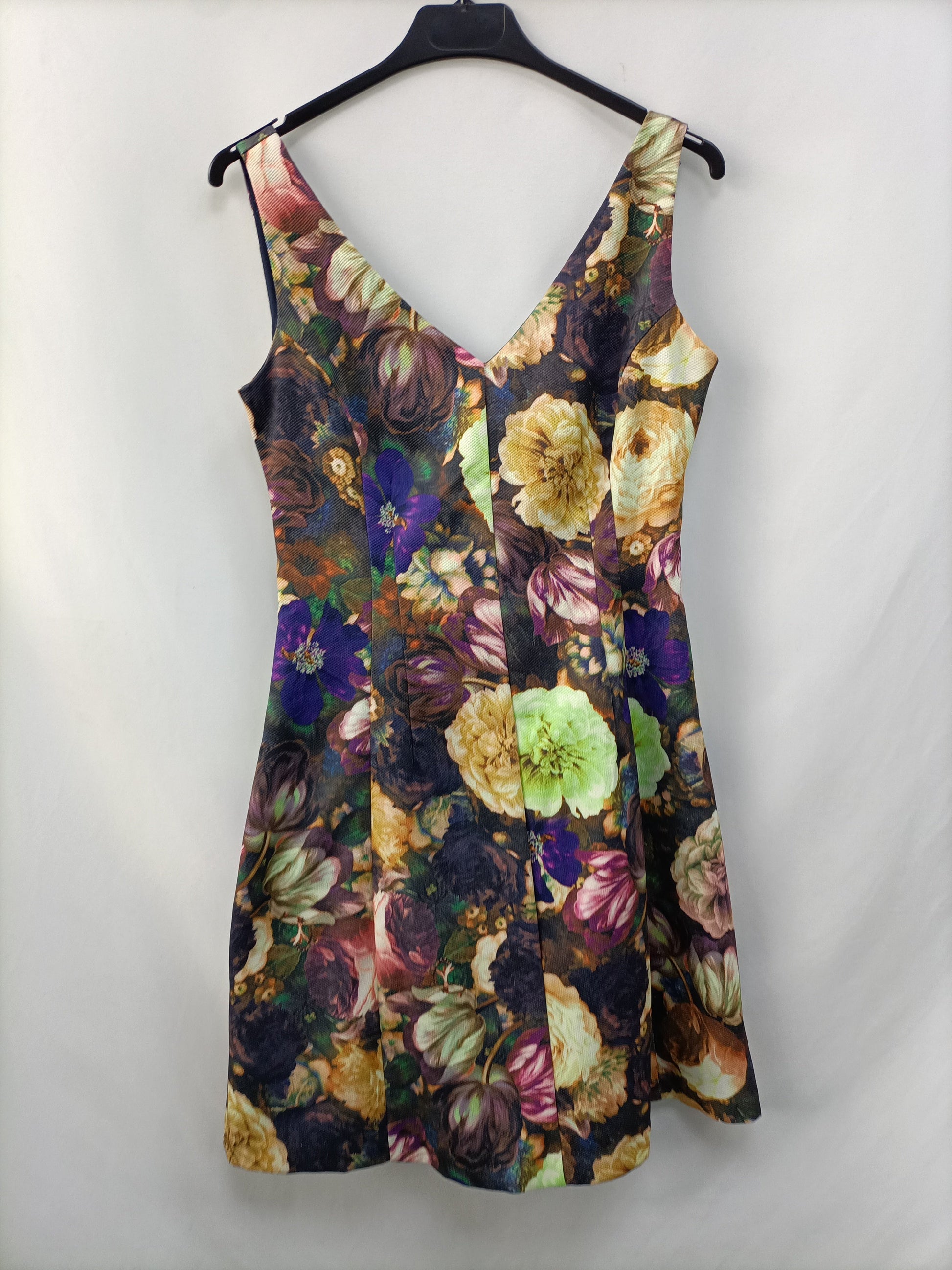 Vestido corto con estampado de flores y tejido con textura. no elástico. de sisa a sisa 34 cm largo 85cm