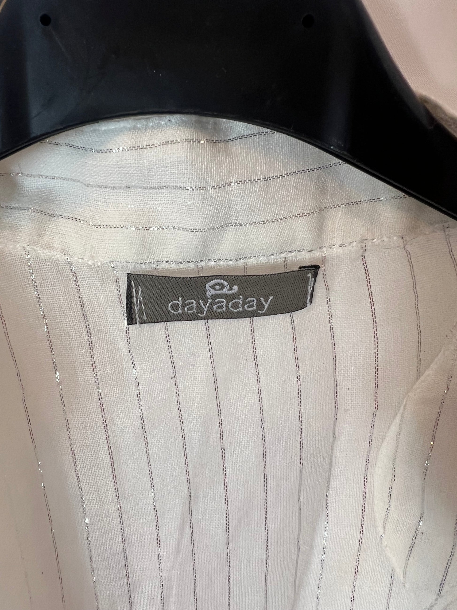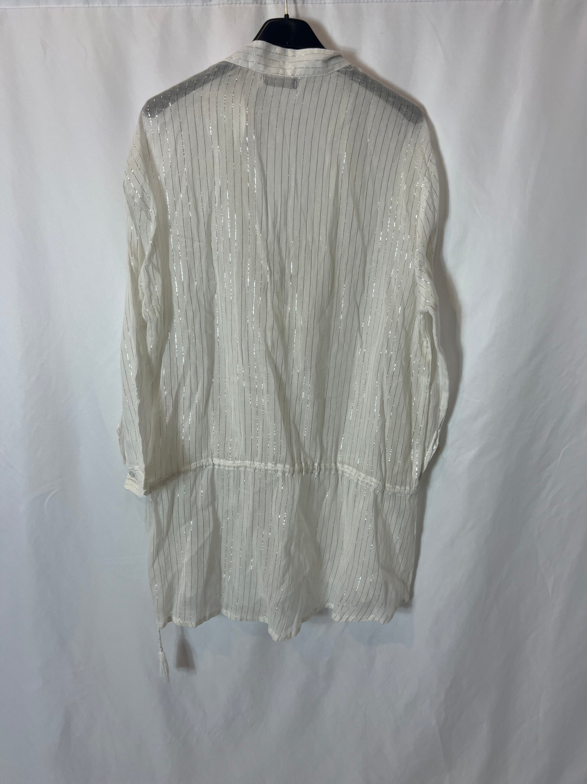 vestido corto blanco con rayas plateadas semitransparente. Playero. Ajustable en la cintura