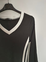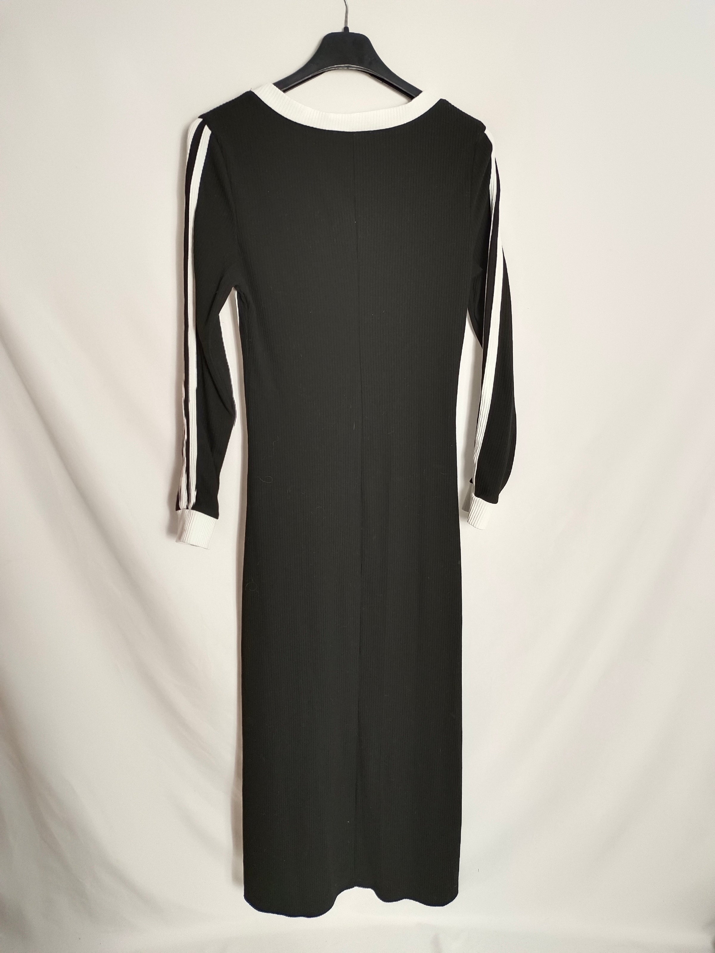 vestido largo de tejido de canalé elástico. detalle en blanco.