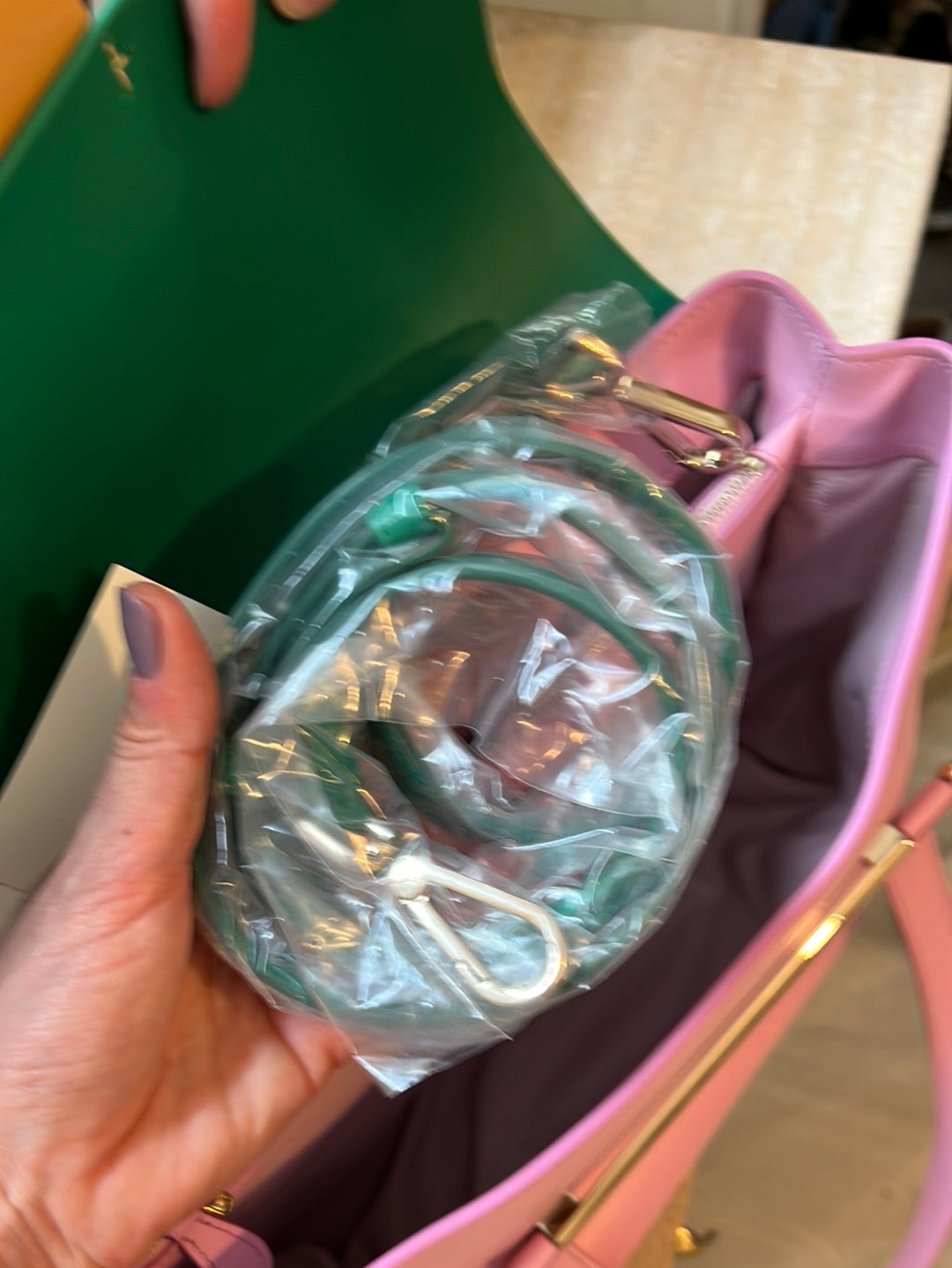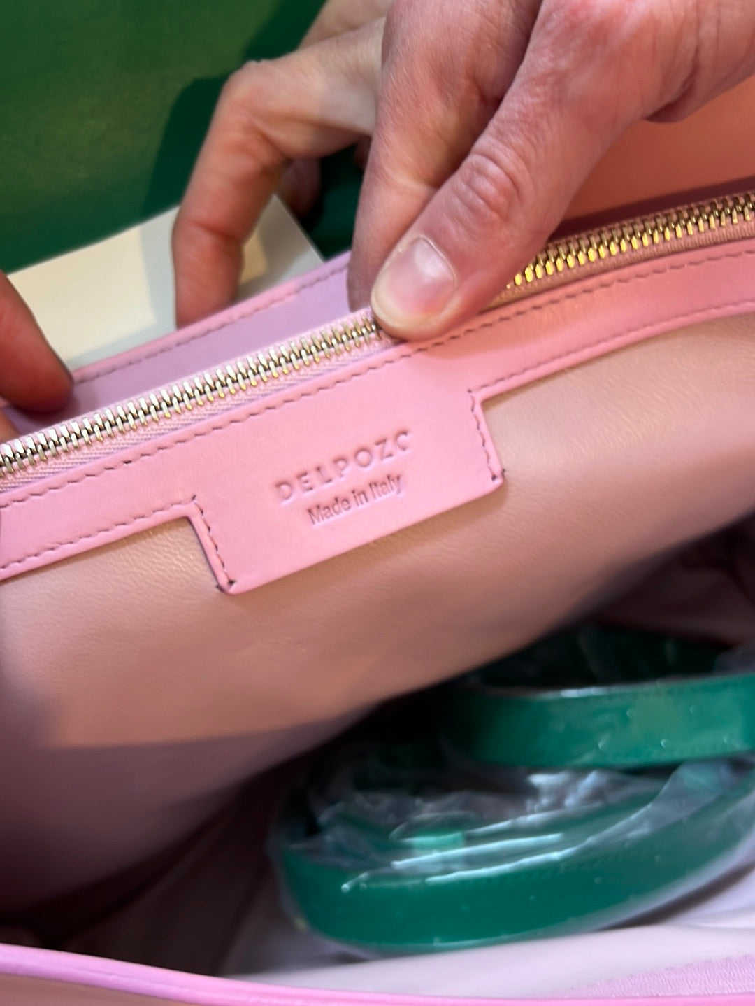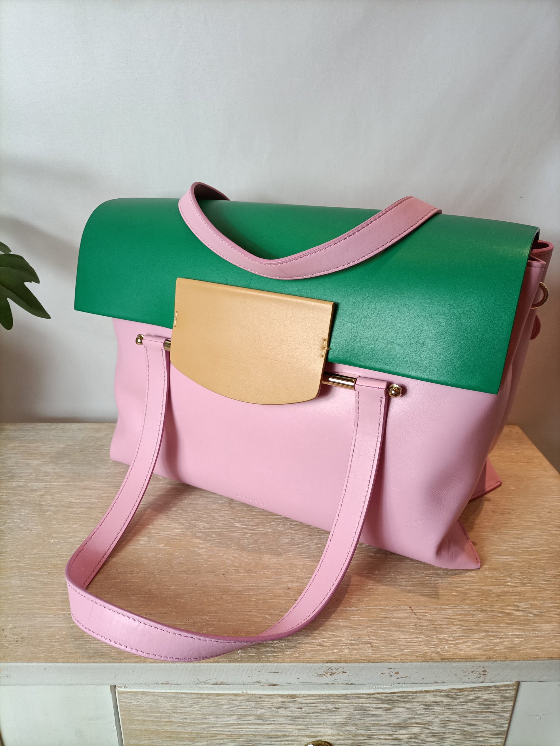 NUEVO CON ETIQUETA.bolso mediano de piel rosa y verde. Asa corta y larga. Ancho 35cm, alto 22cm